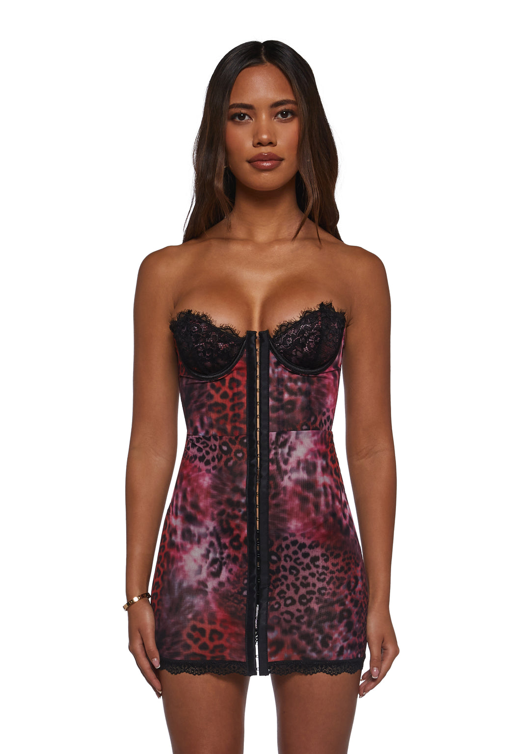 Hold all the attention when you wear this slip dress that has a stretchy mesh construction, an all-over leopard print, structured boning, an underwire lace bust, scalloped lace trim on the bust, a lace trimmed hem, and front hook and eye closures.