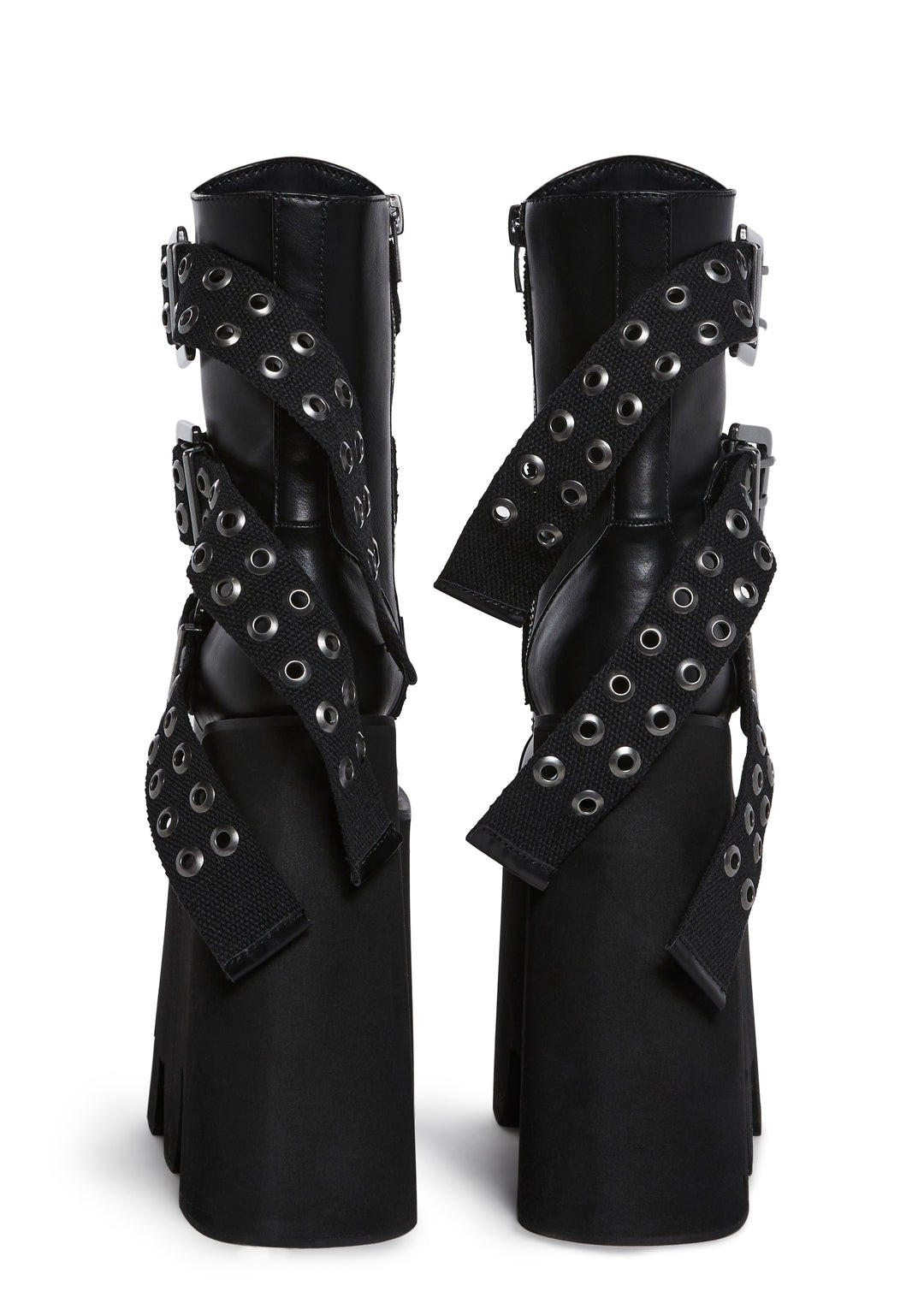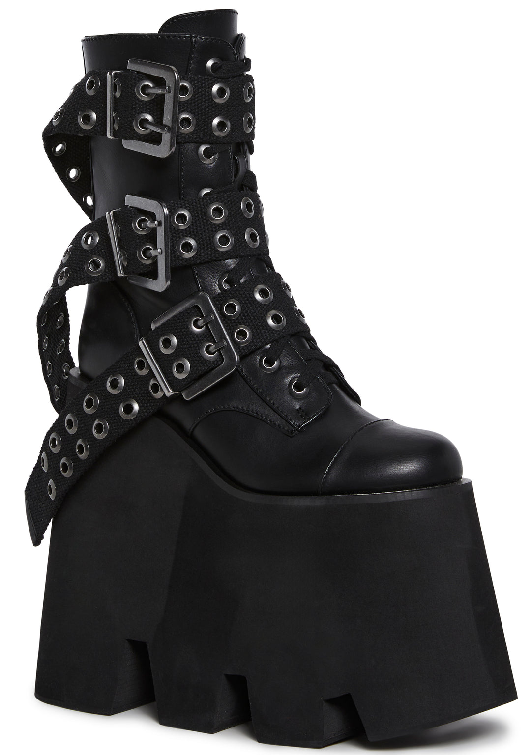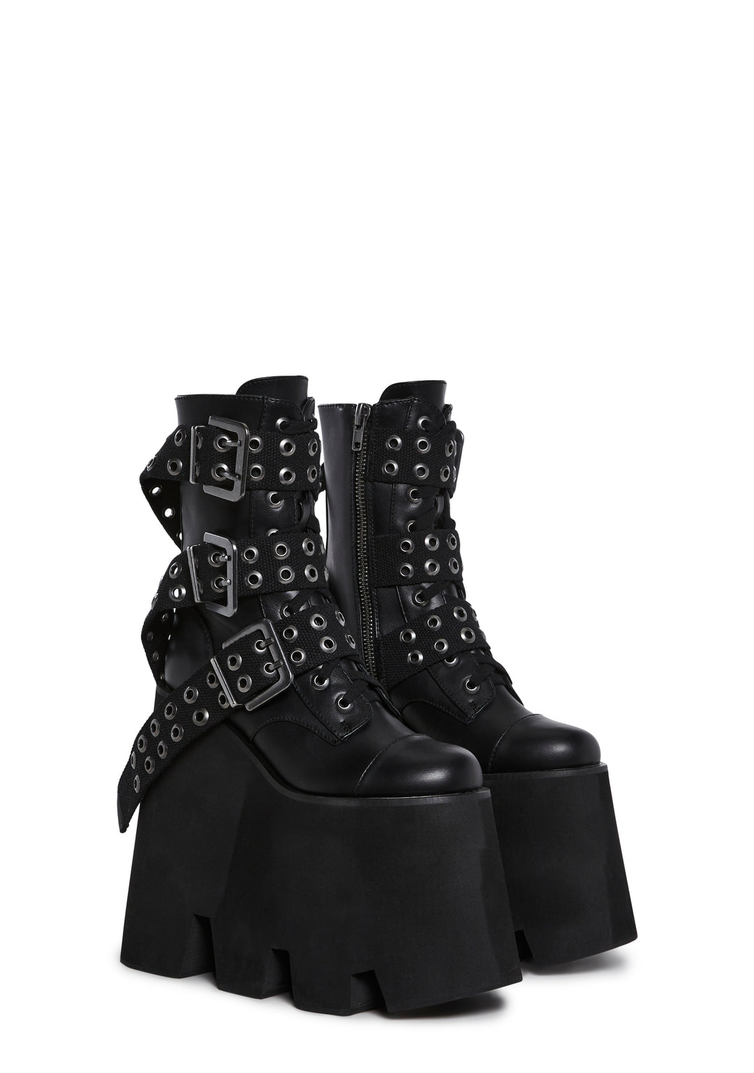 These shoes have a vegan leather construction, a round toe design, treaded mega platform soles, front lace-ups, triple grommet buckle details, and side zipper closures.
