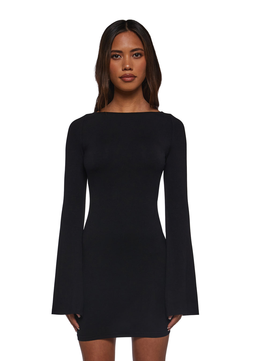 Own the night in this effortlessly chic black open-back mini dress! Featuring a flattering bodycon fit and elegant long bell sleeves, this dress combines sophistication with a daring edge. The bold open-back design with a strap and buckle accent makes it a true statement piece for parties or special occasions. Crafted from soft, stretchy fabric, it offers a sleek, comfortable fit that enhances your confidence and style.
