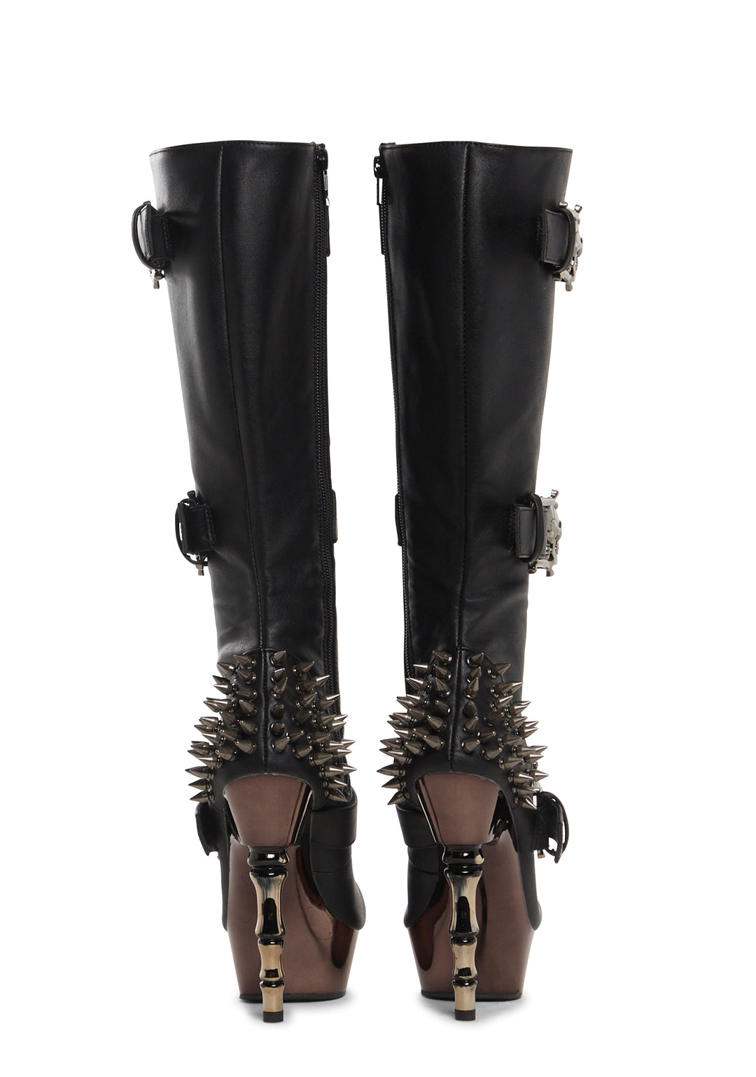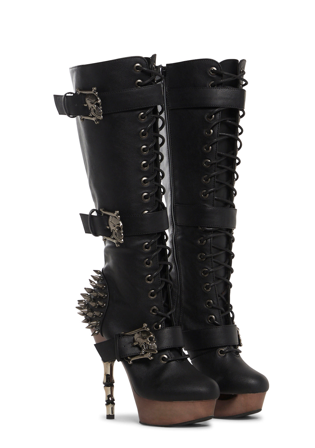 Make an impression with these shoes that have a matte vegan leather construction, spiked stud detailing on the back of the ankle, pewter chrome accents, platform soles, ??finger bone?? stiletto heels, front lace-ups, skull shaped buckle fasteners, and side zipper closures.