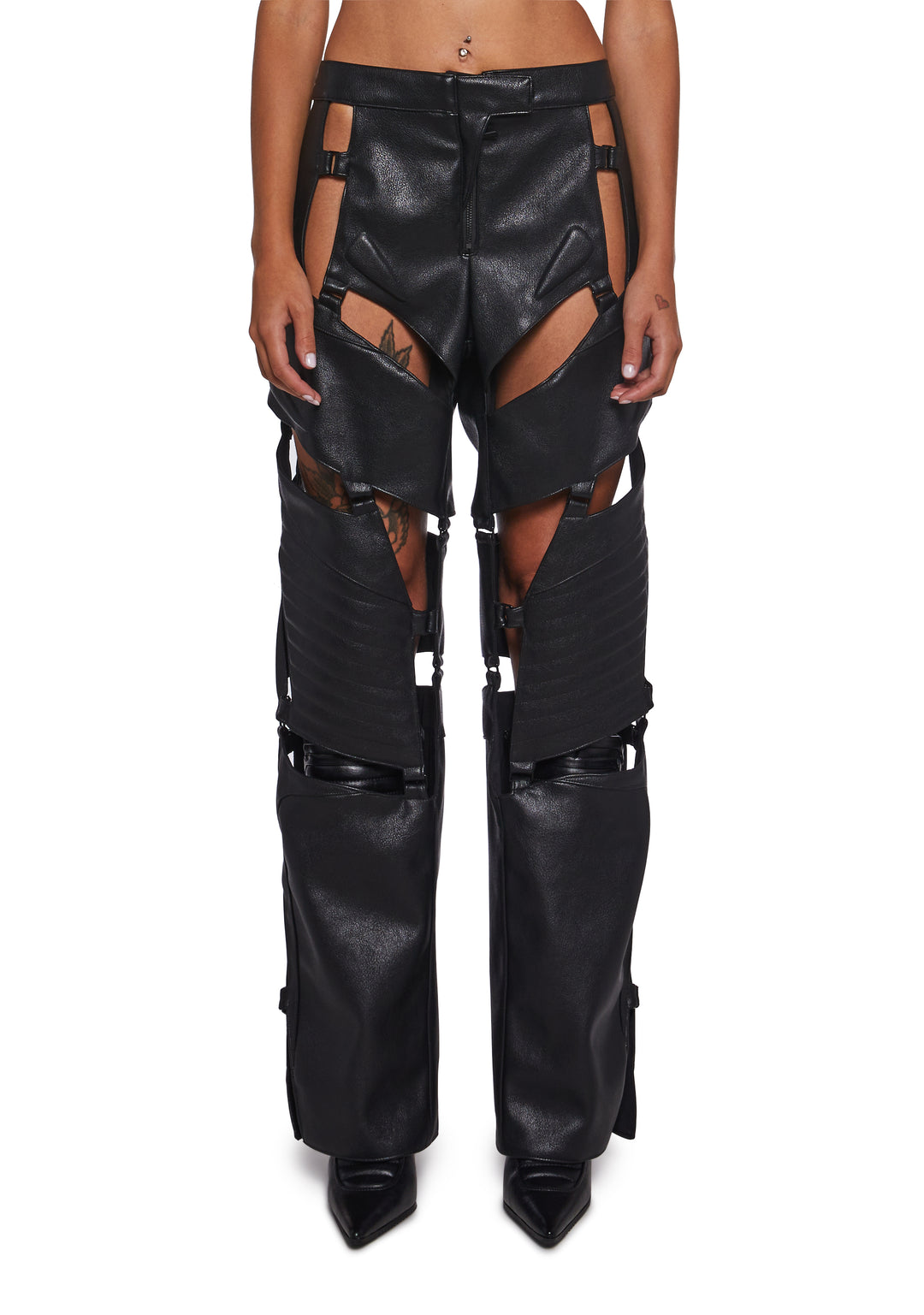 These pants have a vegan leather construction, reinforced paneling,floating cut-outs with silver metal hardware, quilted knee padding, 3D padded elements inspired by motocross protection wear, and a hidden snap button and zipper closure on the front.