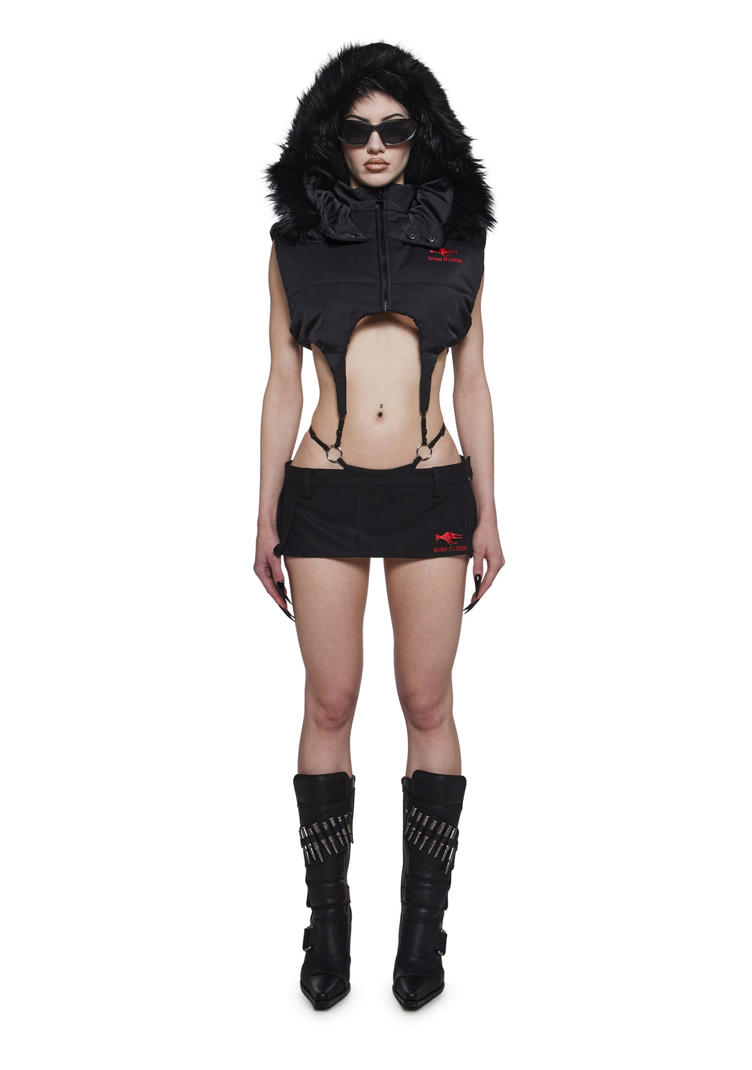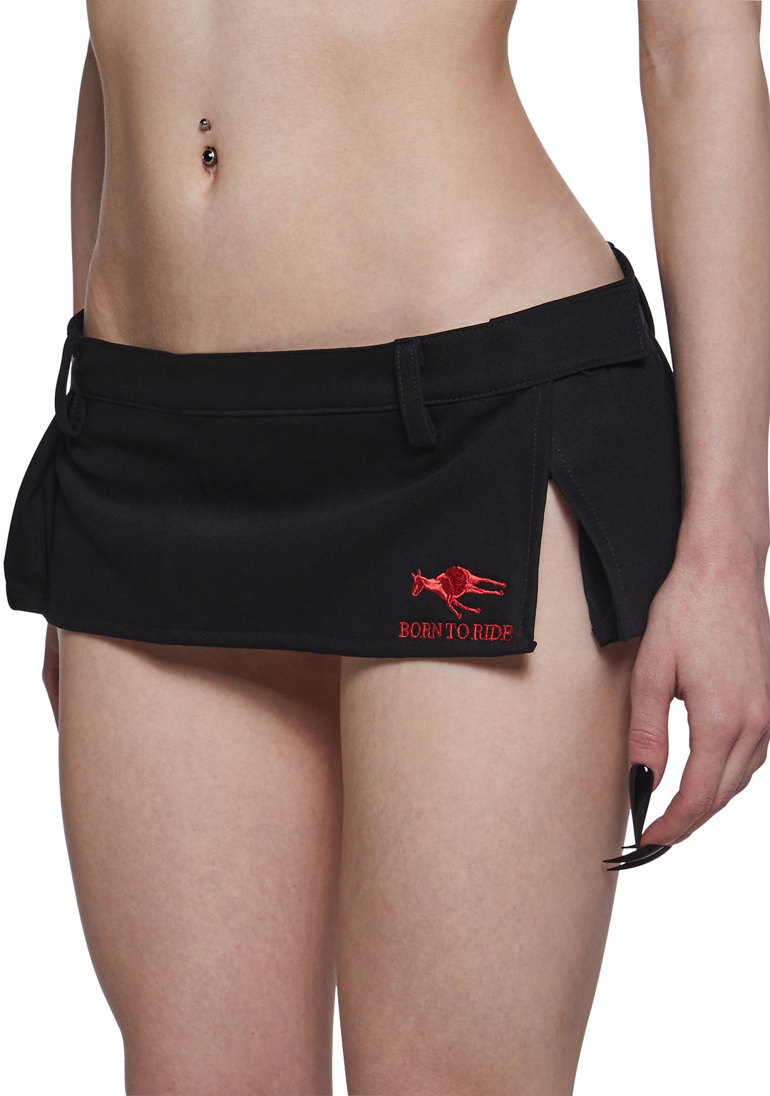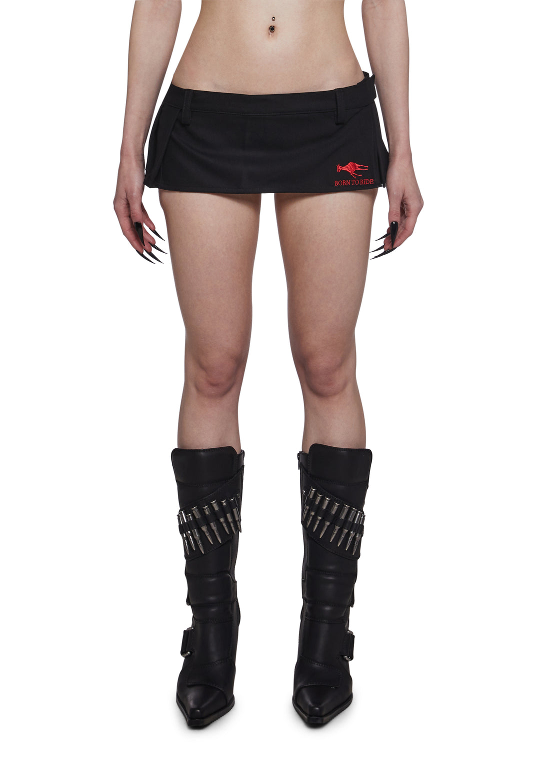 This Ultra-mini pleated skirt has a low-rise waistline with belt loops,deconstructed tailoring , and black and white colorway featuring Born to Ride thread embroidery.