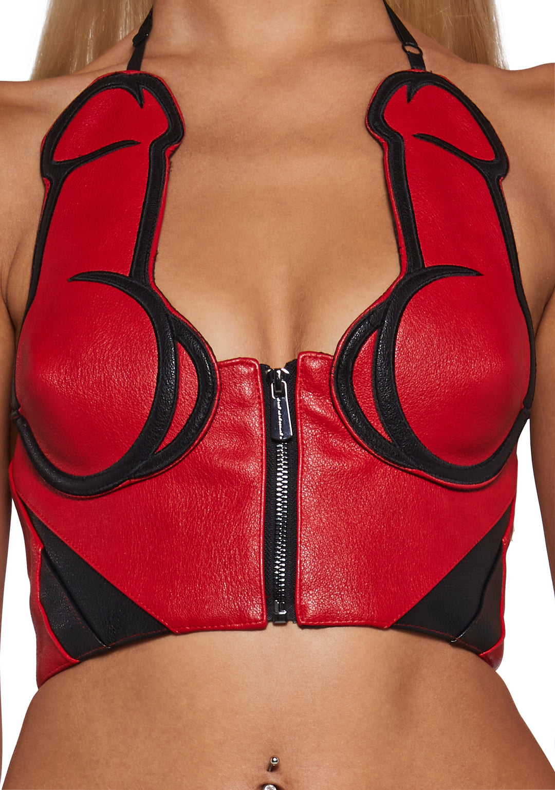 This double dick bustier top has a vegan leather construction, an adjustable halter neckline strap, a front zip closure, and lace-up details on the back.
