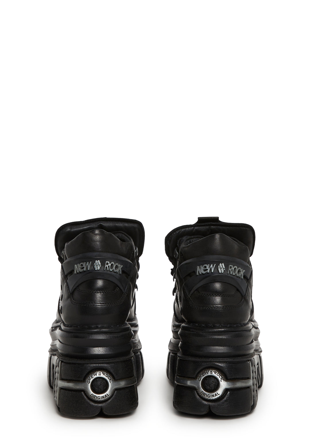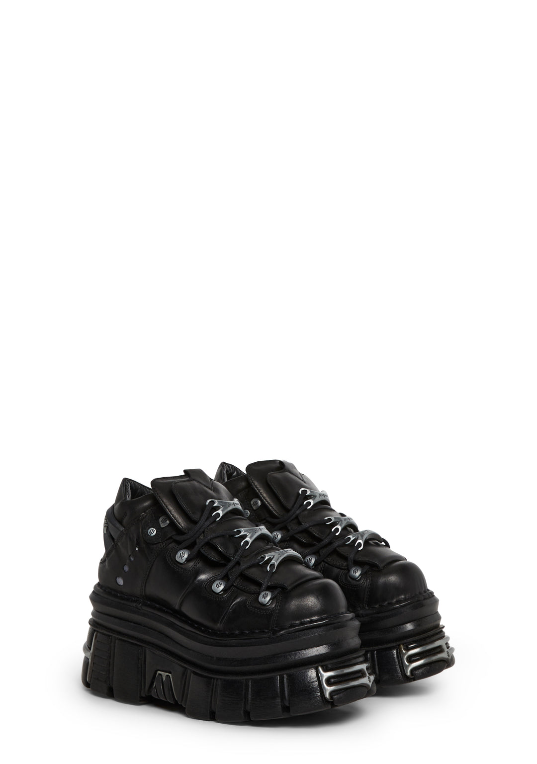 These platform sneakers have a genuine leather construction, metal hardware, platform soles, and adjustable front lace-up closures.