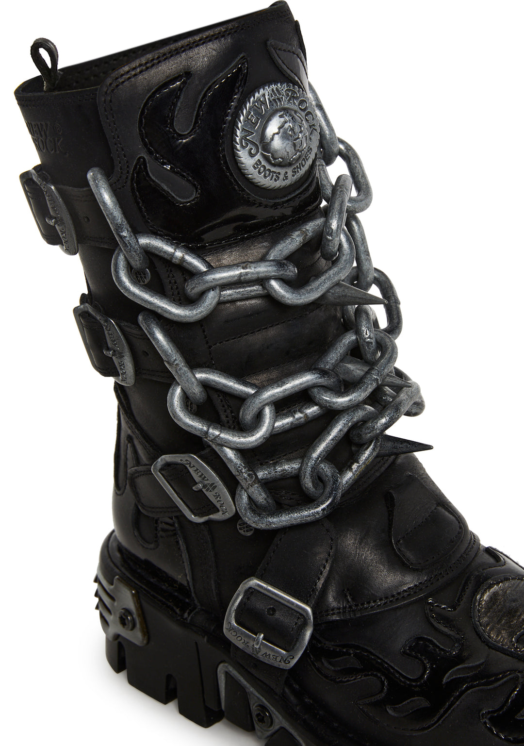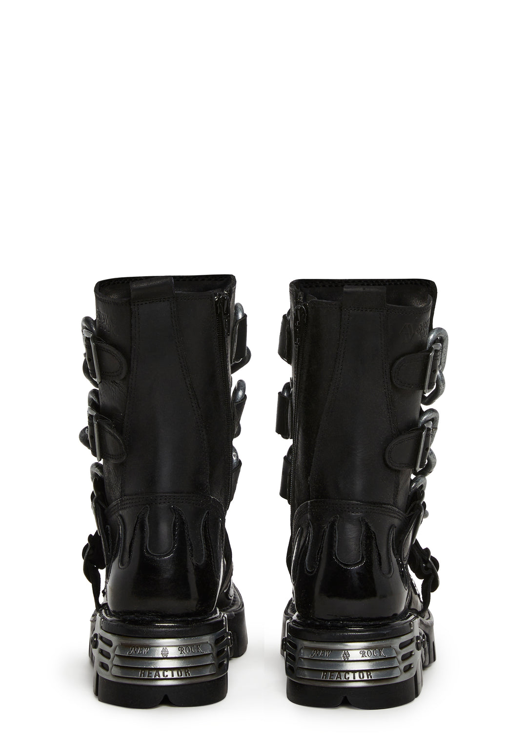 These boots have a genuine leather construction, a spiked chain link design, adjustable buckle closures, metal hardware, vinyl flame and skull appliques on the uppers, tongue, and back, and side zipper closures.