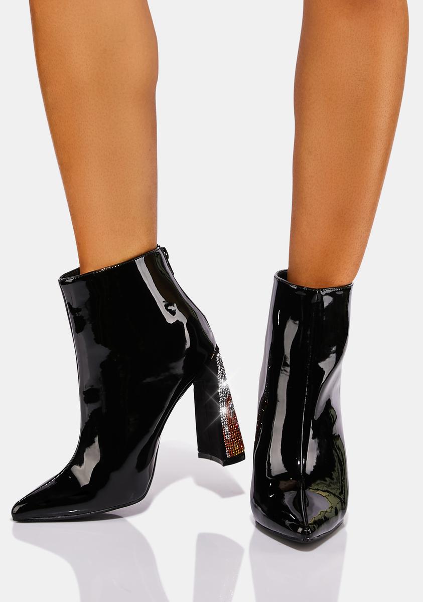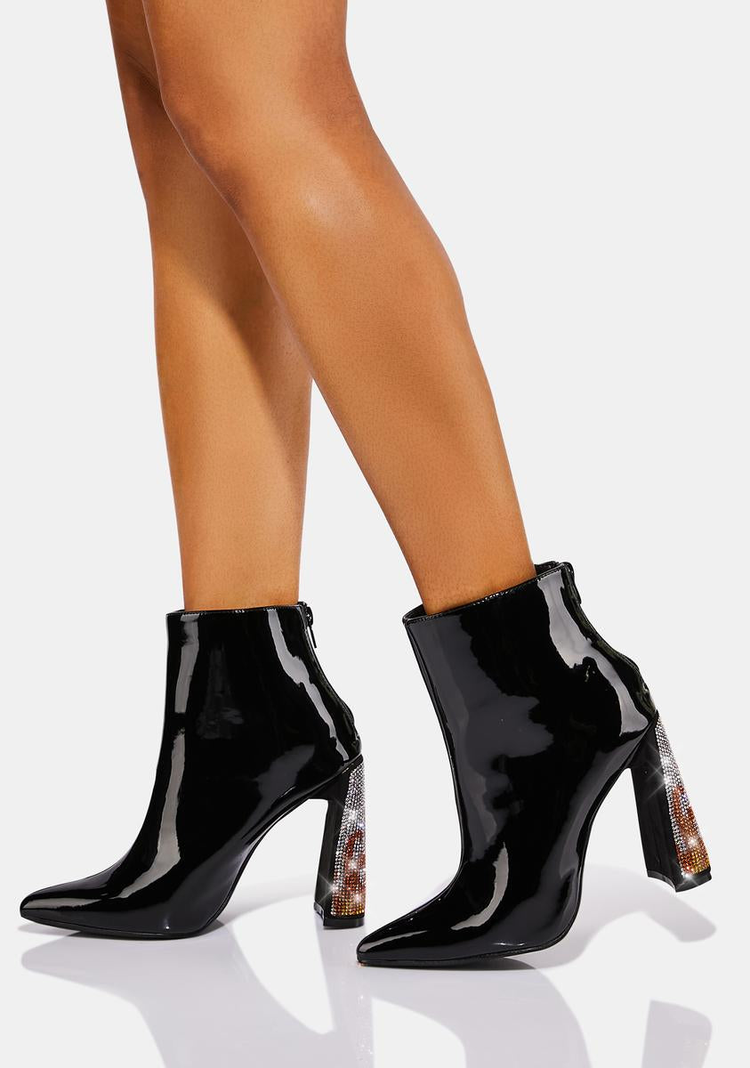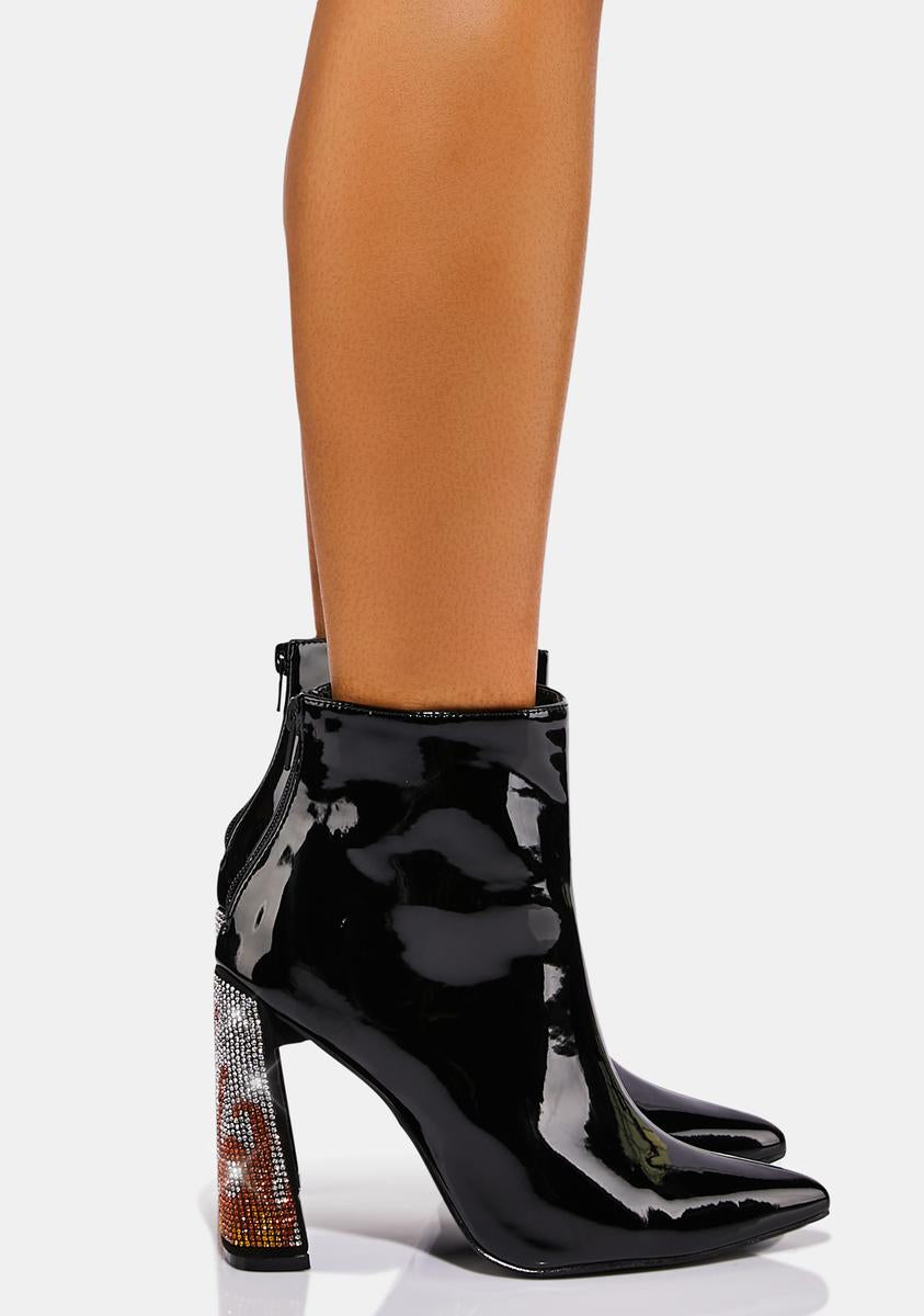 Patent Vegan Leather Rhinestone Heel Ankle Boots Black