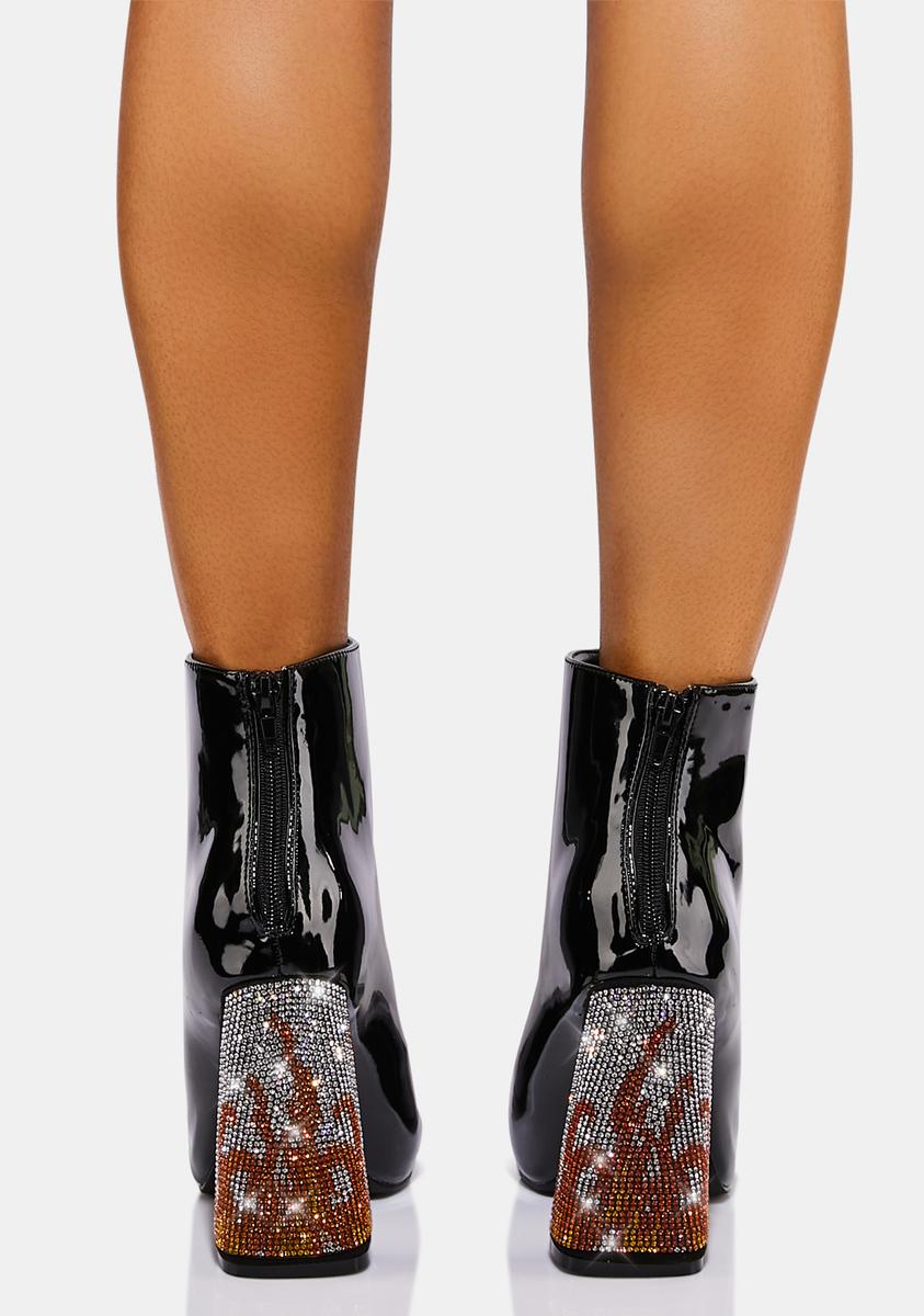 have a patent vegan leather construction, a low ankle rise, a pointed toe design, a chunky rhinestone heel with a flame design, and a zipper closure at the heel.