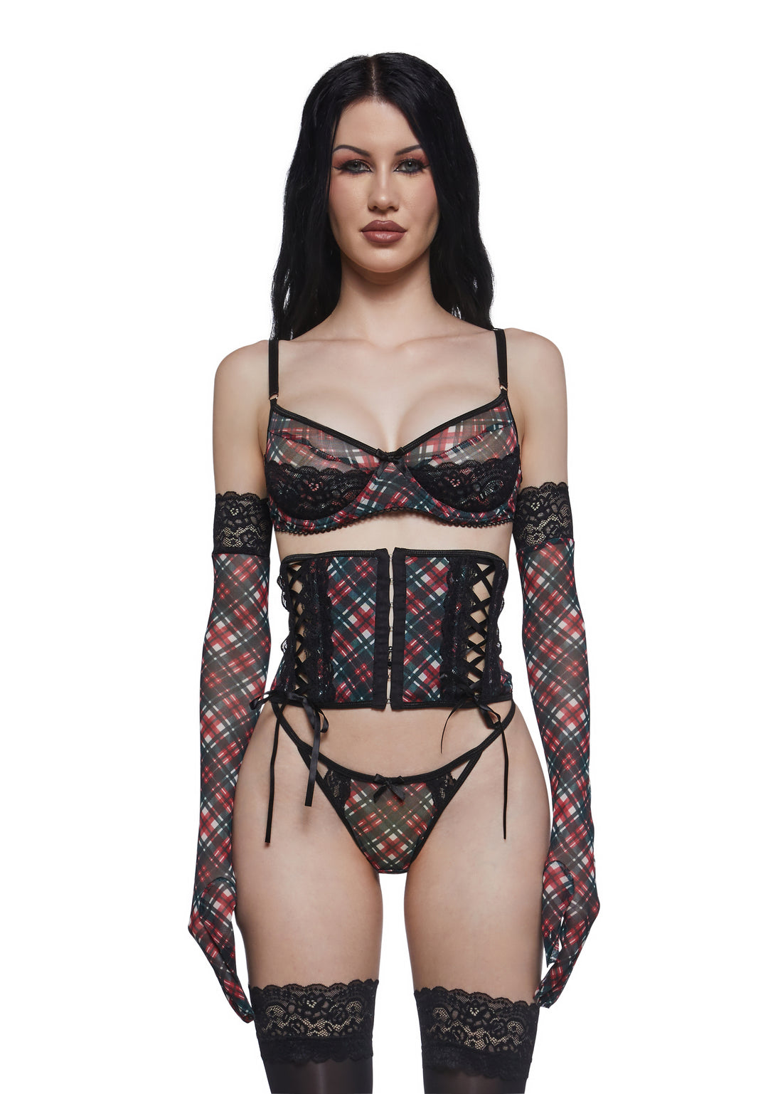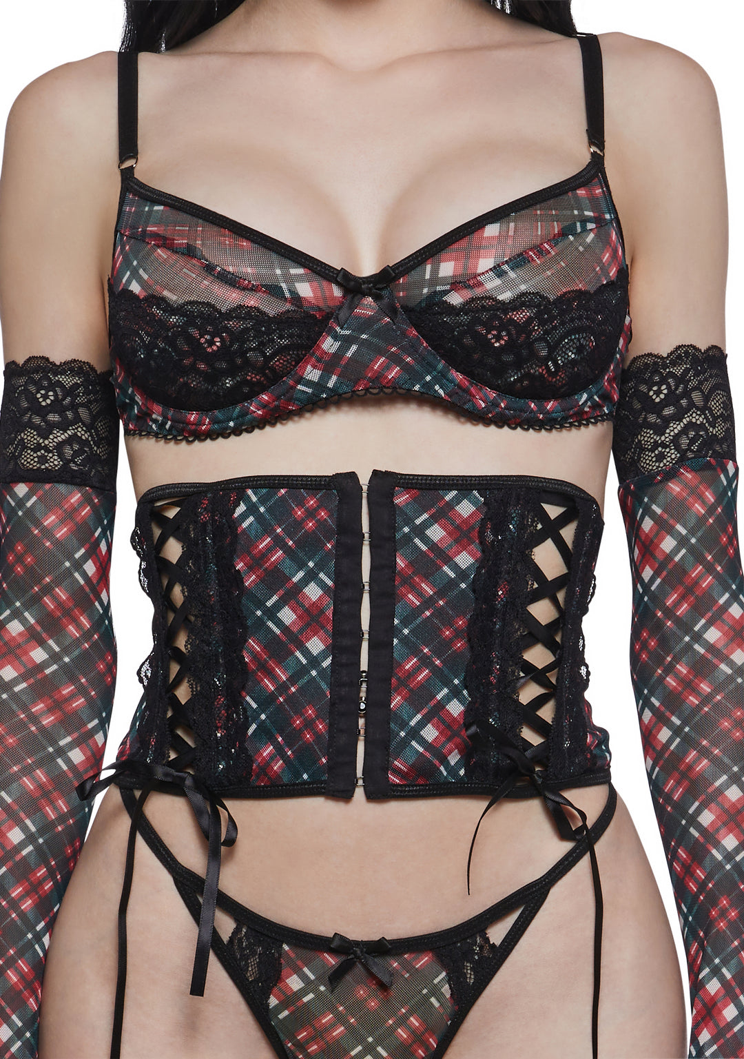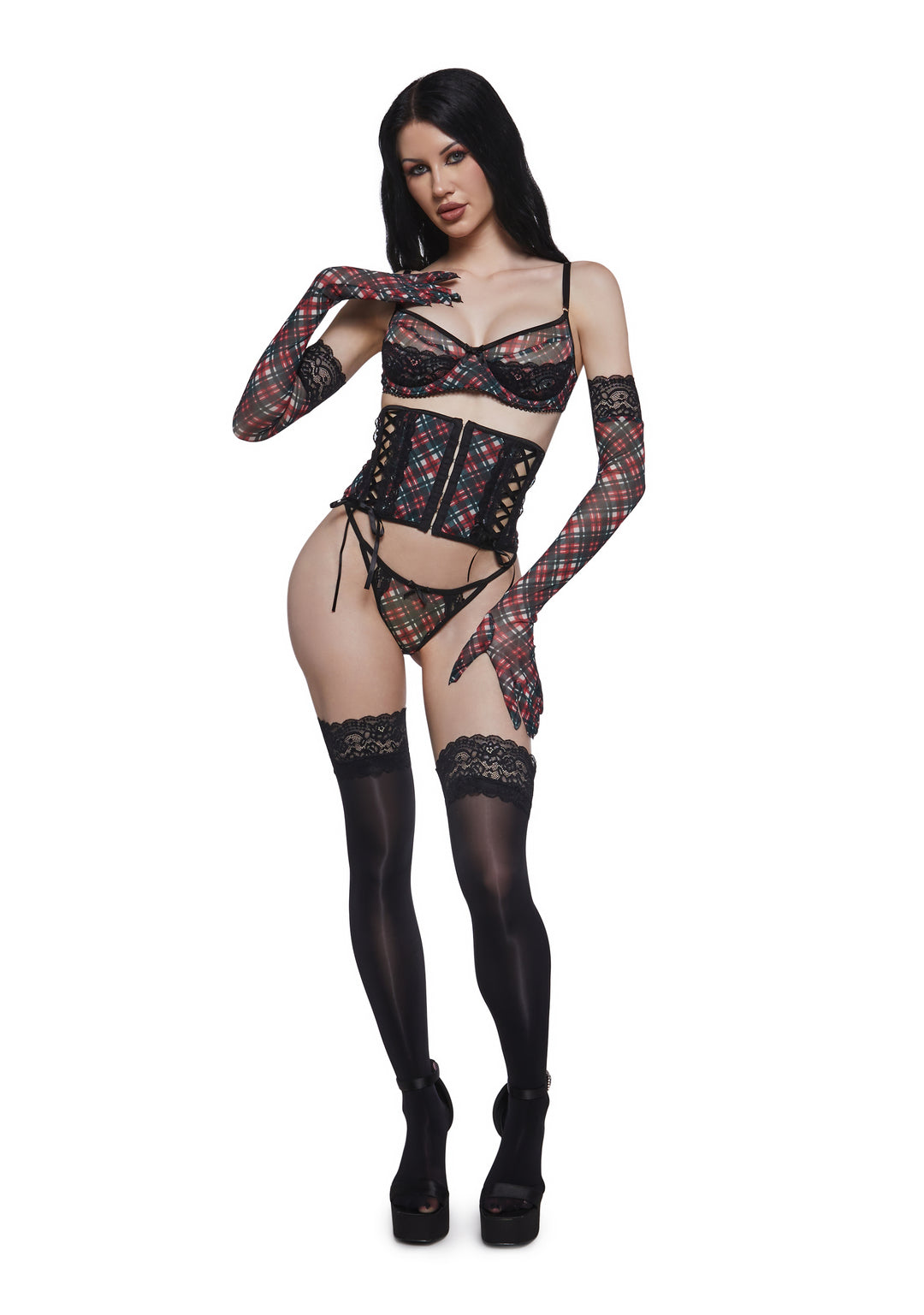Look stunning in this lingerie set that includes a stretchy mesh bra top that has an all over plaid construction, lace details, an underwire bust, adjustable shoulder straps, back hook and eye closures, matching corset with lace up straps on the sides, front and hook and eye closures, arm length gloves, and thong panty.