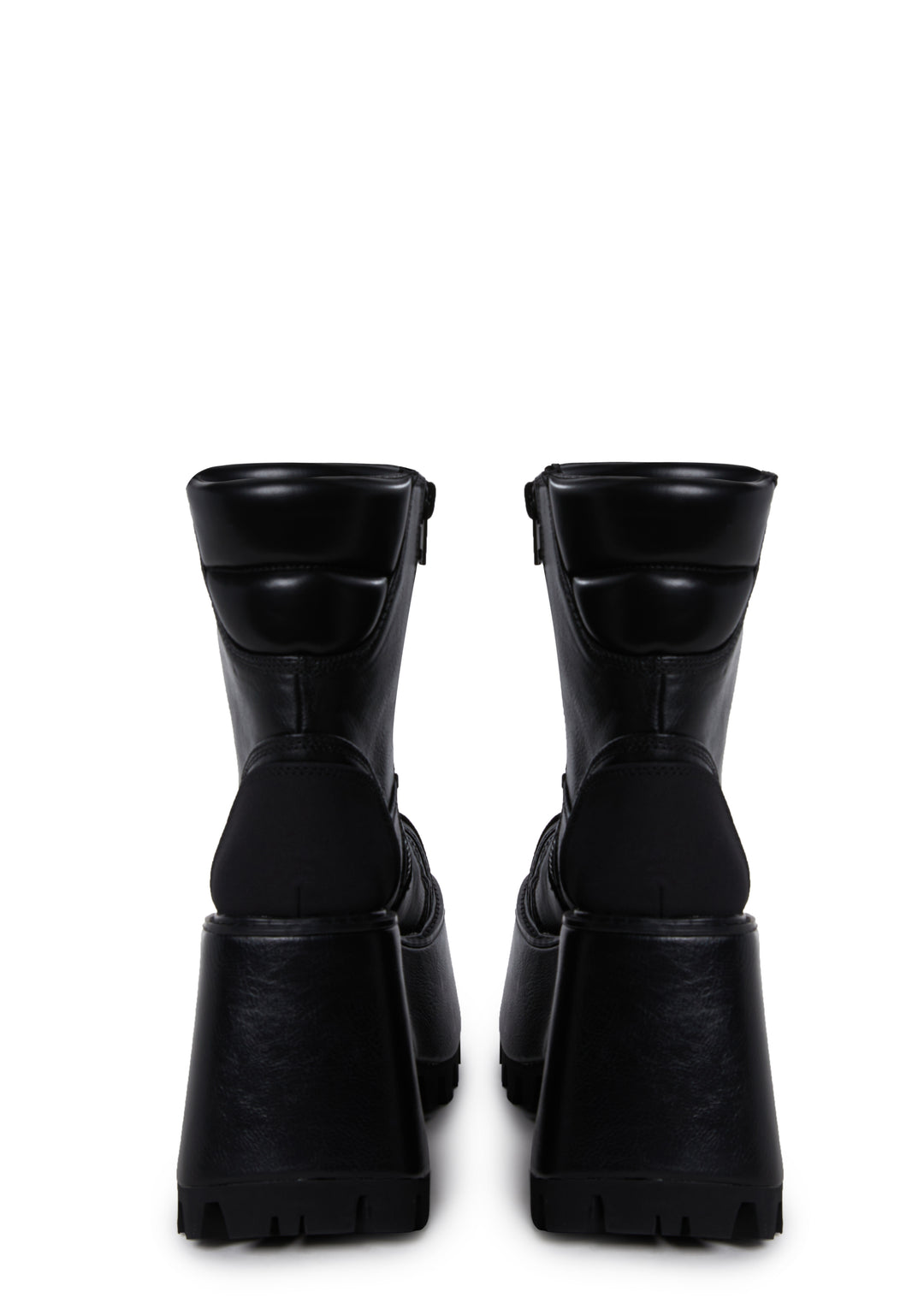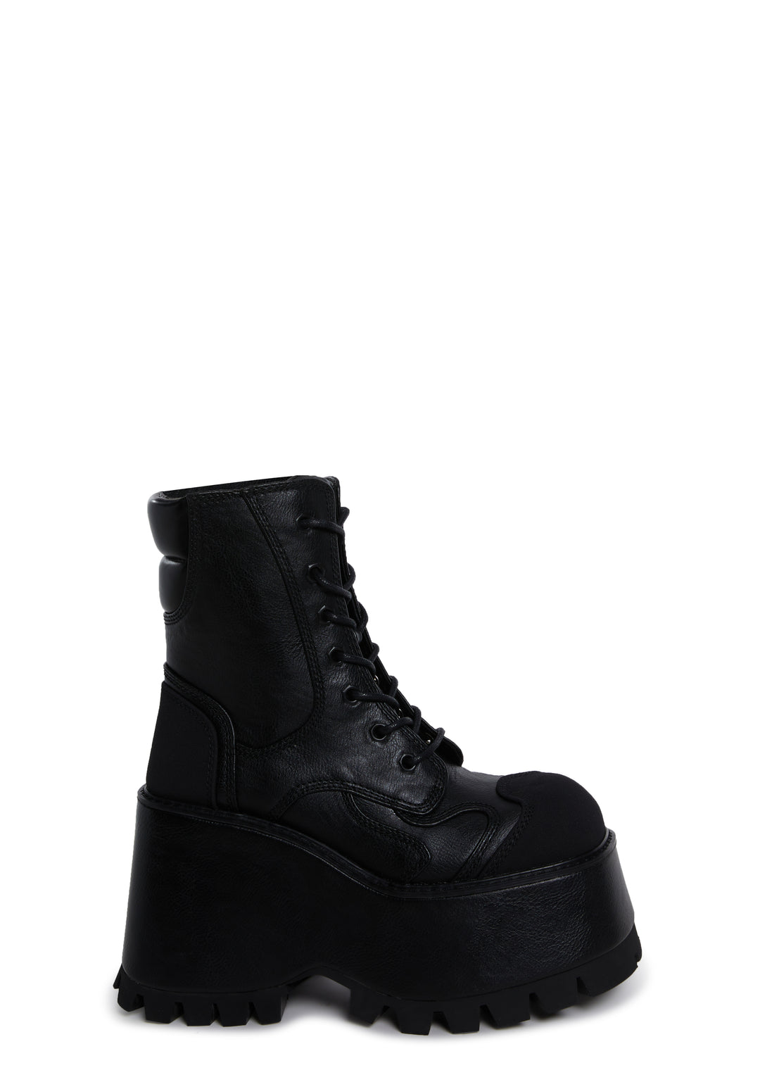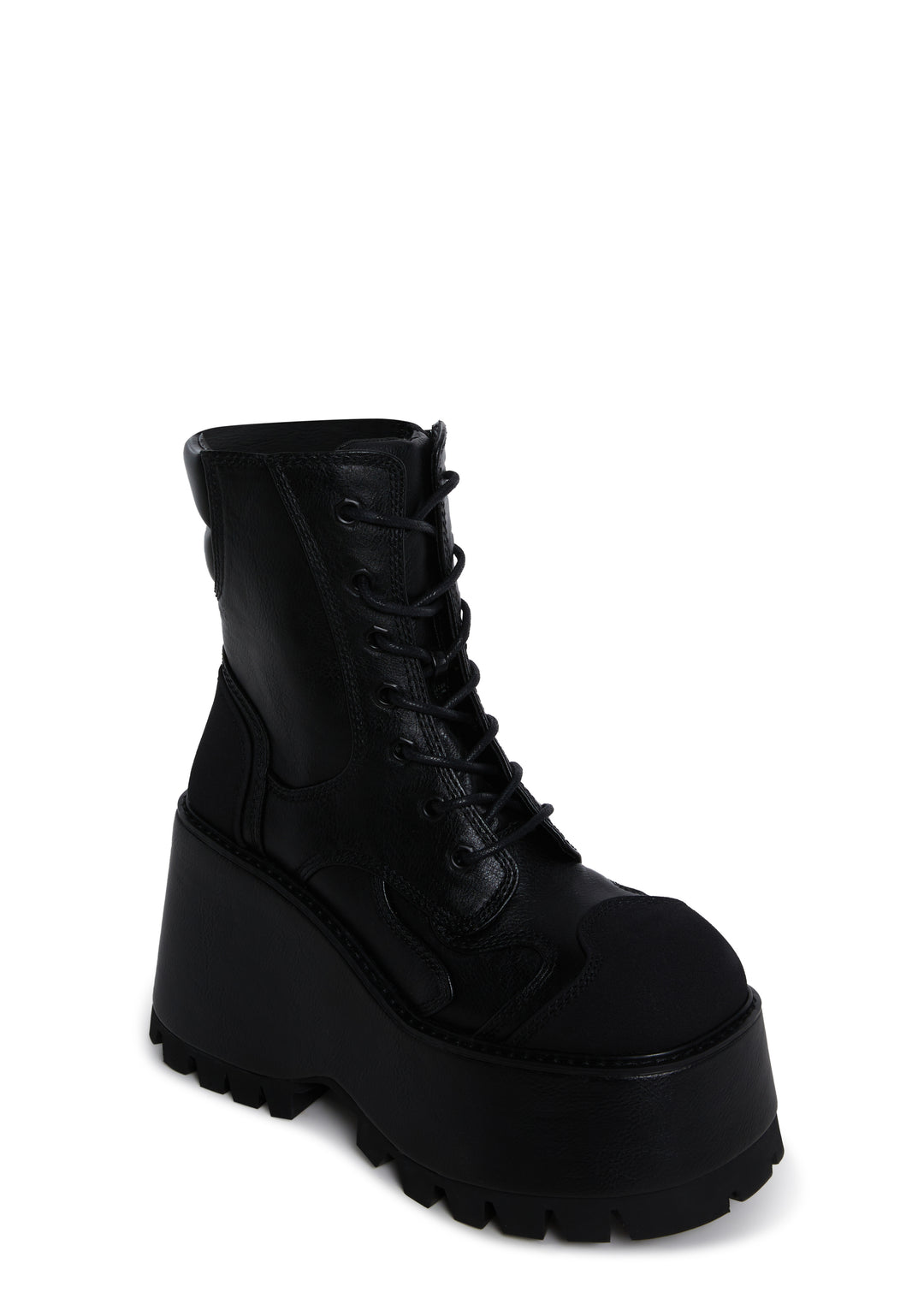 These boots have a vegan leather and faux suede construction, and front lace-up closures.