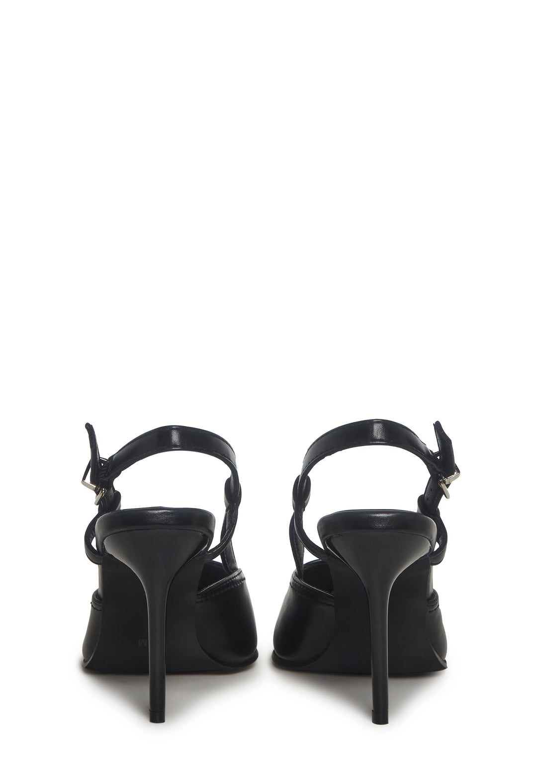 These heels have a vegan leather construction, a pointed toe design, rhinestone Playboy bunny charms on the uppers, stiletto heels, and adjustable buckle closures.