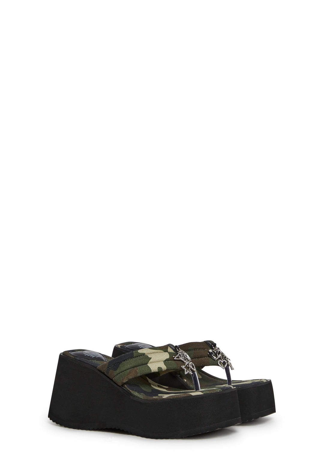 These platform thong sandals have an all over camo print on the uppers and heart, star, martini glass rhinestone and bunny logo charms.