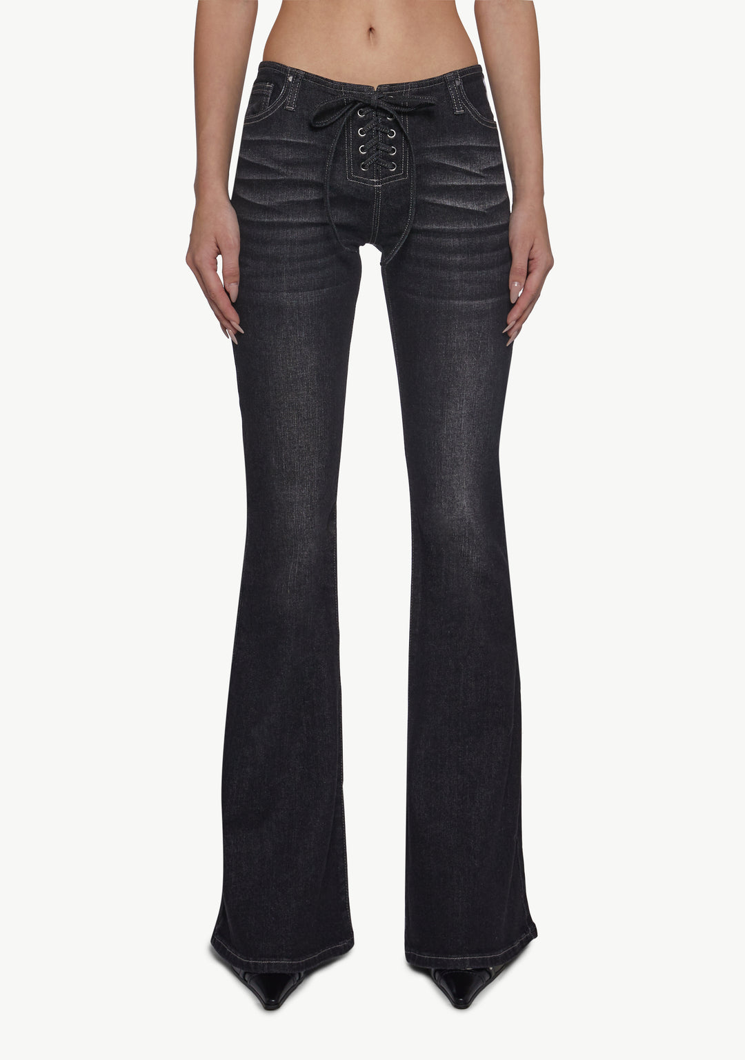 These jeans have a washed denim construction, front pockets, Playboy logo rhinestone encrusted on the back, and front lace up closures.
