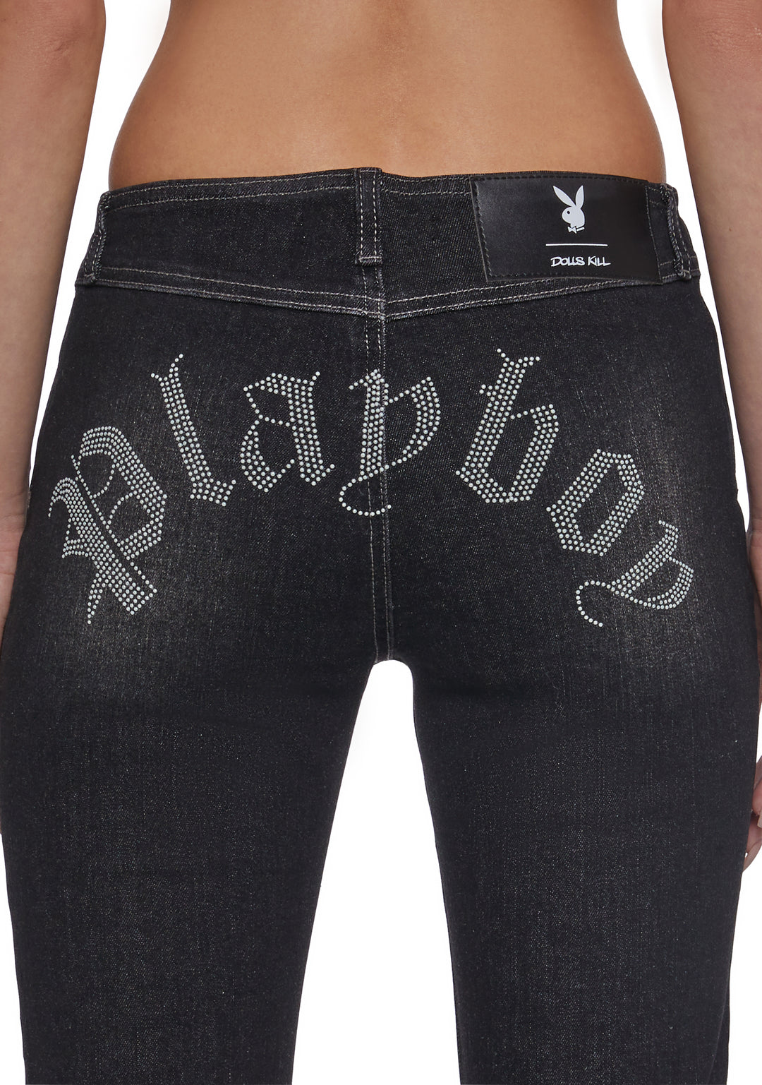 Playboy by Dolls Kill Womens Denim Rhinestone Boot Cut Jeans – Blue