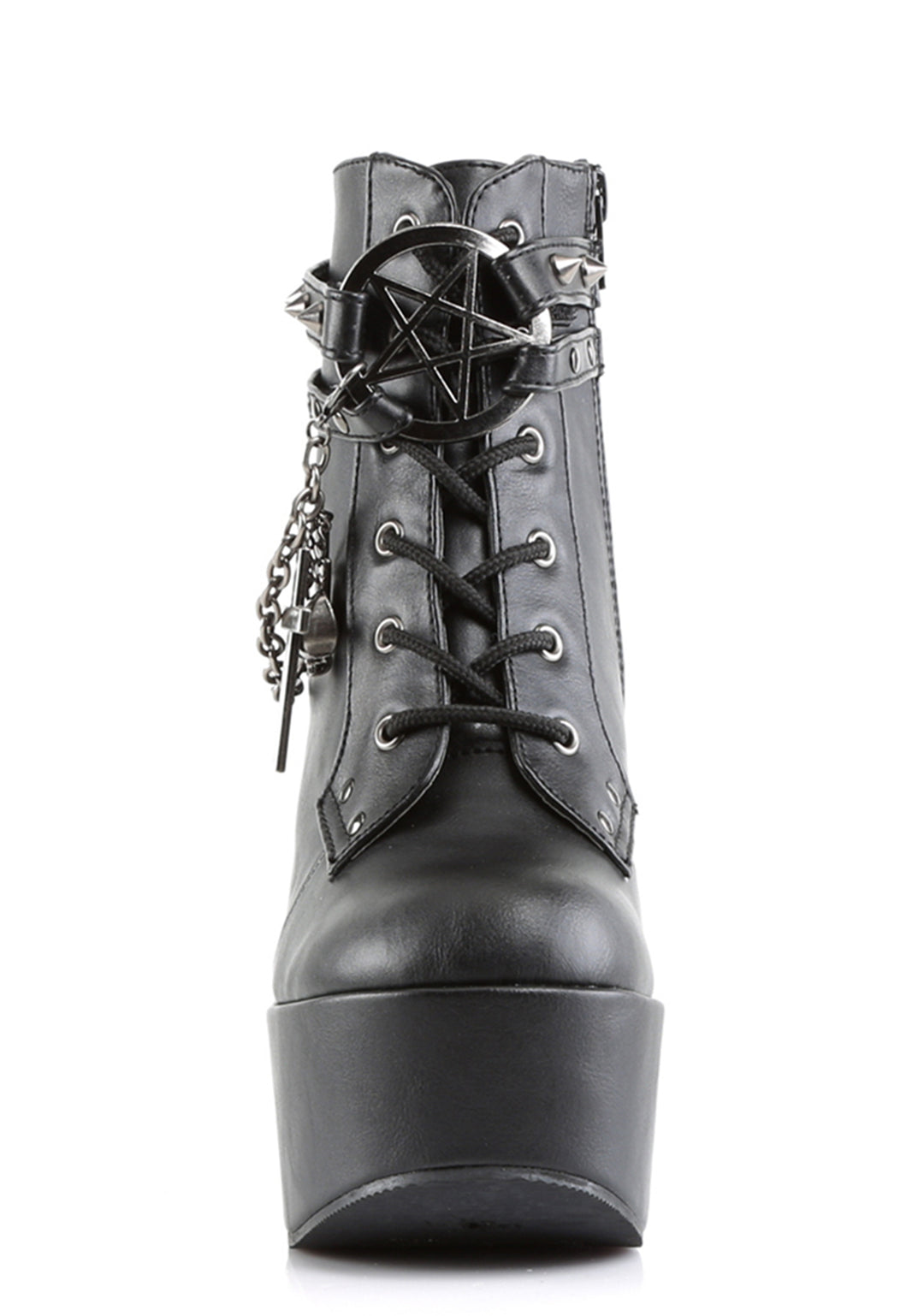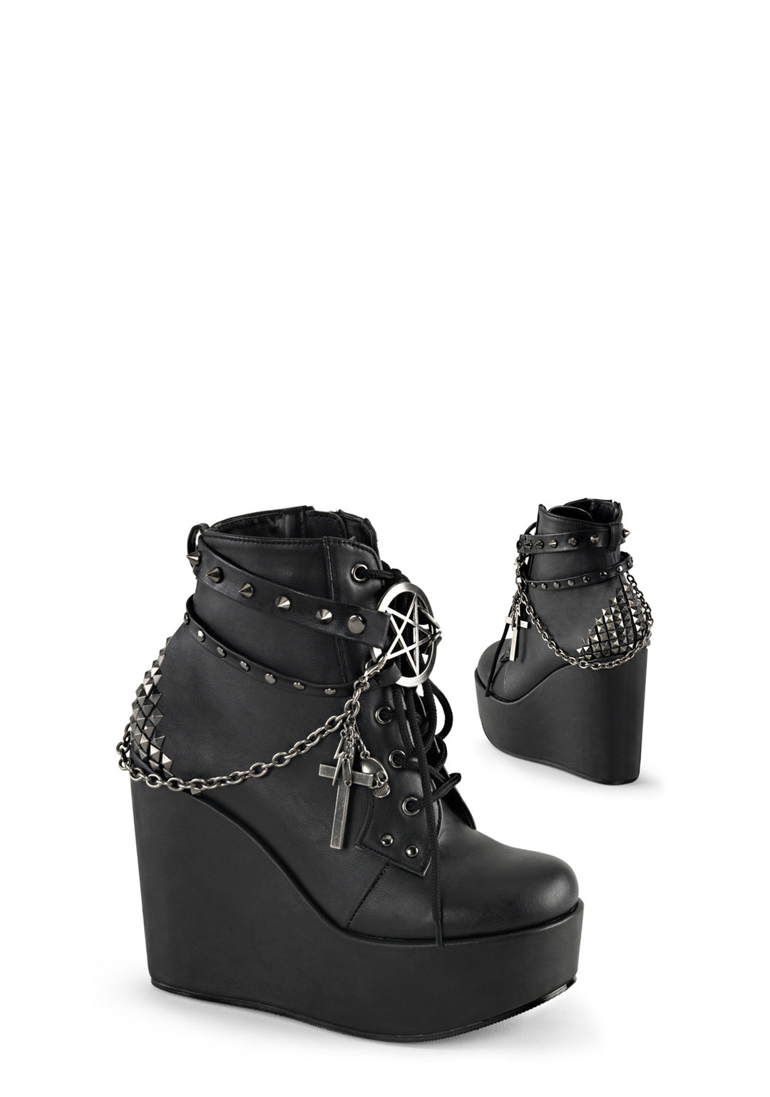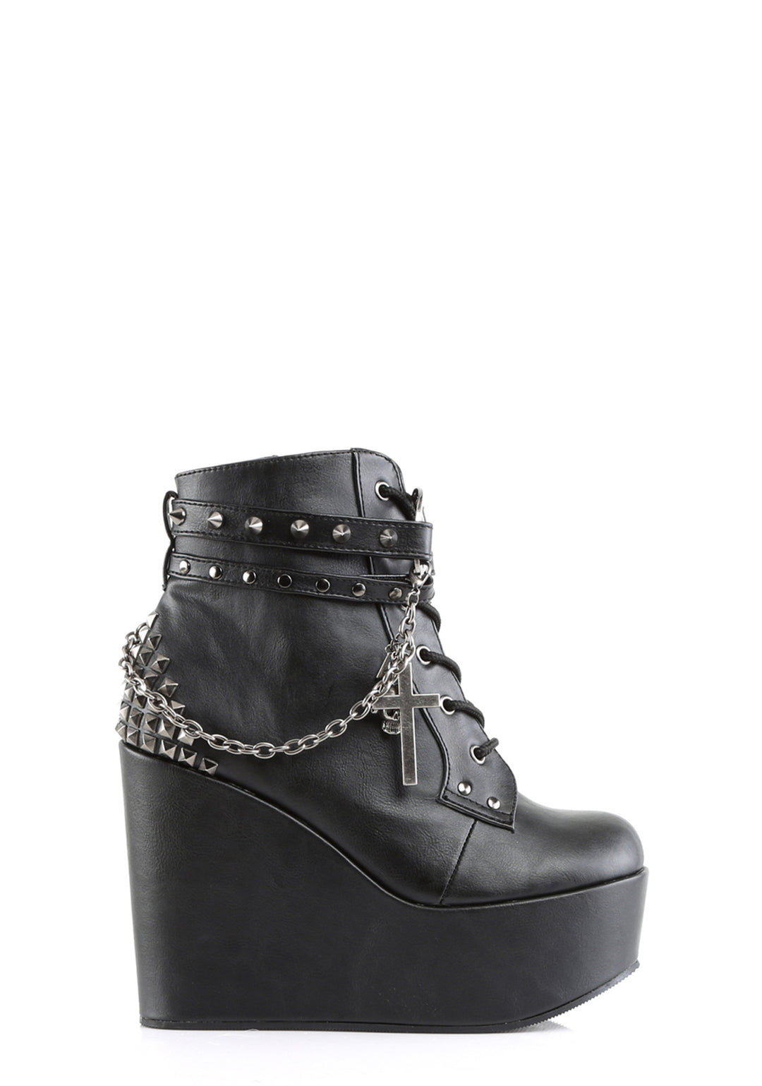 hail to the guardians of the watchtowers of the East! These sik, veggie leather wedge boots will have da devil worship yew with its spiked straps, pyramid studded back, removable chain with cross charms and pentagram buckle in the front. With a lace
