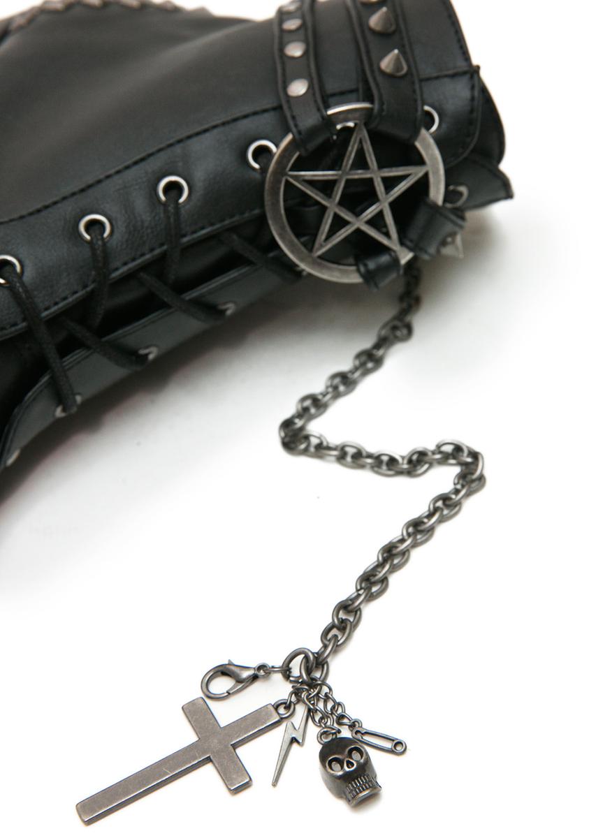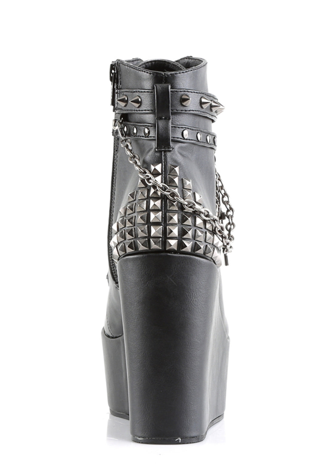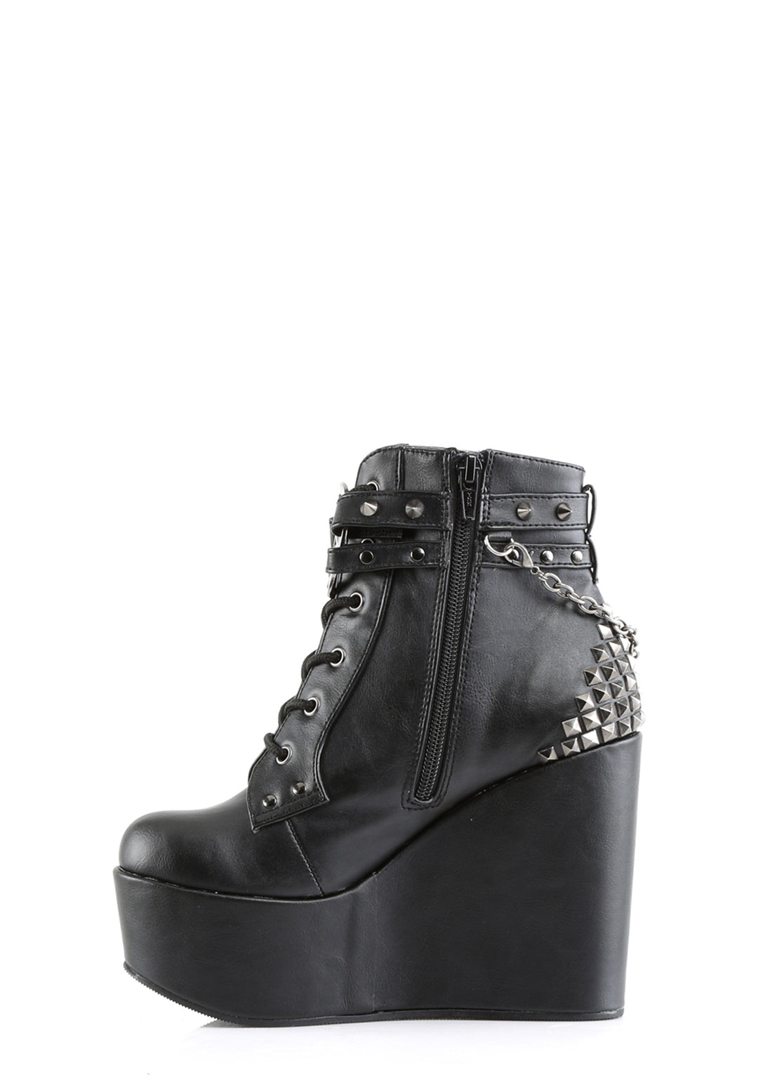 hail to the guardians of the watchtowers of the East! These sik, veggie leather wedge boots will have da devil worship yew with its spiked straps, pyramid studded back, removable chain with cross charms and pentagram buckle in the front. With a lace