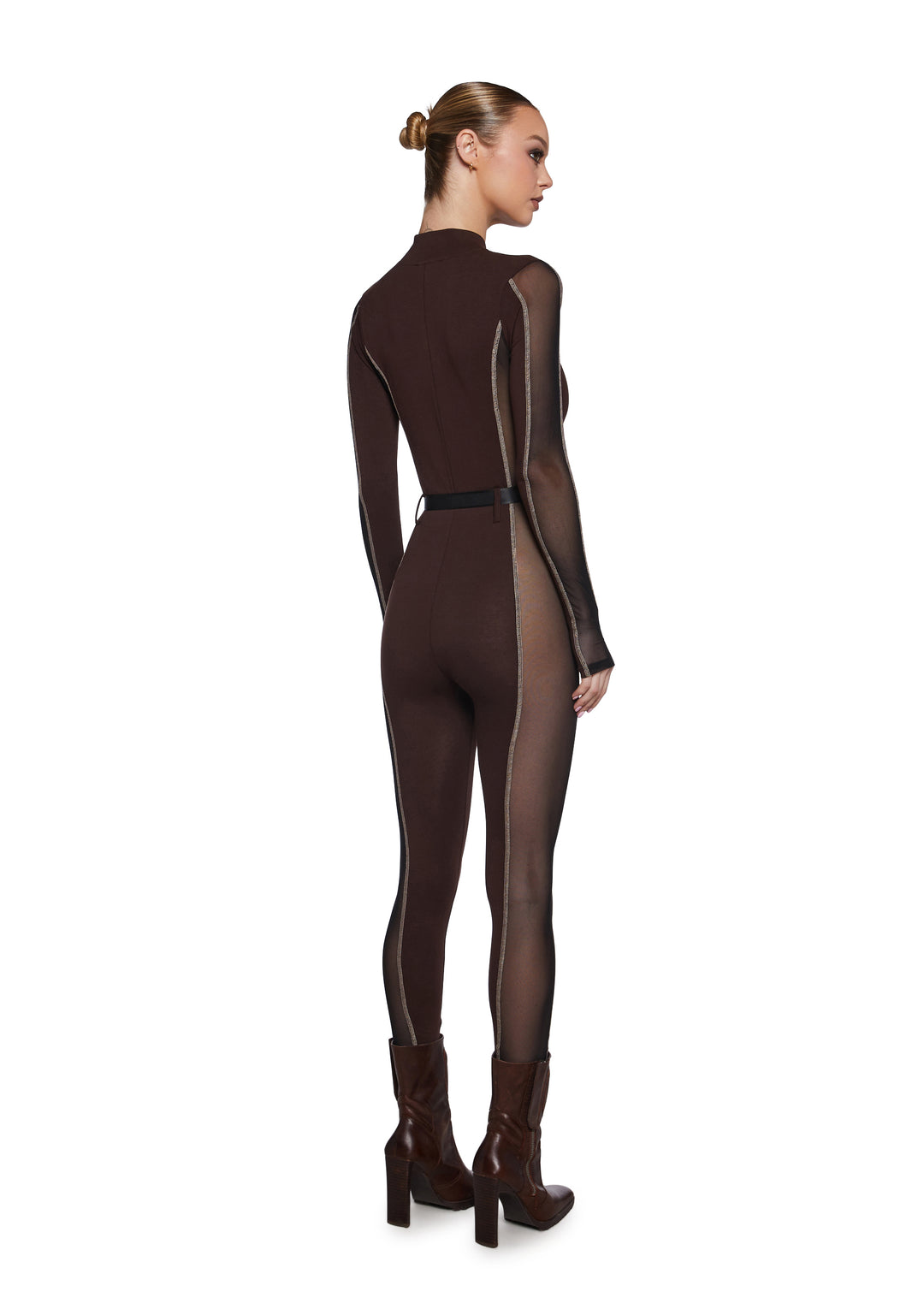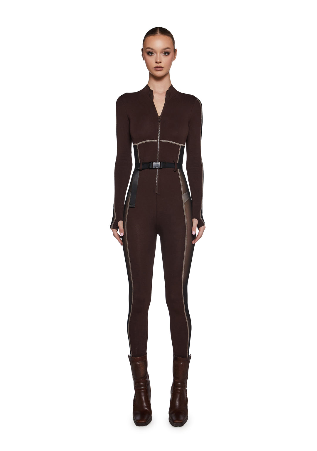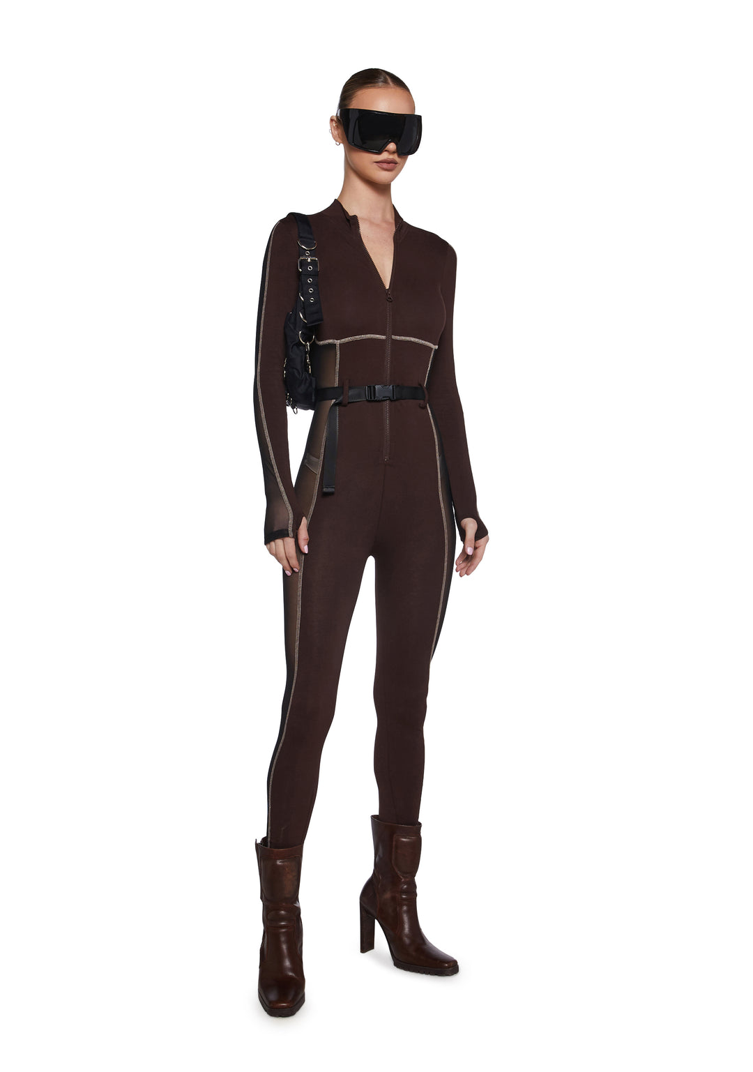 you’ve got your bachelors’ in bossy. This jumpsuit has mesh paneling at the sides of the body and arms, long sleeves with thumb holes, a zipper up the front, a lil collar, and a canvas belt at the waist.