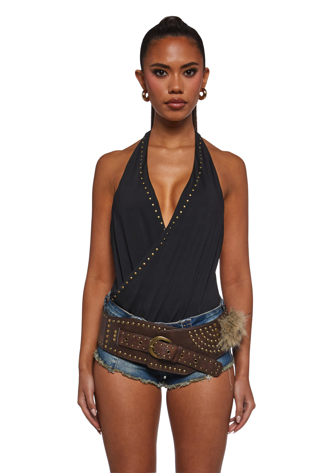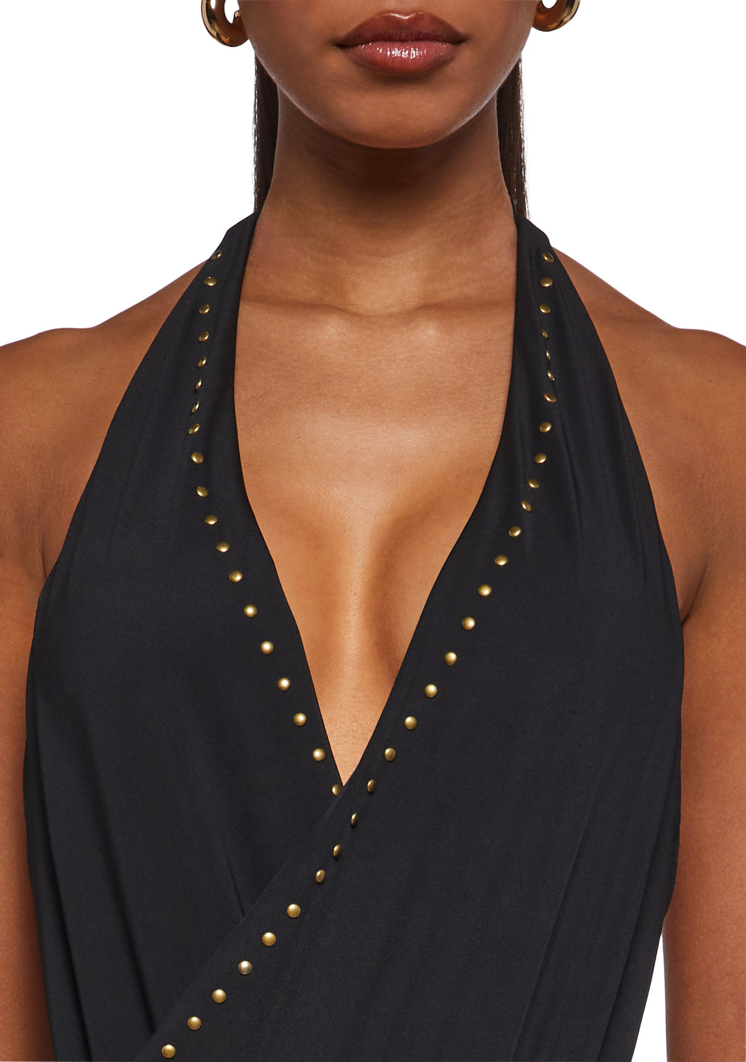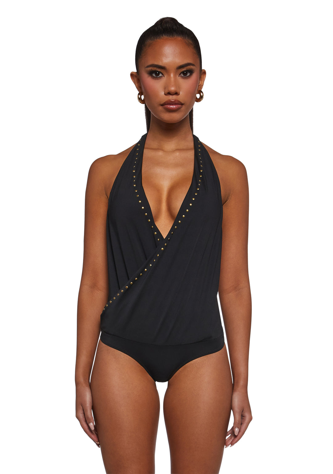 Command attention in the Power Play Halter Bodysuit, designed with a sleek plunge neckline and chic gold stud detailing along the edges. Its wrap-front silhouette and smooth, stretchy fabric create a flattering, sculpted fit perfect for statement-making looks.