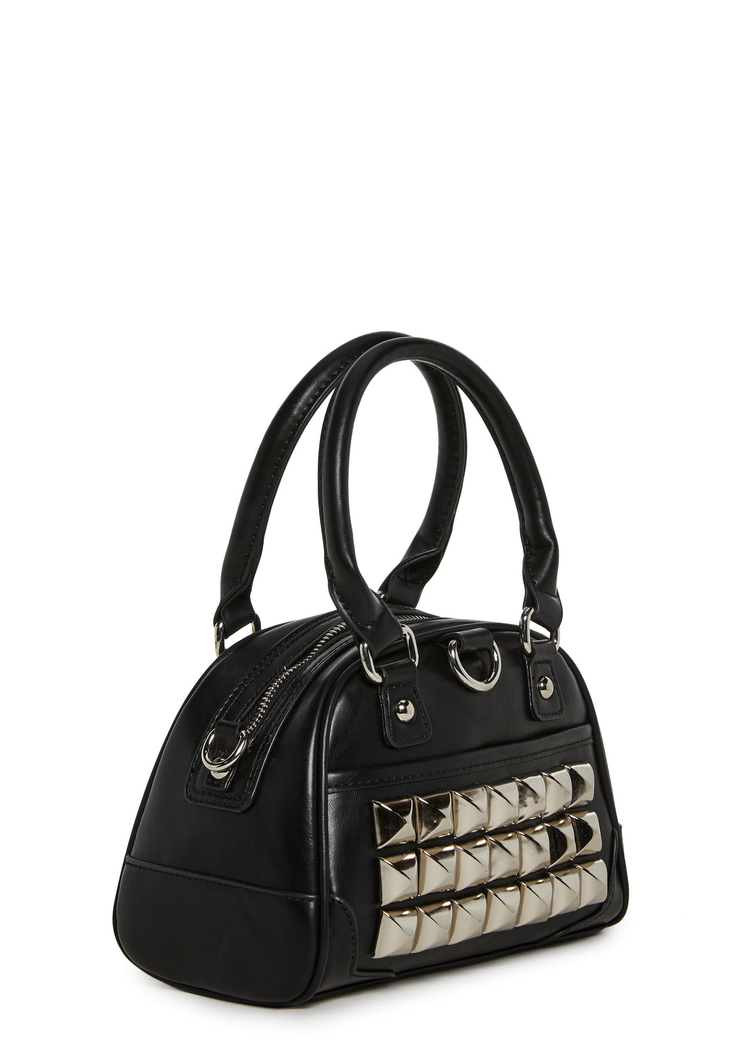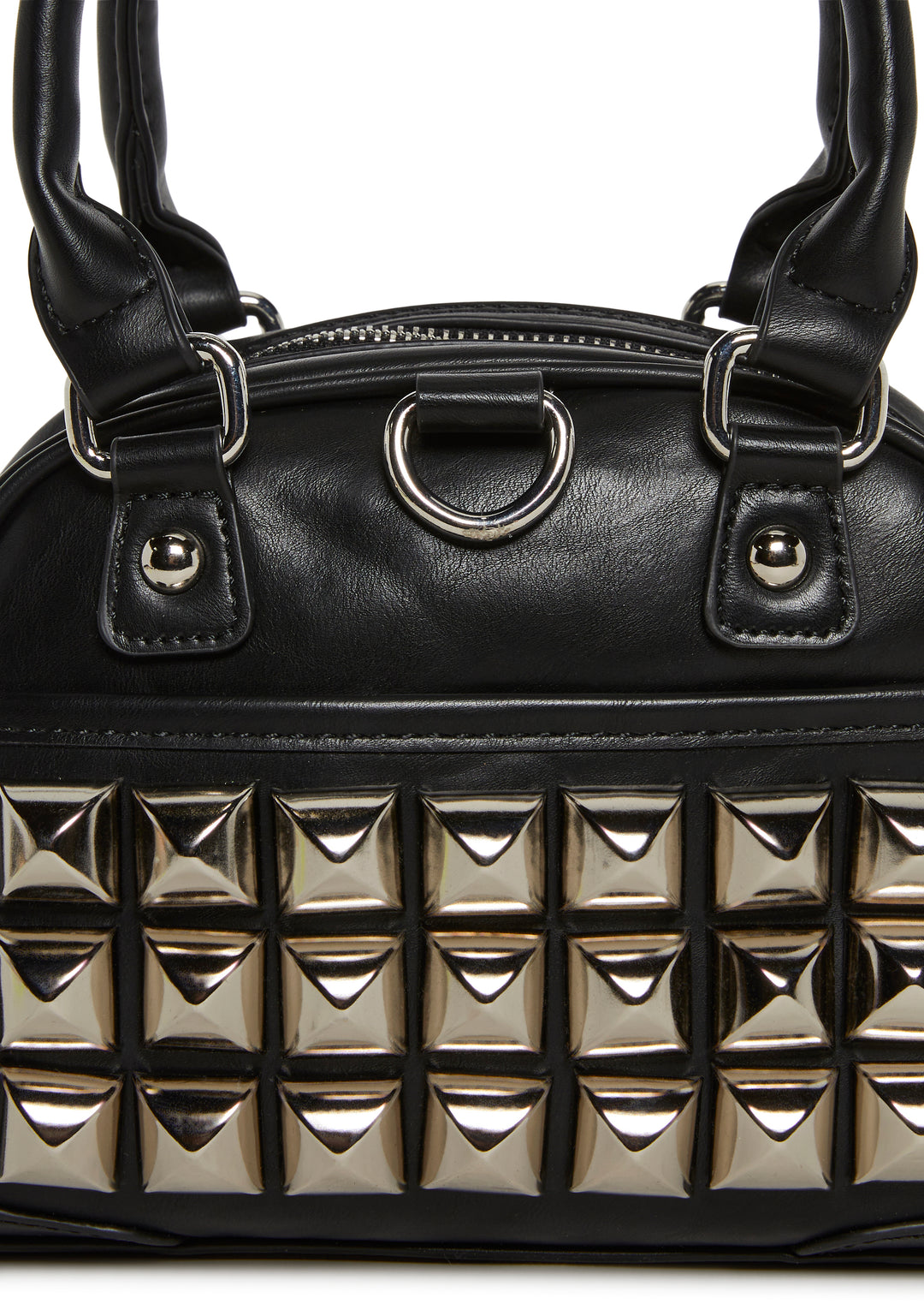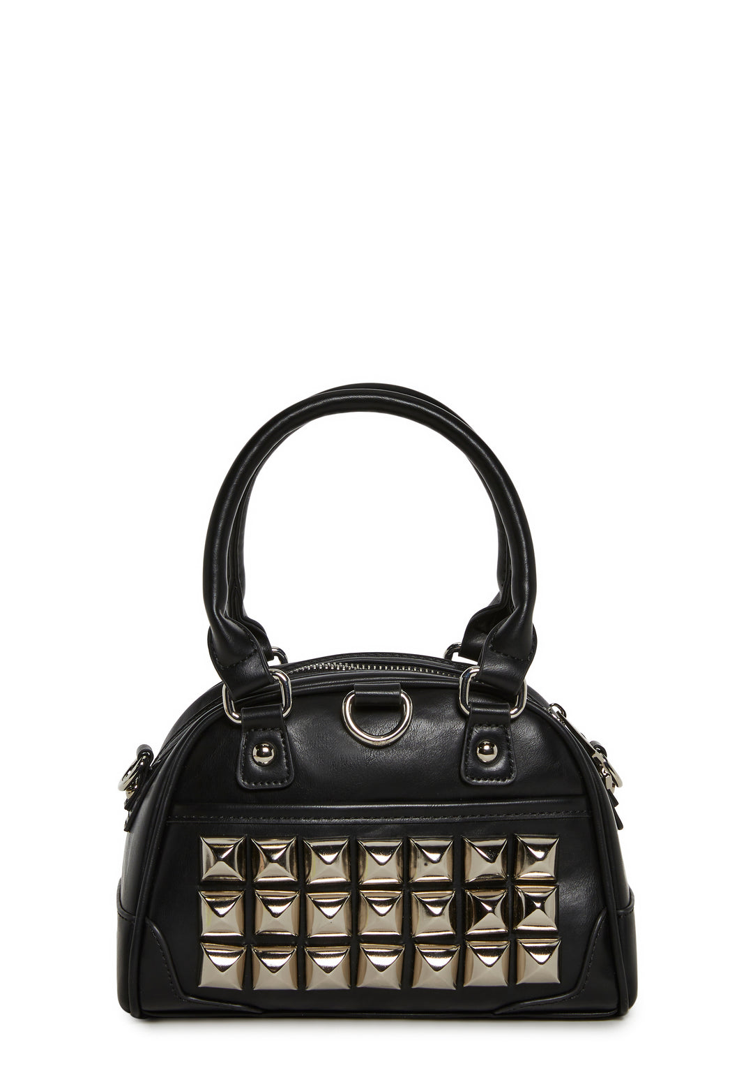 This structured mini handbag features a sleek faux leather finish accented with bold pyramid studs for a statement-making edge. Designed with top handles and a removable shoulder strap, it blends punk-inspired style with everyday versatility.