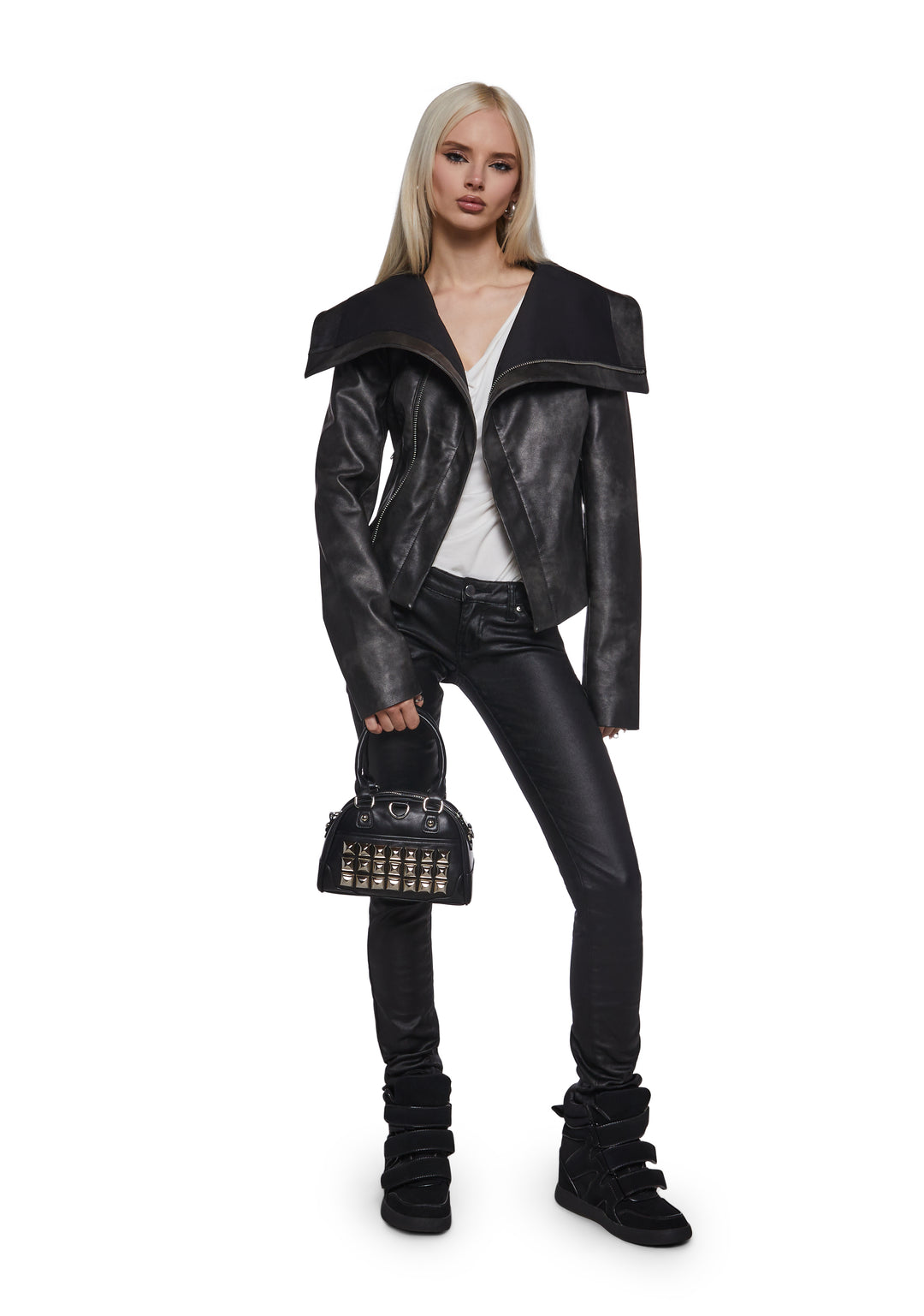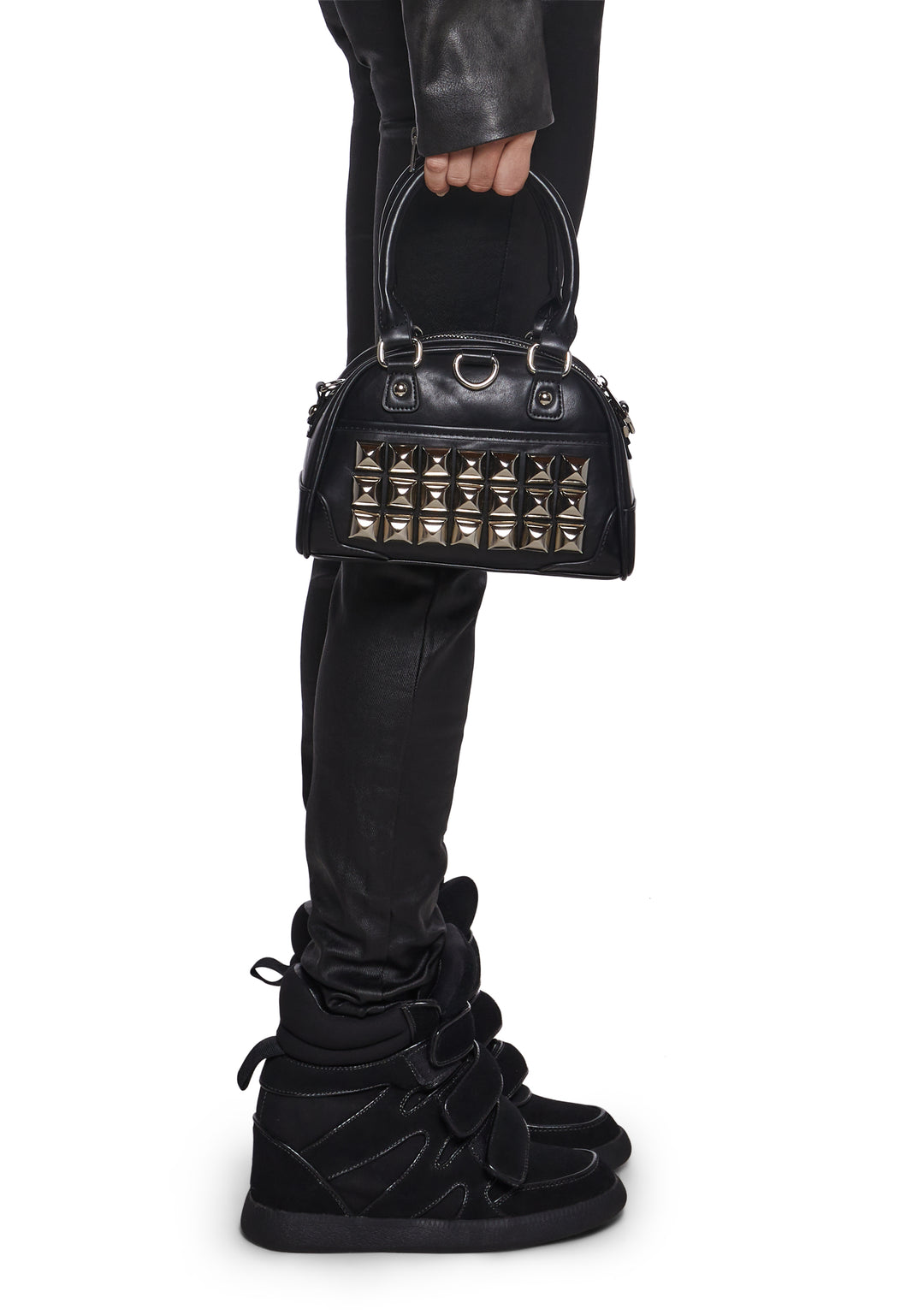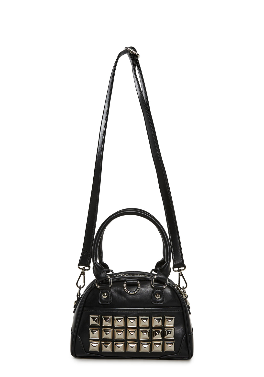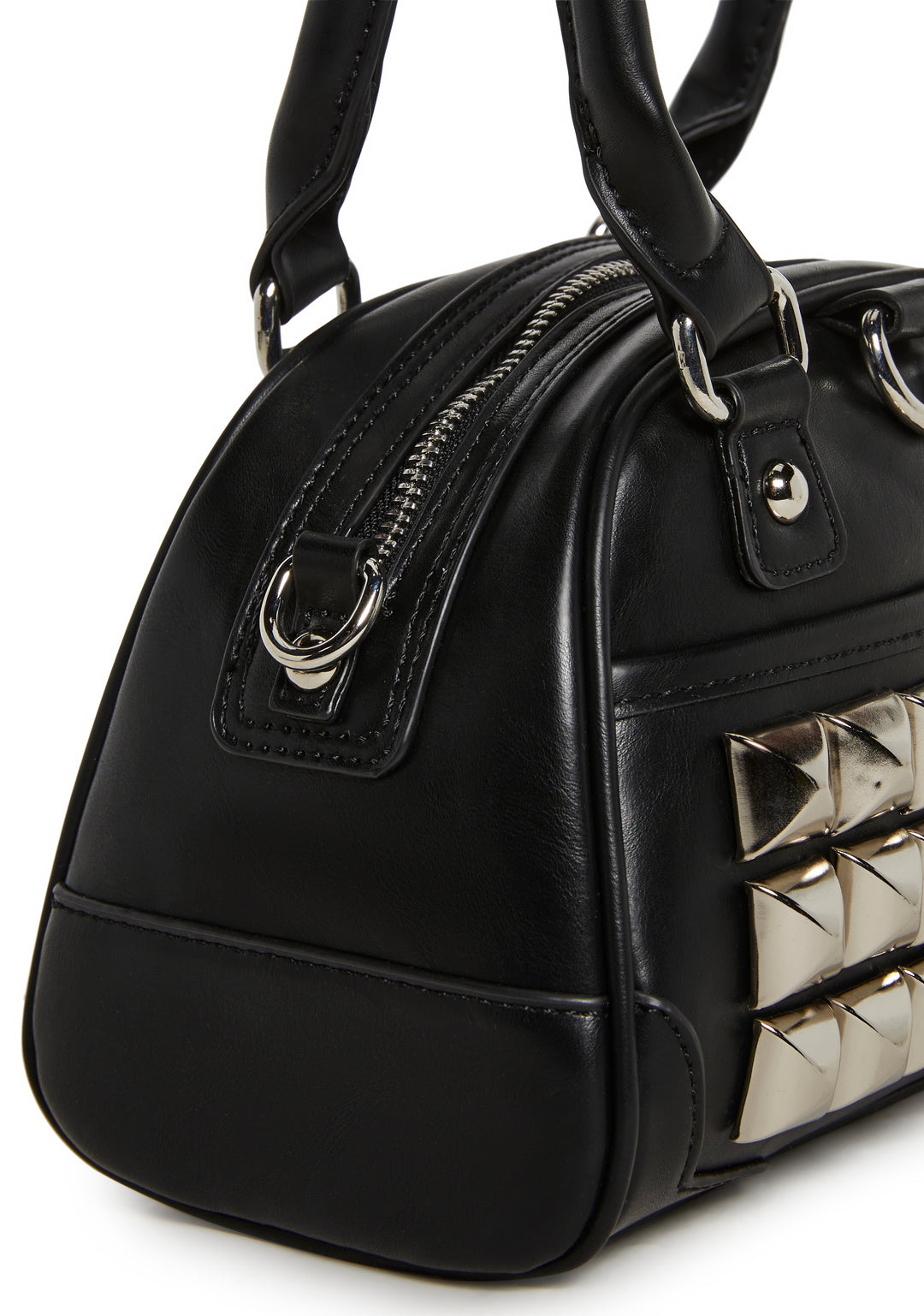 This structured mini handbag features a sleek faux leather finish accented with bold pyramid studs for a statement-making edge. Designed with top handles and a removable shoulder strap, it blends punk-inspired style with everyday versatility.