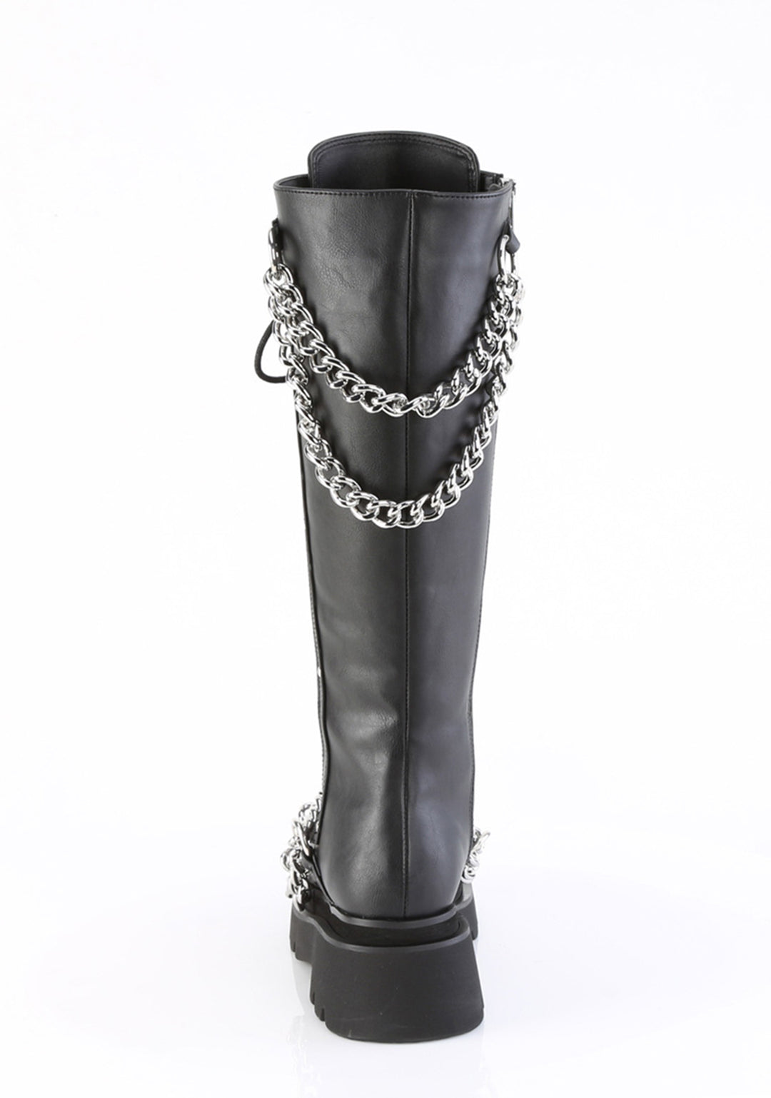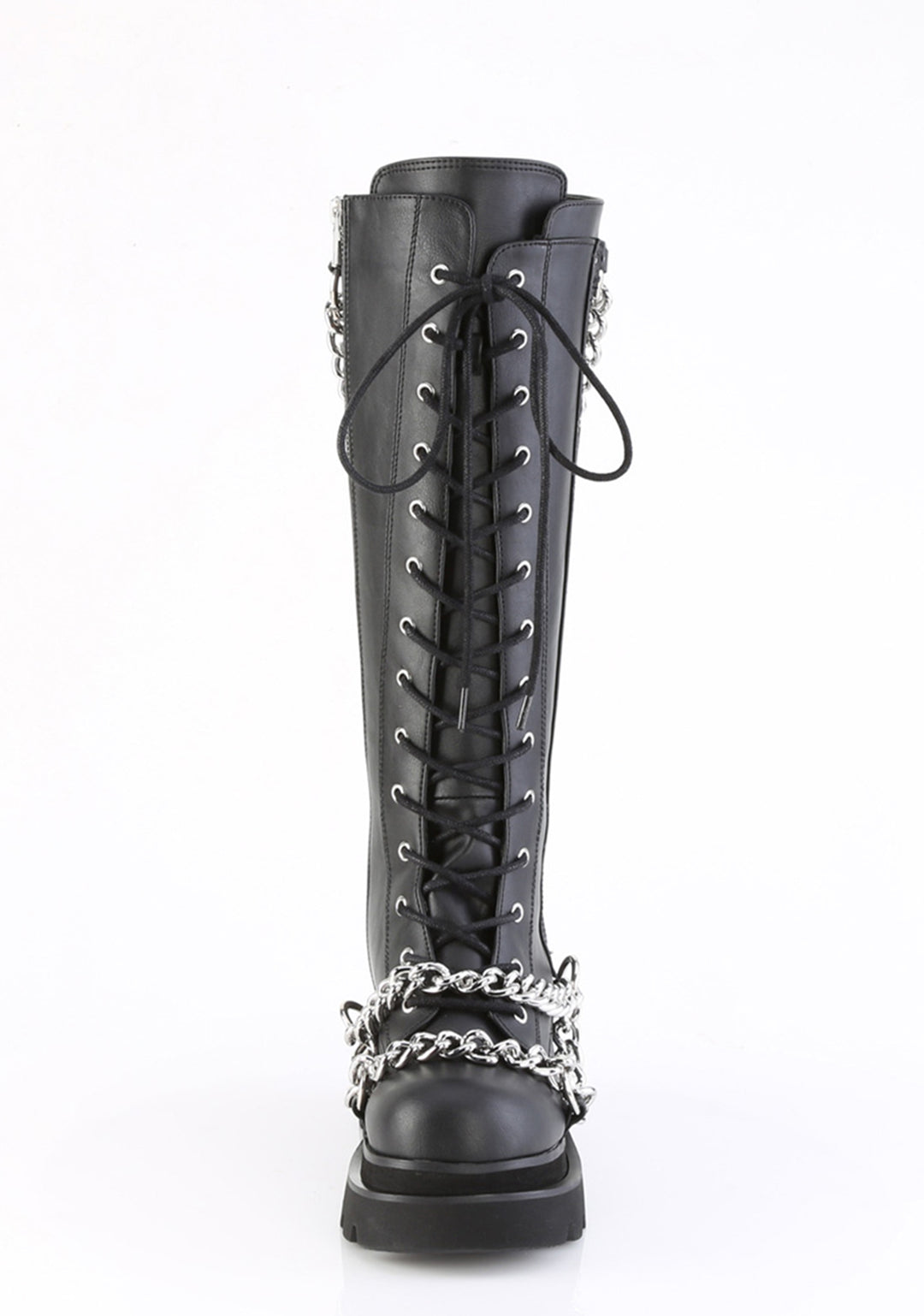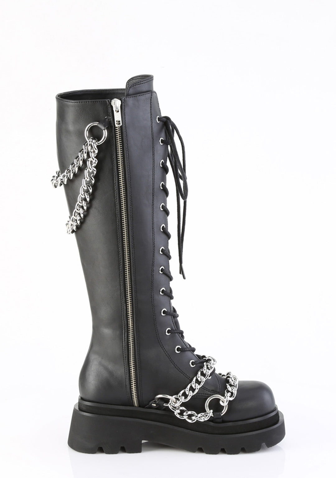 These boots have a vegan leather construction, front lace-ups, O-ring details, swooping chains, studs, O-ring hardware, and side zipper closures.
