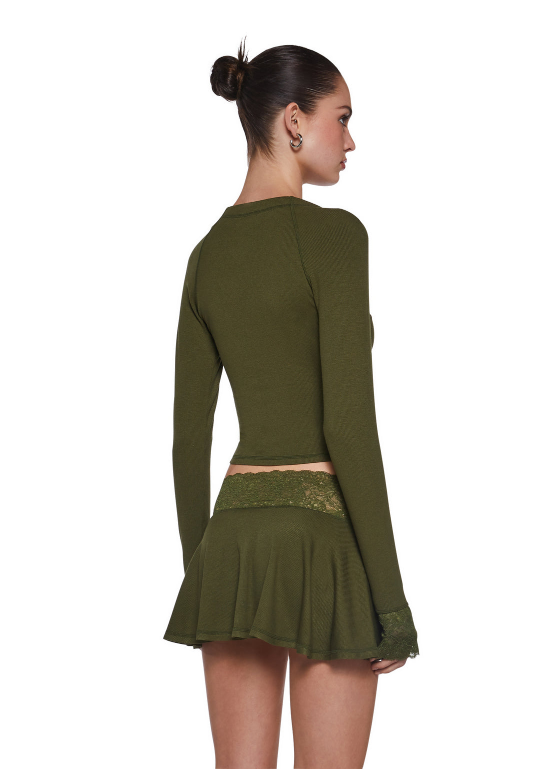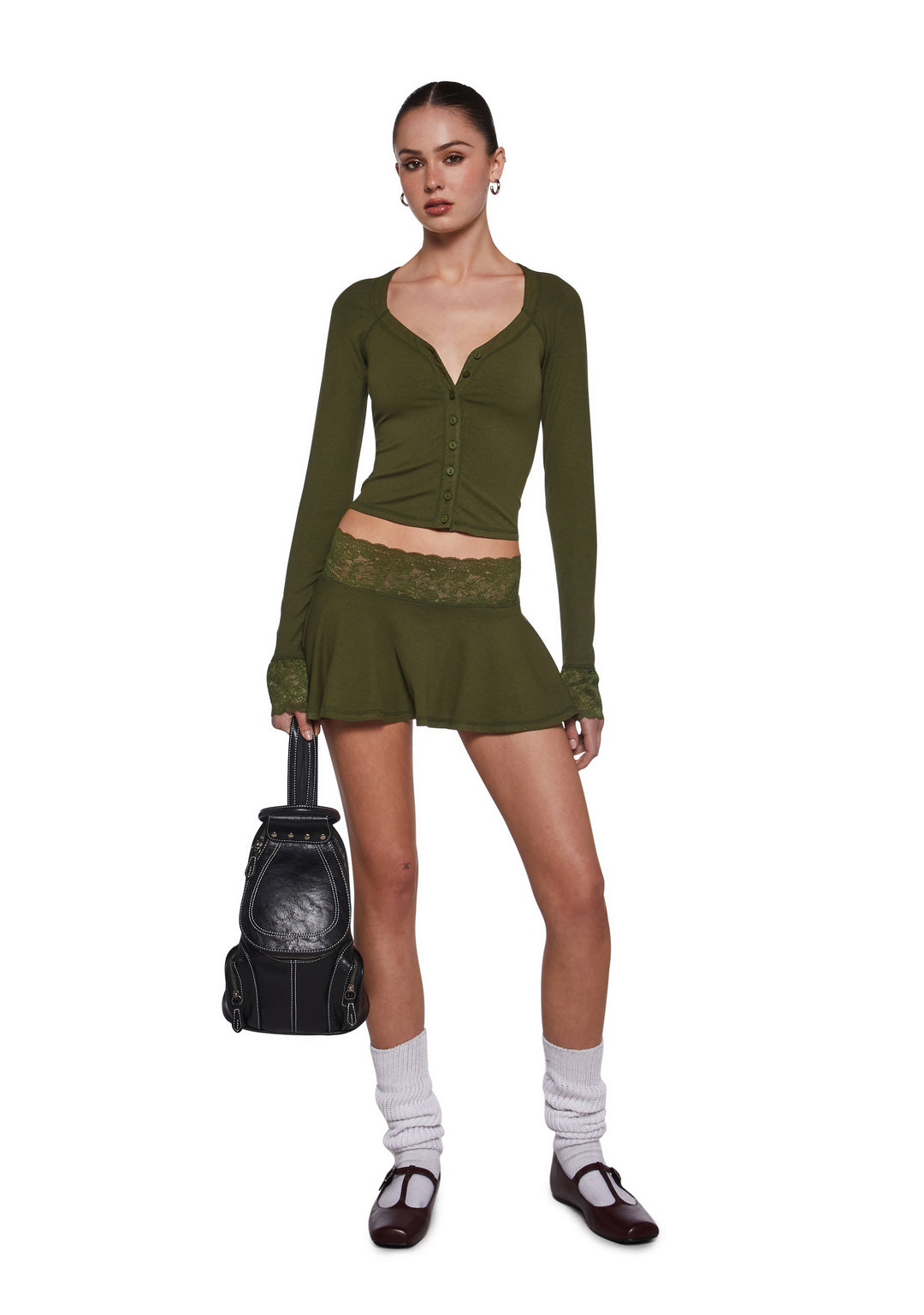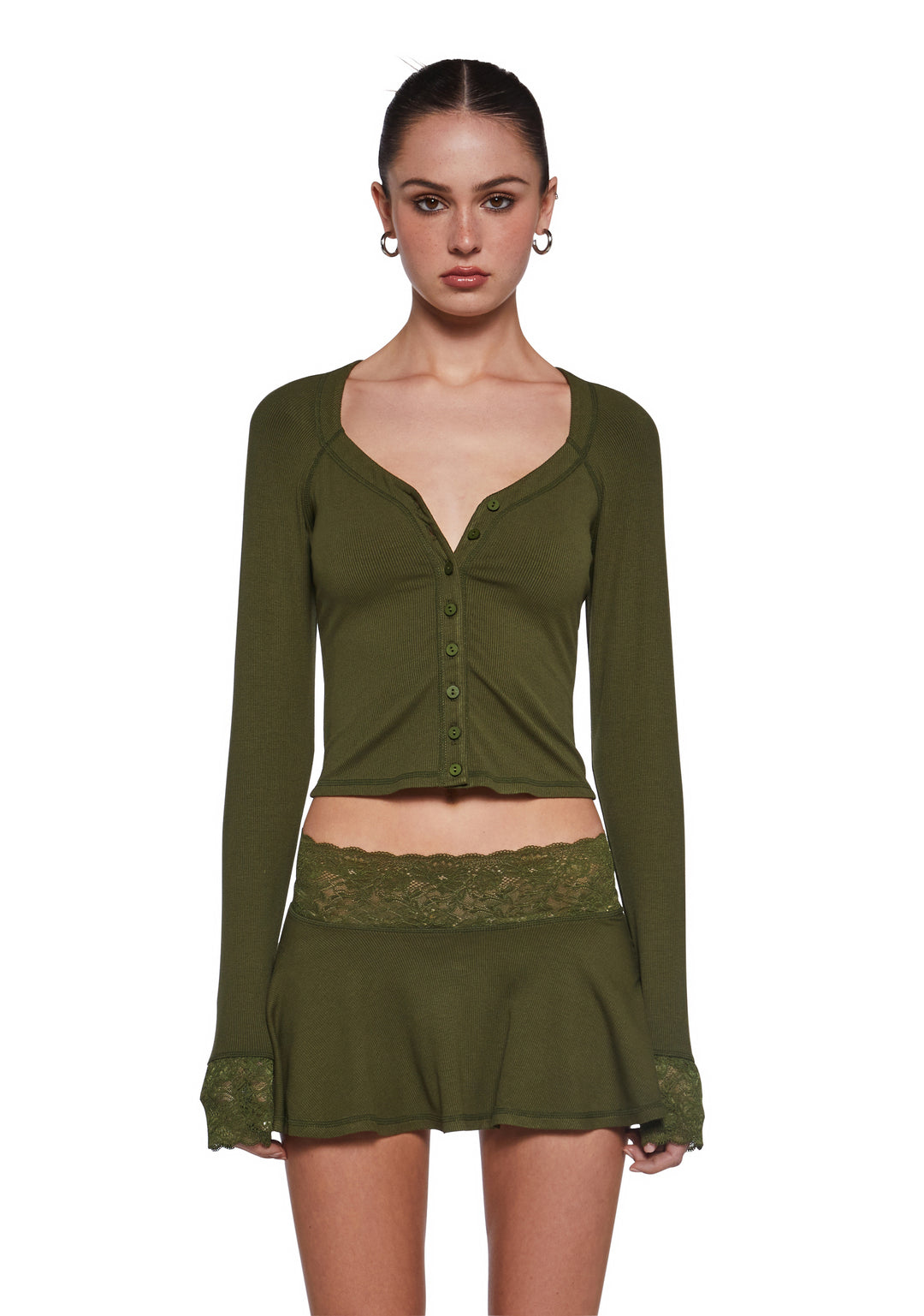This set includes a long sleeve top that has a ribbed construction, lace trimmed cuffs, a plunging neckline with front button closures, and a matching skirt.