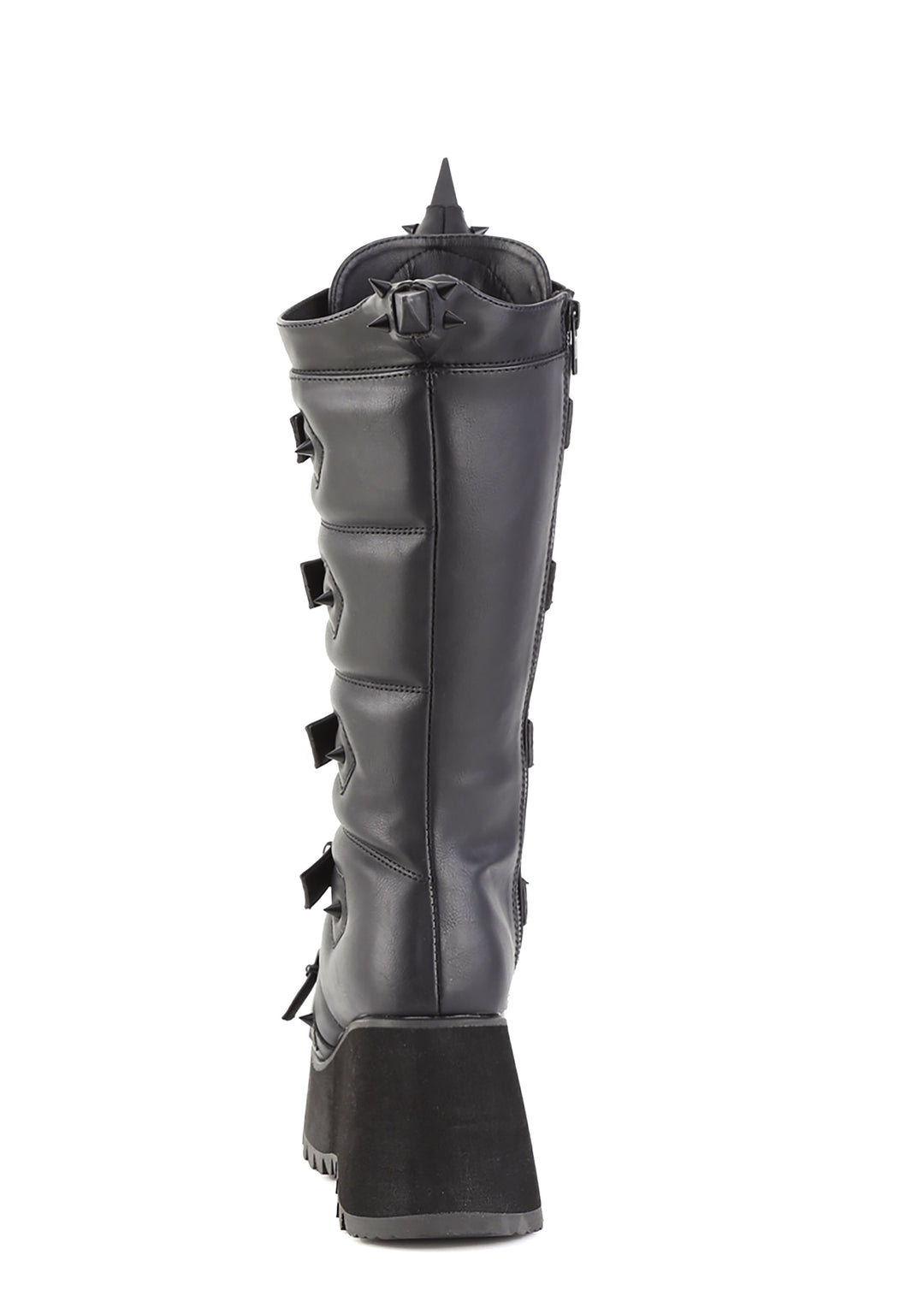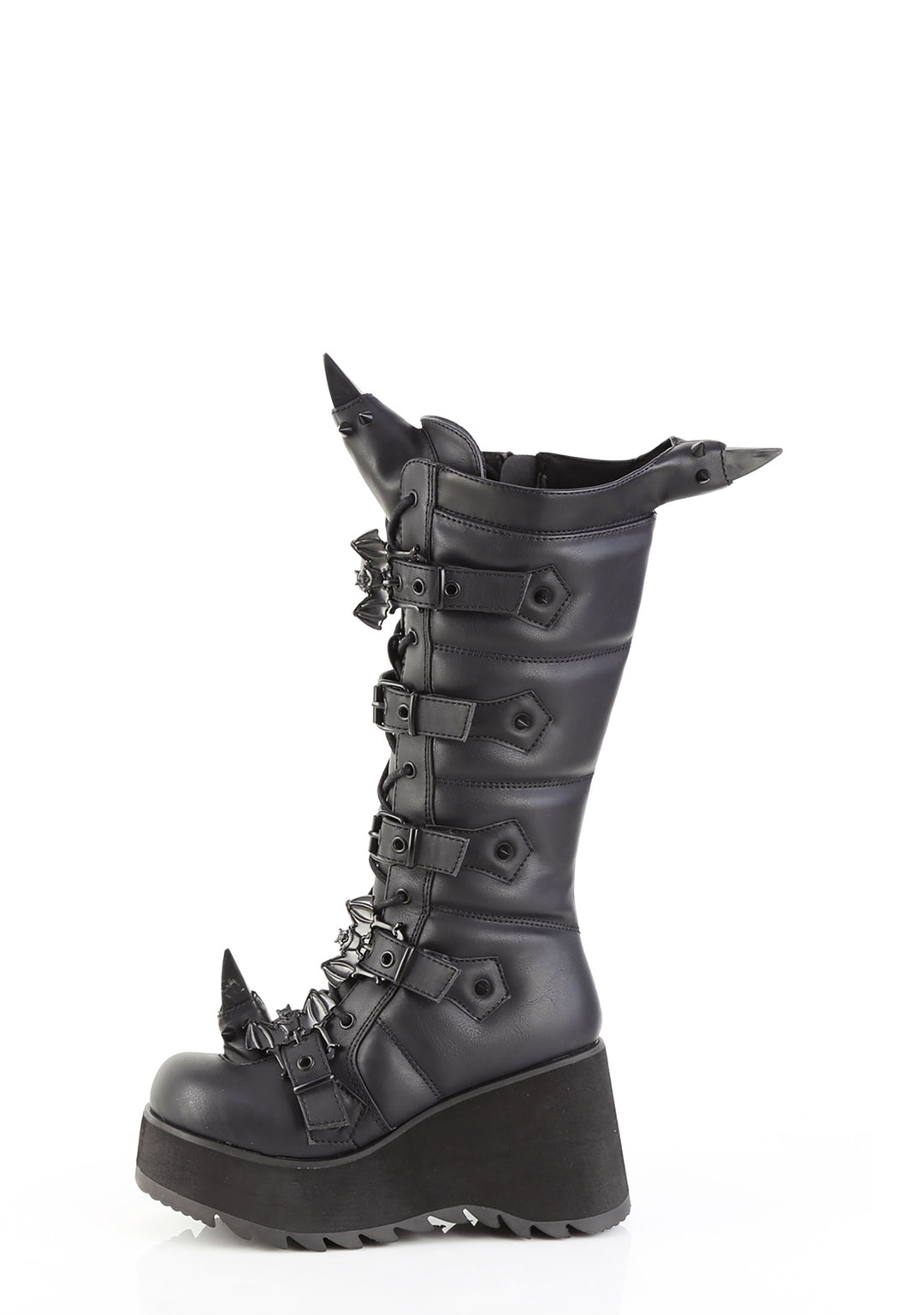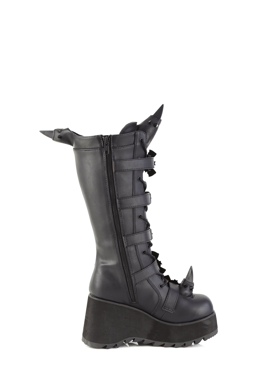 These boots have a vegan leather construction, front lace-ups, bat buckle straps, side zipper closures, and rubber spiked rhino horn details on the toe, upper back, and tongue.