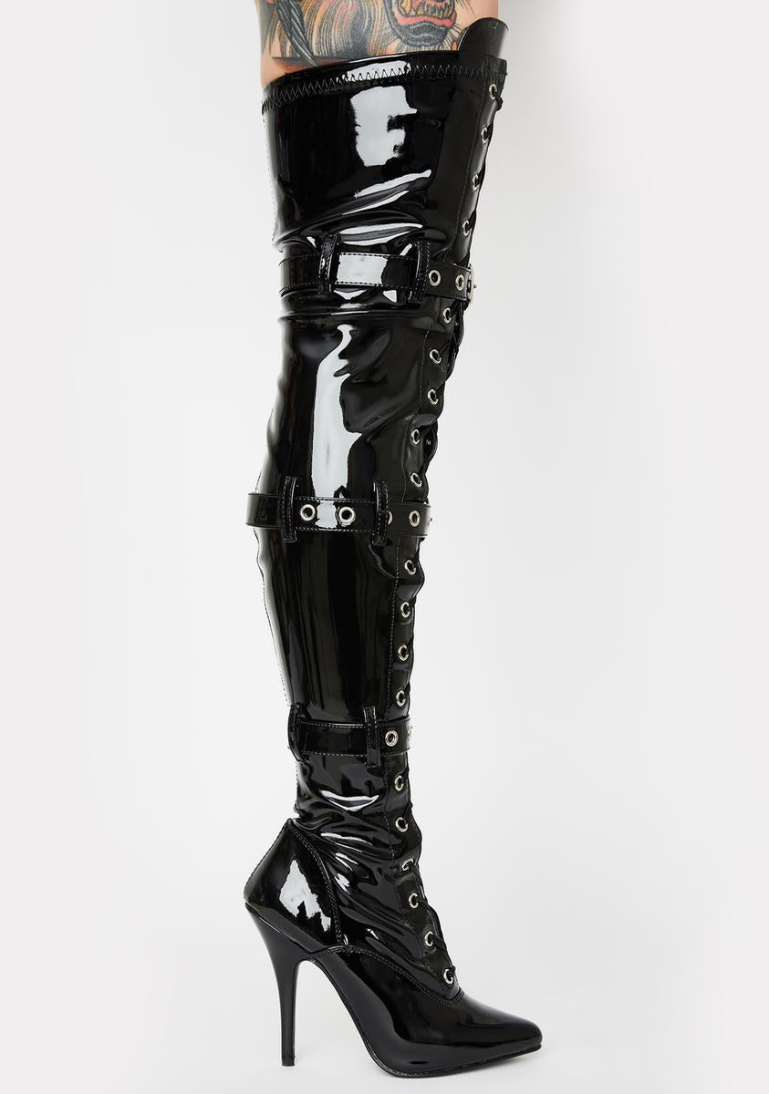 got ’em lining the block just to meet ya! You’re the baddest bish in the room in these thigh high boots that have a patent leather construction, grommet hardware, buckle straps along the shaft, and lace up satin ribbons.
