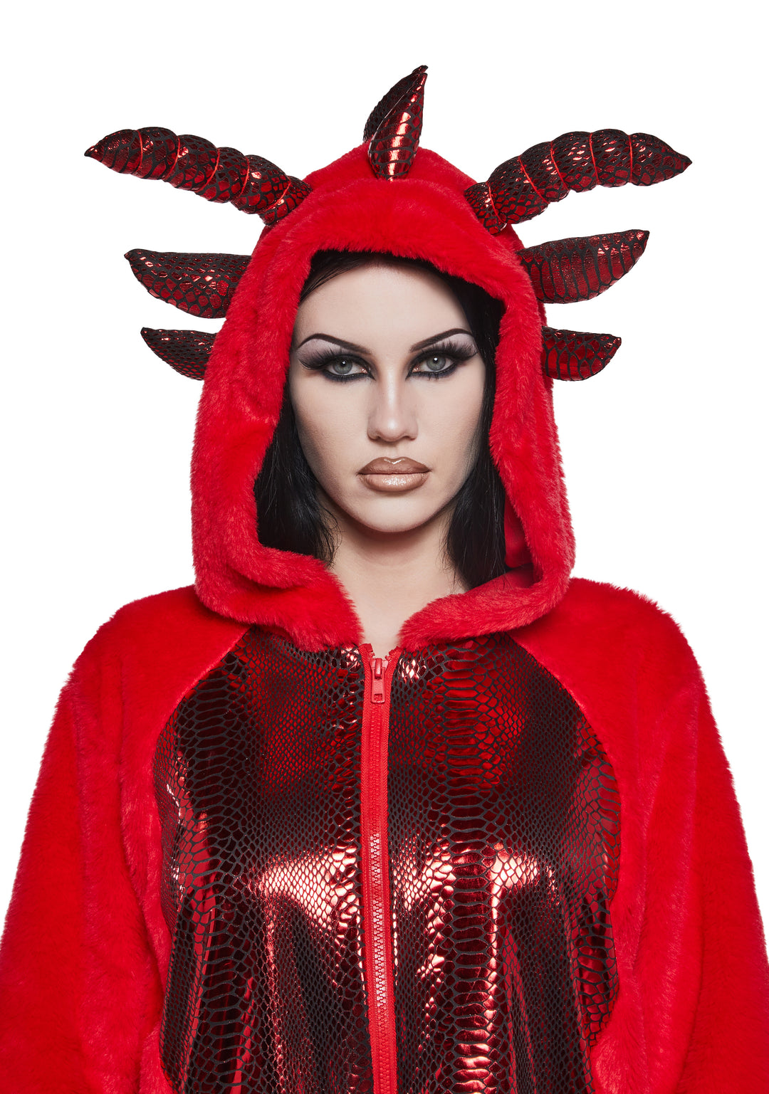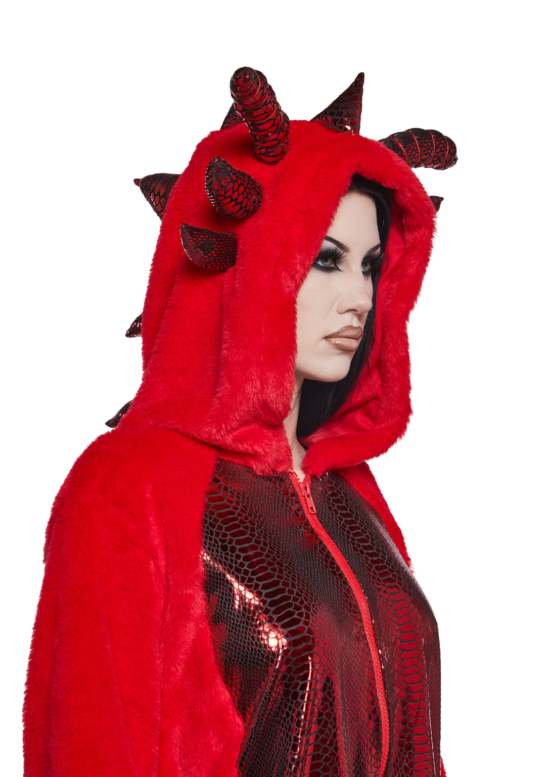 This red dragon costume features a cozy oversized hoodie design with plush fabric and shiny scale-like details on the chest and back. The hood includes dragon horns, while the back is decorated with spiked scales for a bold look. Complete with clawed sleeves and a tail, this dragon outfit is both fun and comfortable, making it a great choice for Halloween, cosplay, or themed parties. Its bright red color and unique details make it stand out while keeping you warm and stylish.