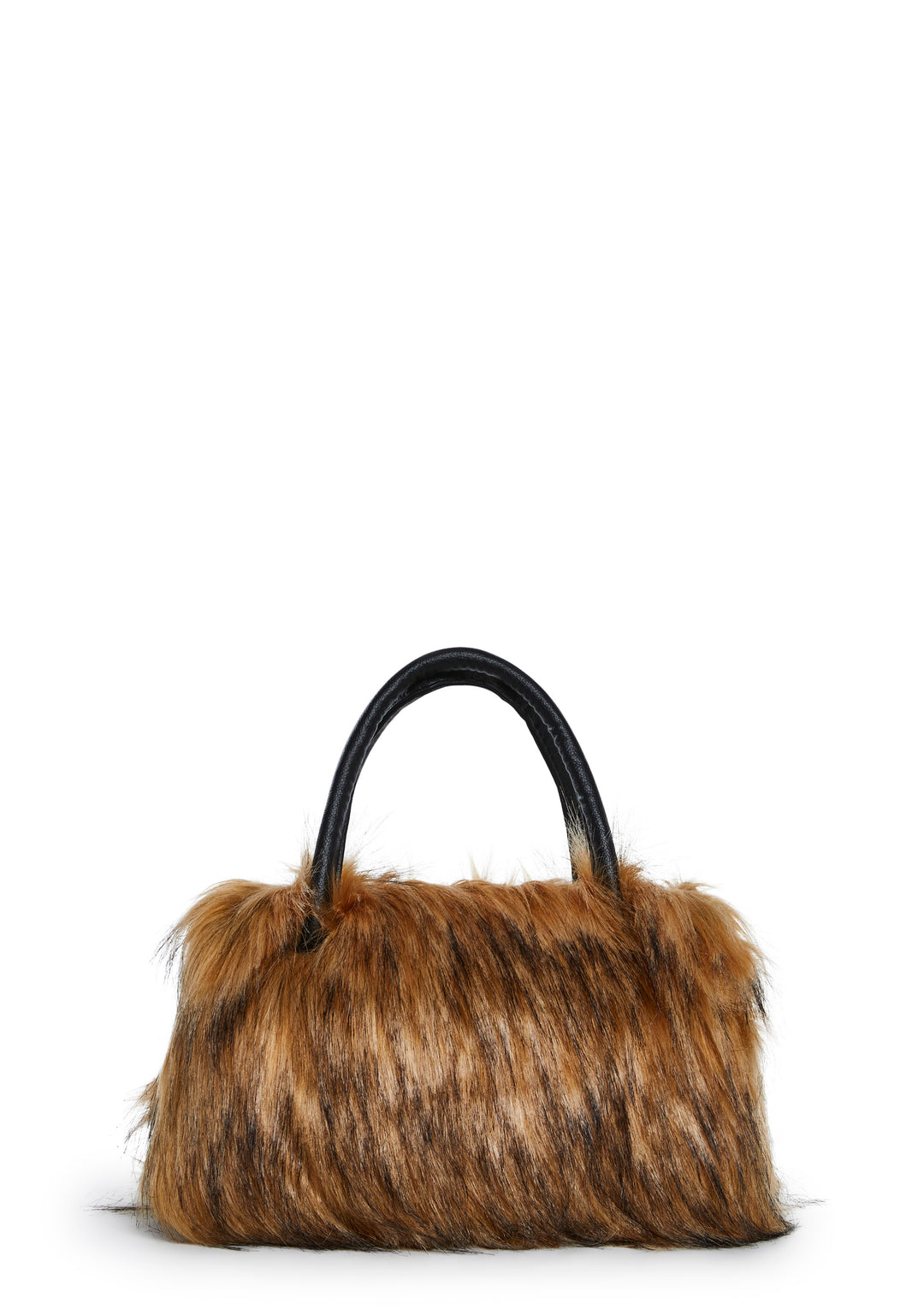 This shoulder bag has a shaggy construction, vegan leather top handles, a removable adjustable shoulder strap, and a top zipper closure.