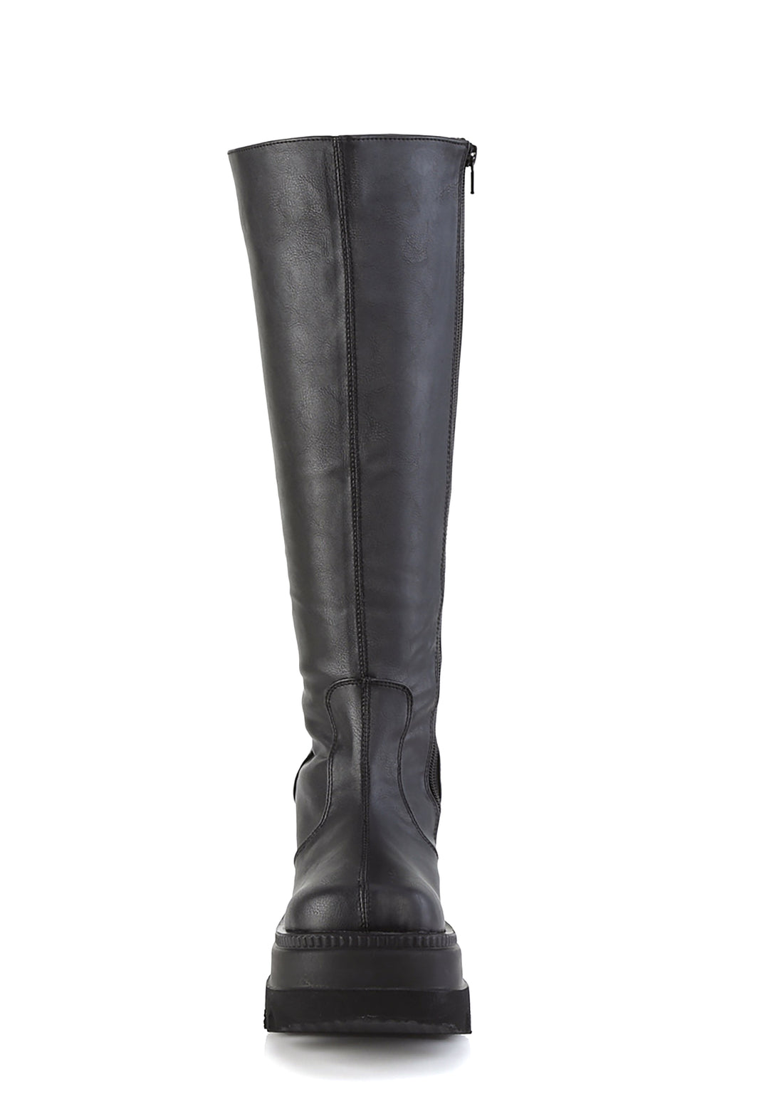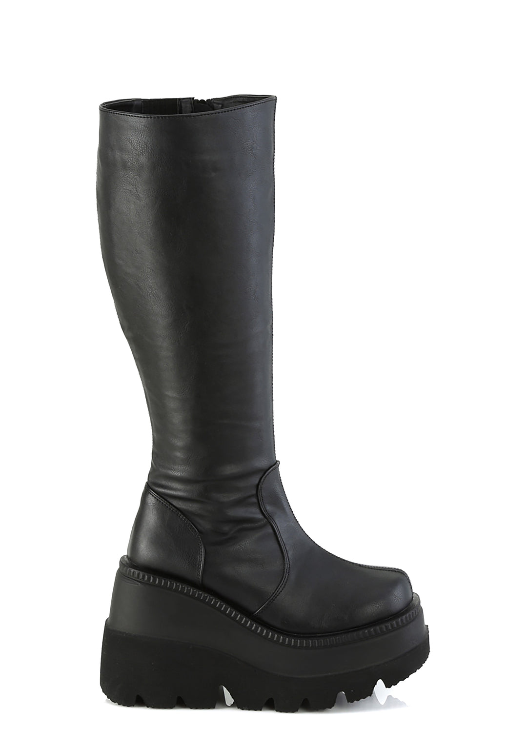 cuz you take it to the next level, babe! These knee high boots have a stretch vegan leather material with a wide calf construction, chunky wedge platform soles, and side zip closures.