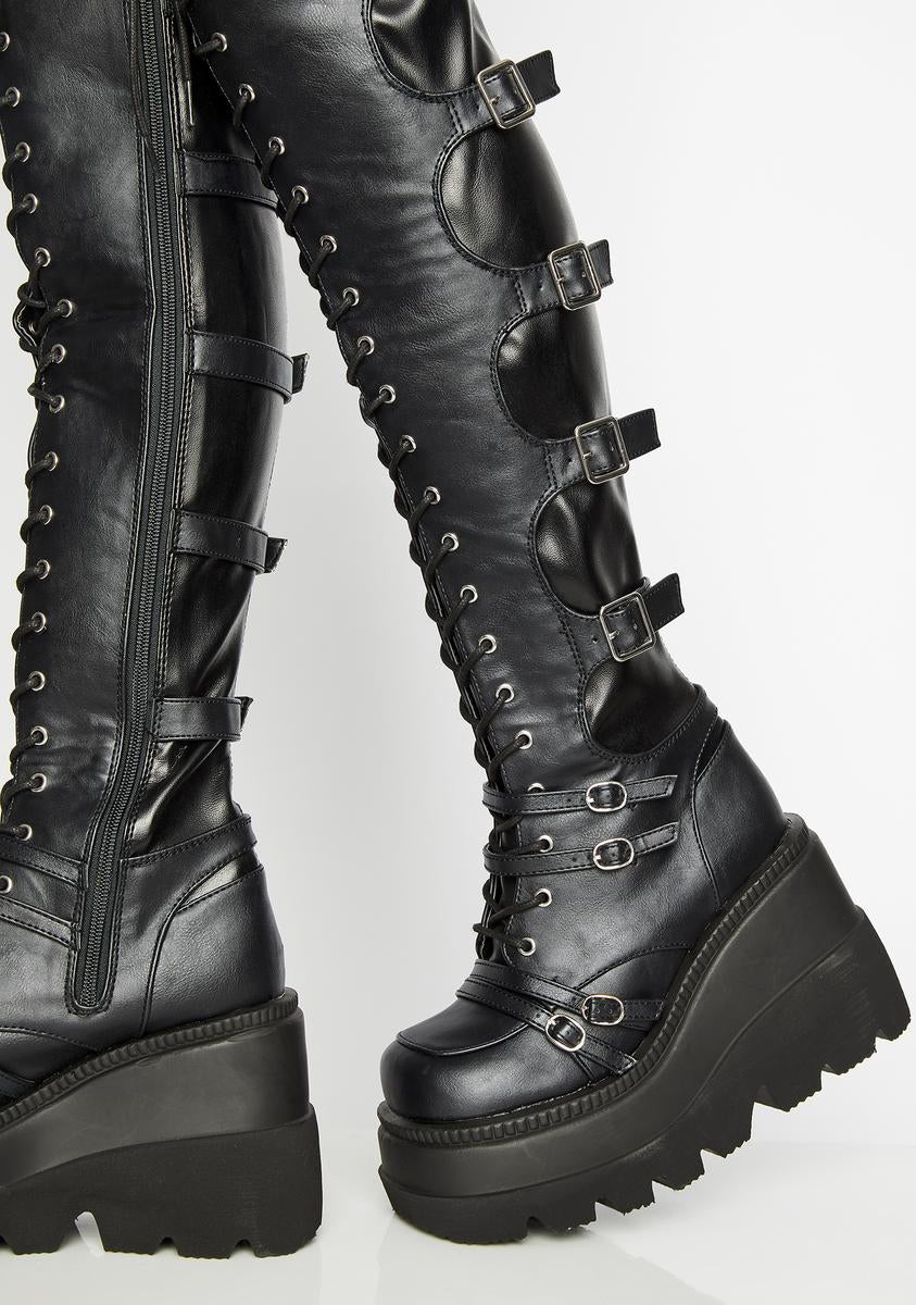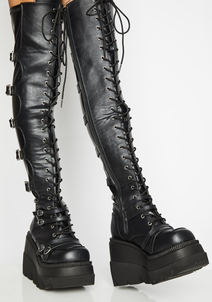 cuz you’re a hurricane! Make the earth quake in these sikk thigh high boots that have sky high platform wedge soles, buckles deetz down the sides, lace-ups on the tops N’ side zip closures.