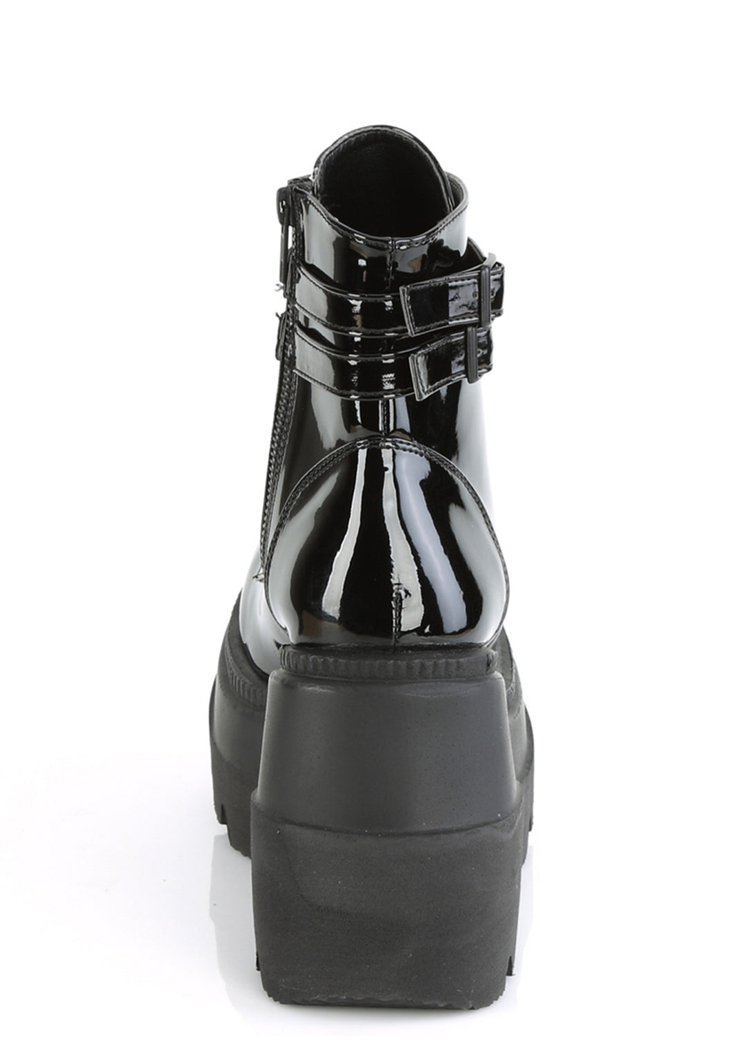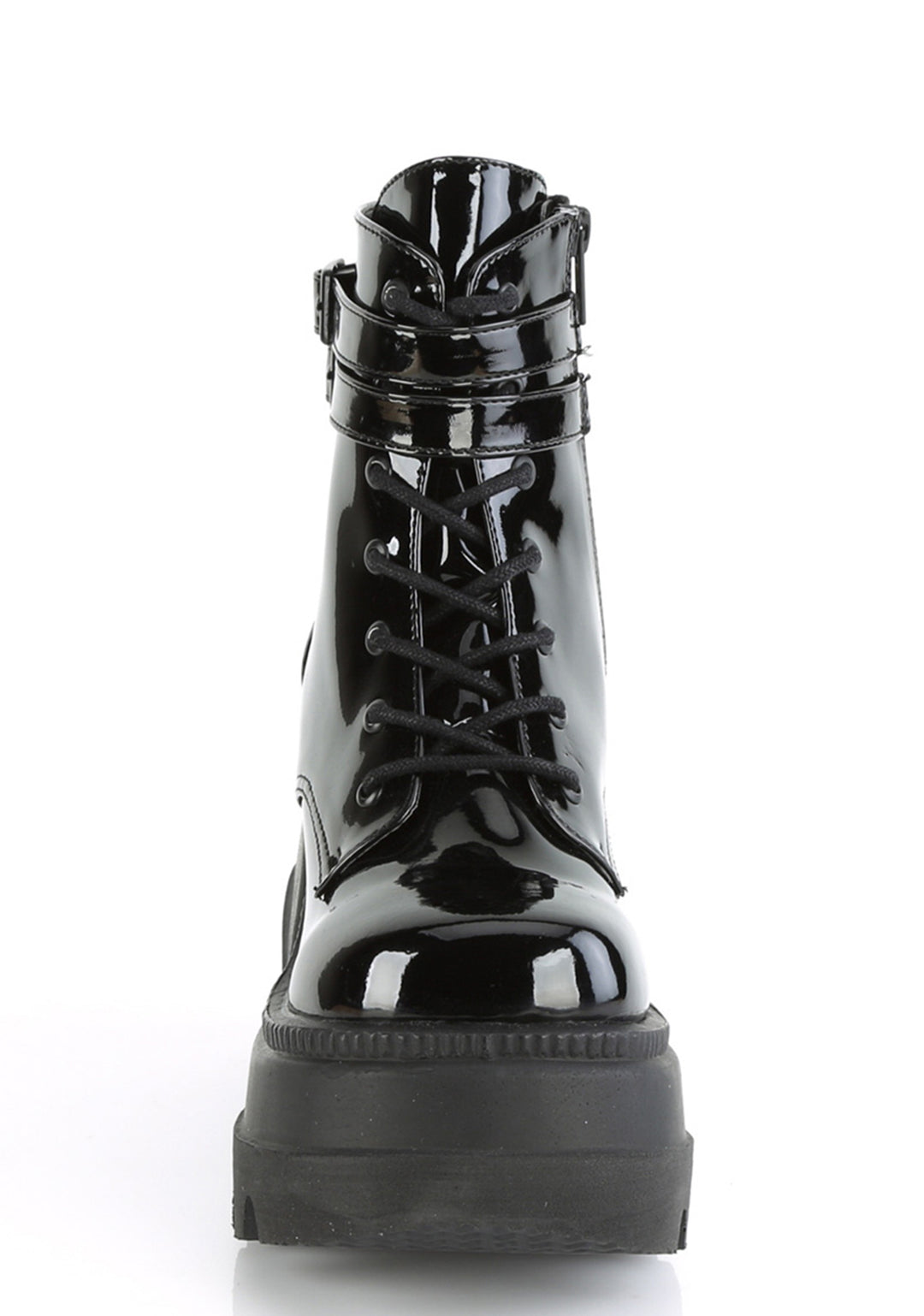 for the nights when your dark arts also require sum deep house beatz. These gnarly 100% shiny patent vegan leather platform boots, feature an ultra treaded platform, lace front details, two adjustable buckle straps around the ankle, and a side zipper