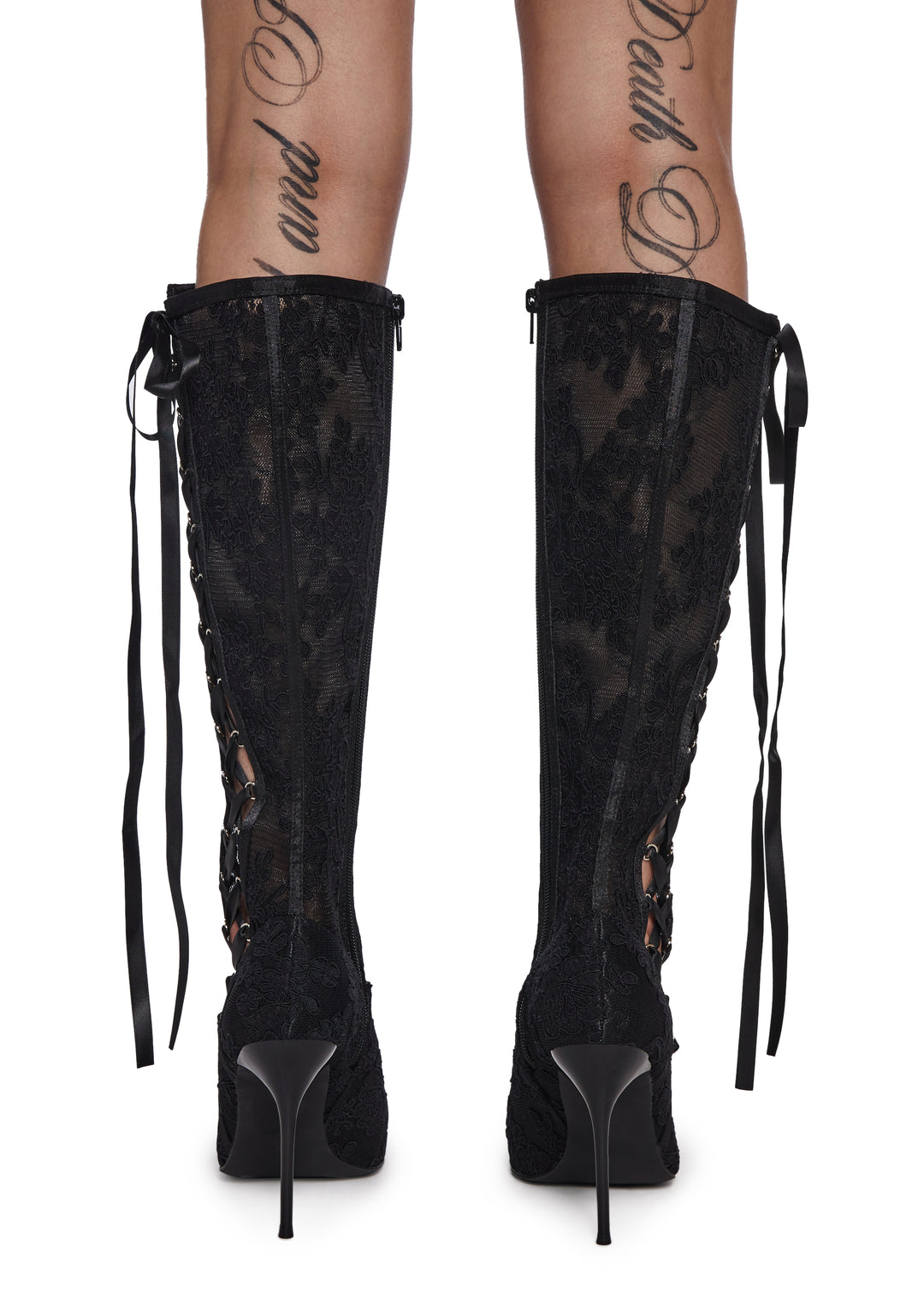Sheer Lace Stiletto Boots With Lace-Up And Zip Closures Sugar Thrillz – Black
