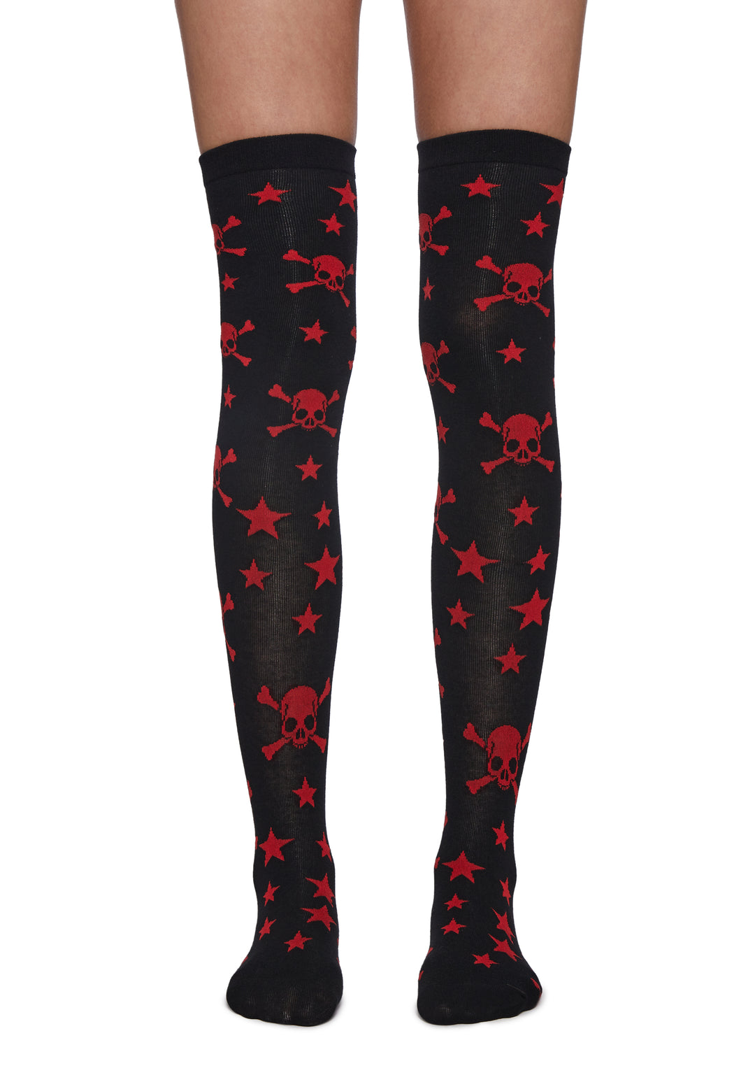 This 2 pack of socks include two knee high socks that have a knit construction,an all over skull and crossbones and stars graphics pattern, and come in two colors.