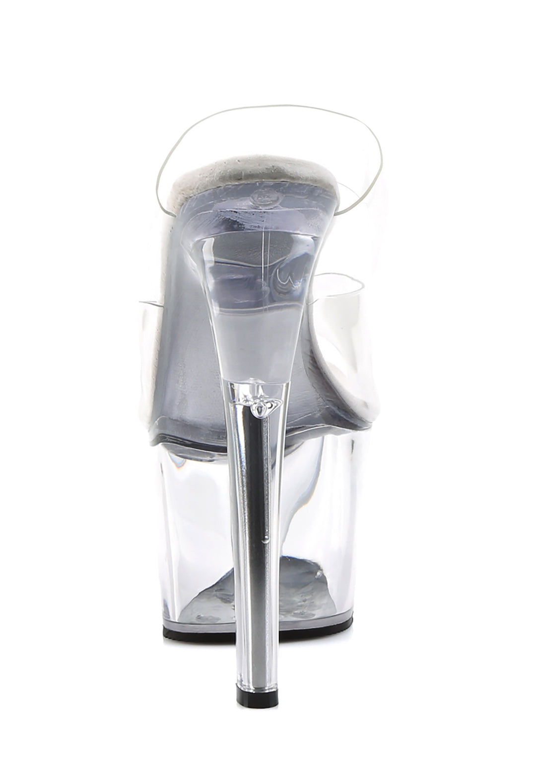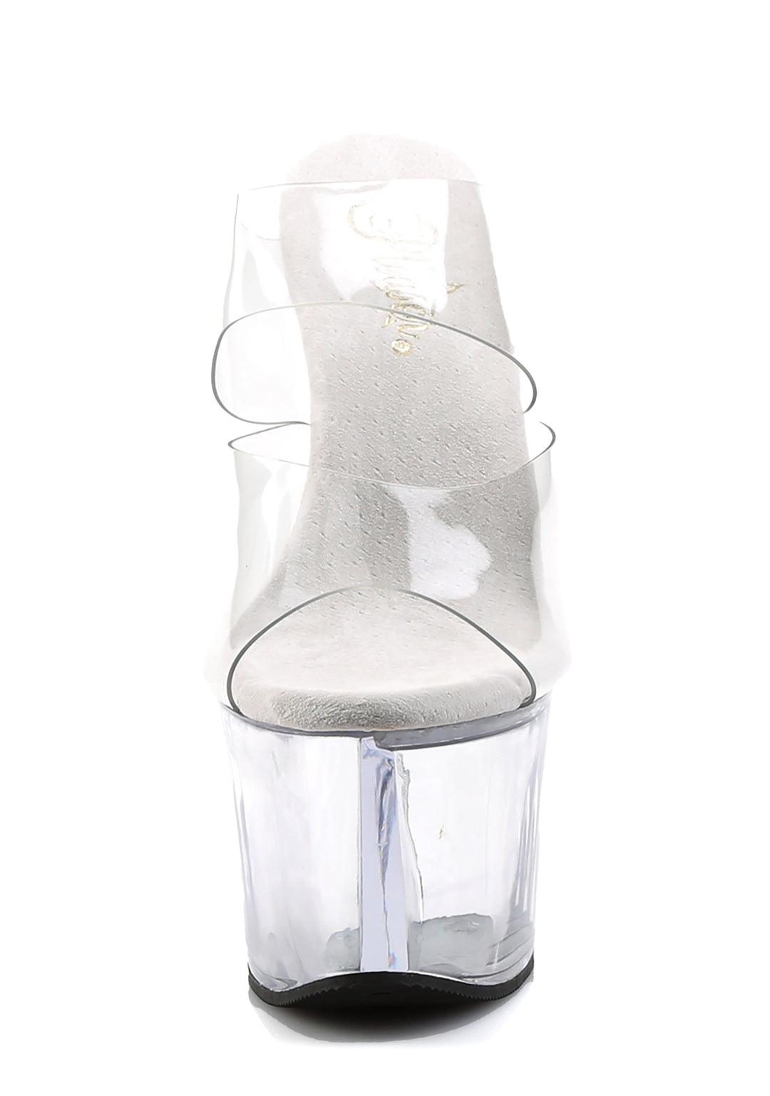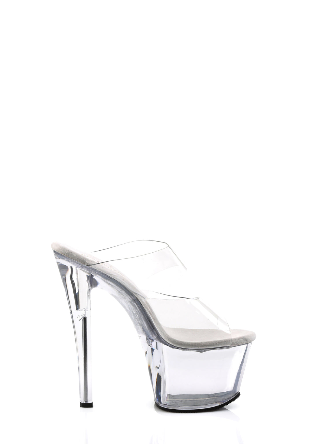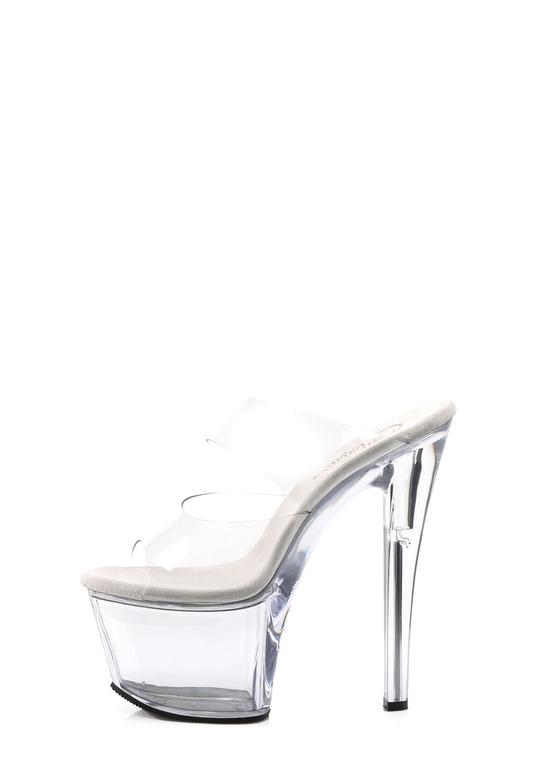 These shoes have a vegan leather construction, clear vinyl two-band uppers, clear platform soles, clear stiletto heels, and a slip on fit.