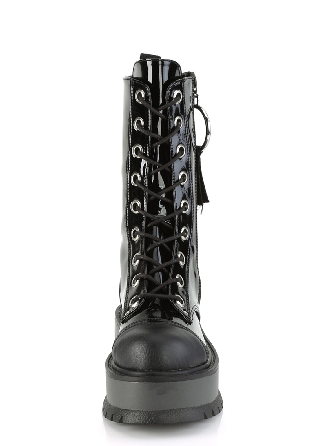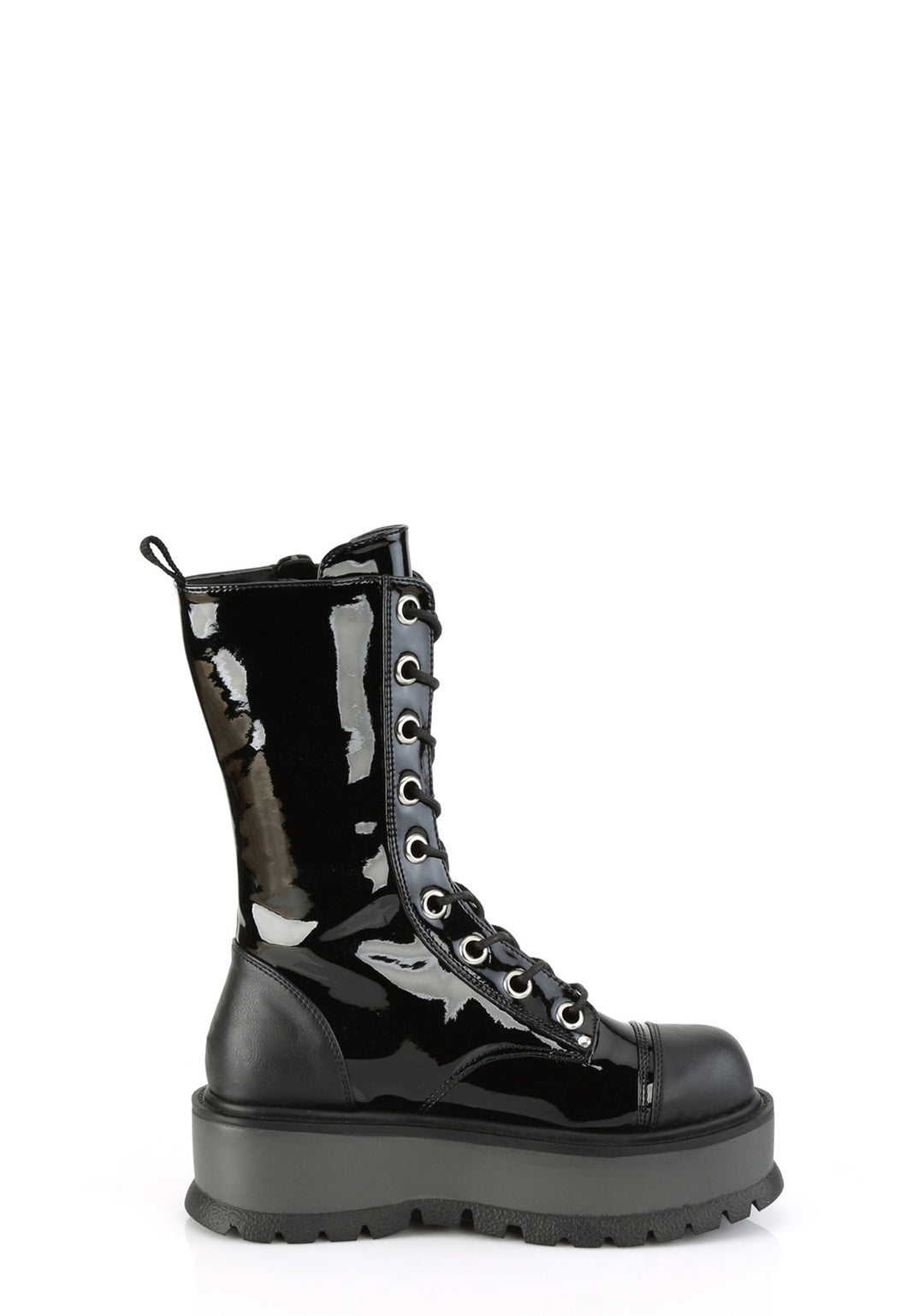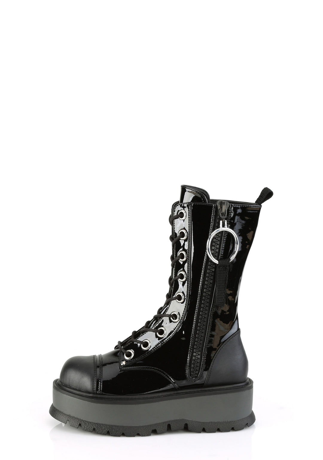 These boots have a vinyl construction, side zippers, and front lace up closures.