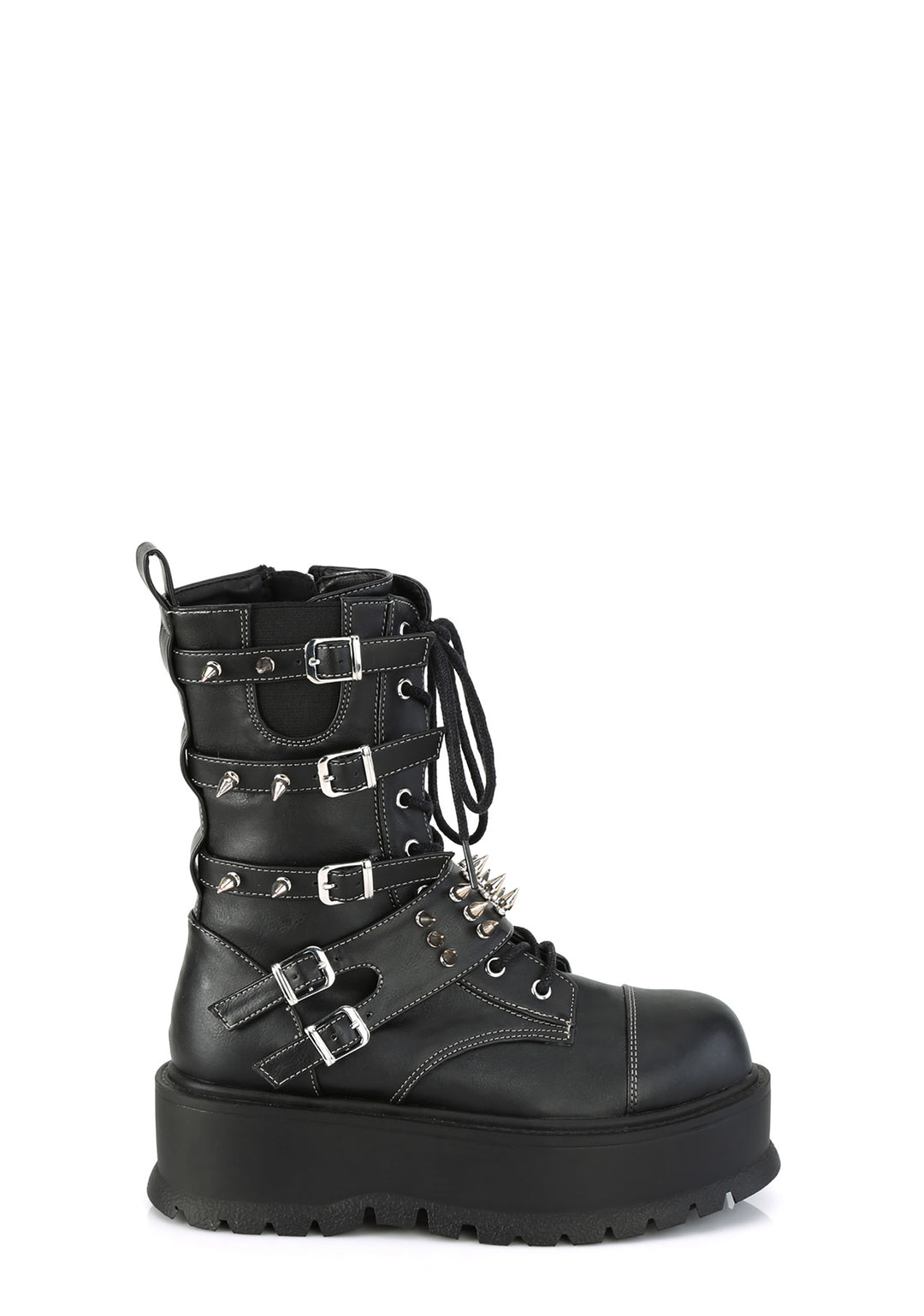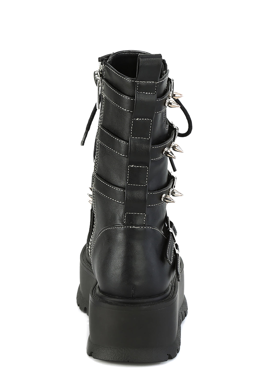 trouble never looked so good. These vegan leather platform boots have sikk spike embellishments, elastic gussets, buckle straps, contrast stitching and lace up fronts.