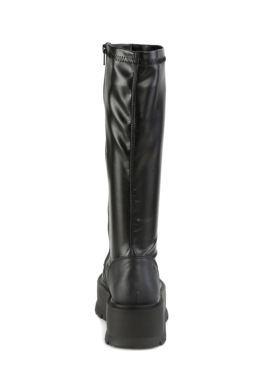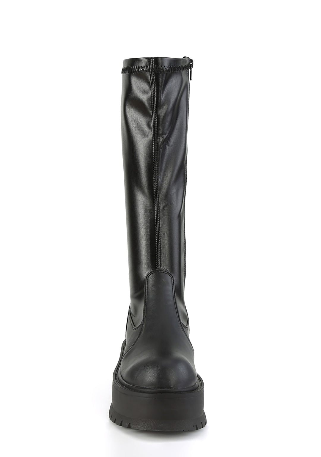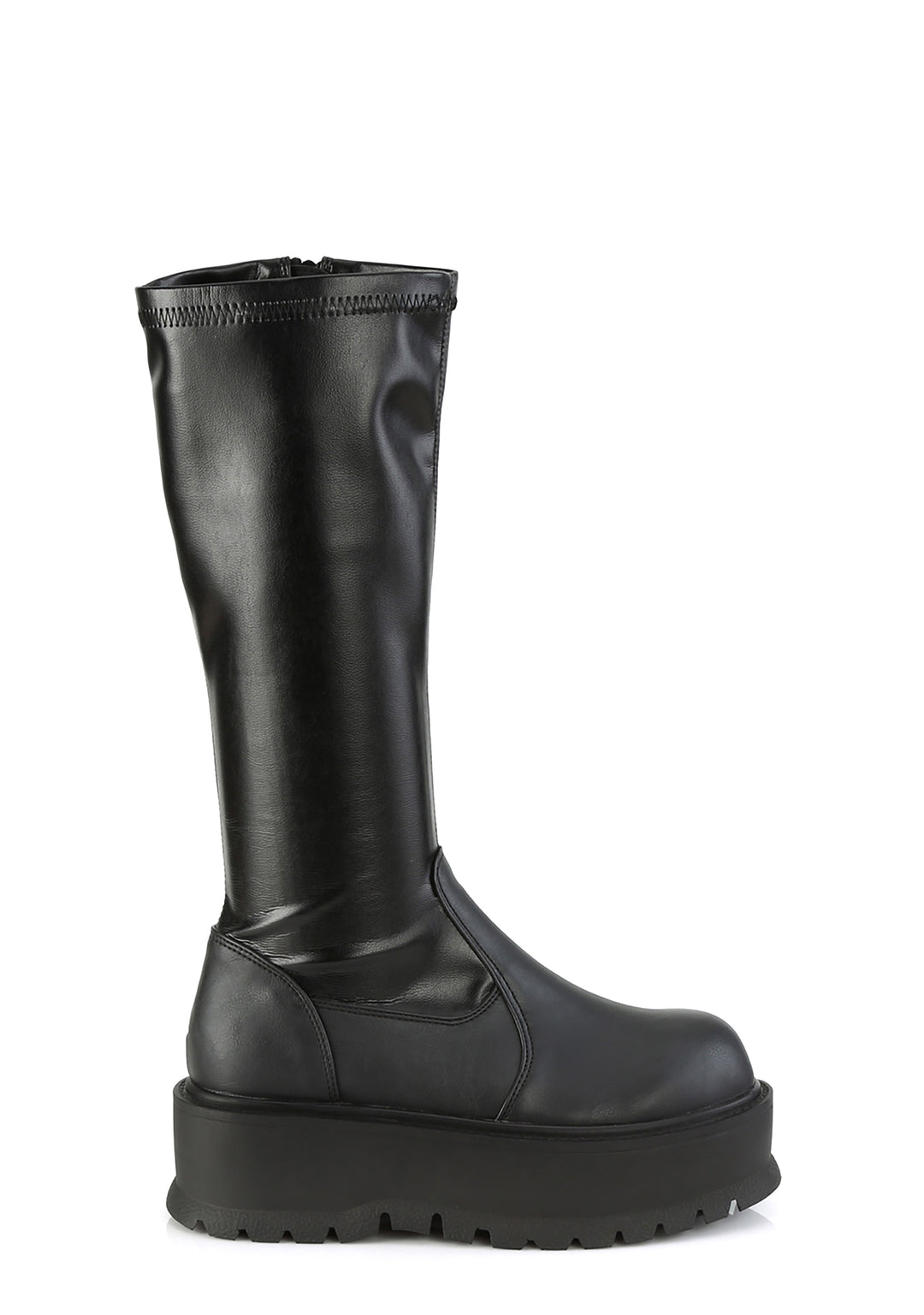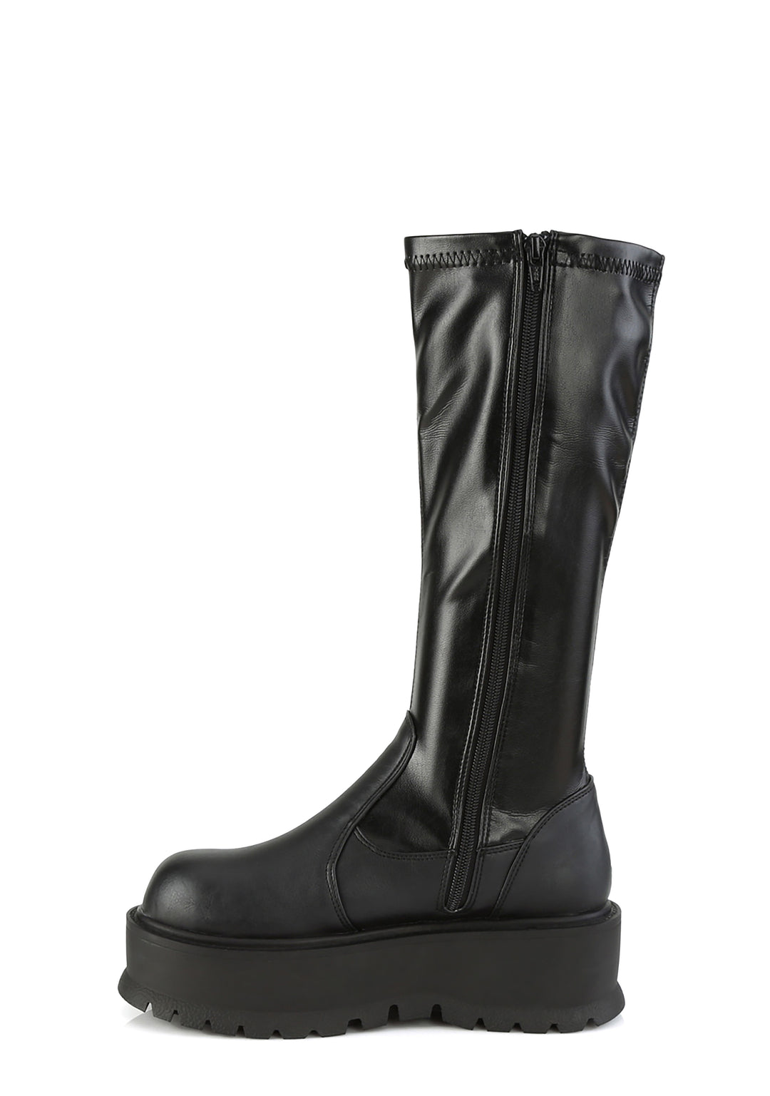 cuz they ain’t cuttin’ to the chase! Get ready to rumble in these knee high boots that have a stretchy vegan leather construction, treaded platform soles, and side zip closures.