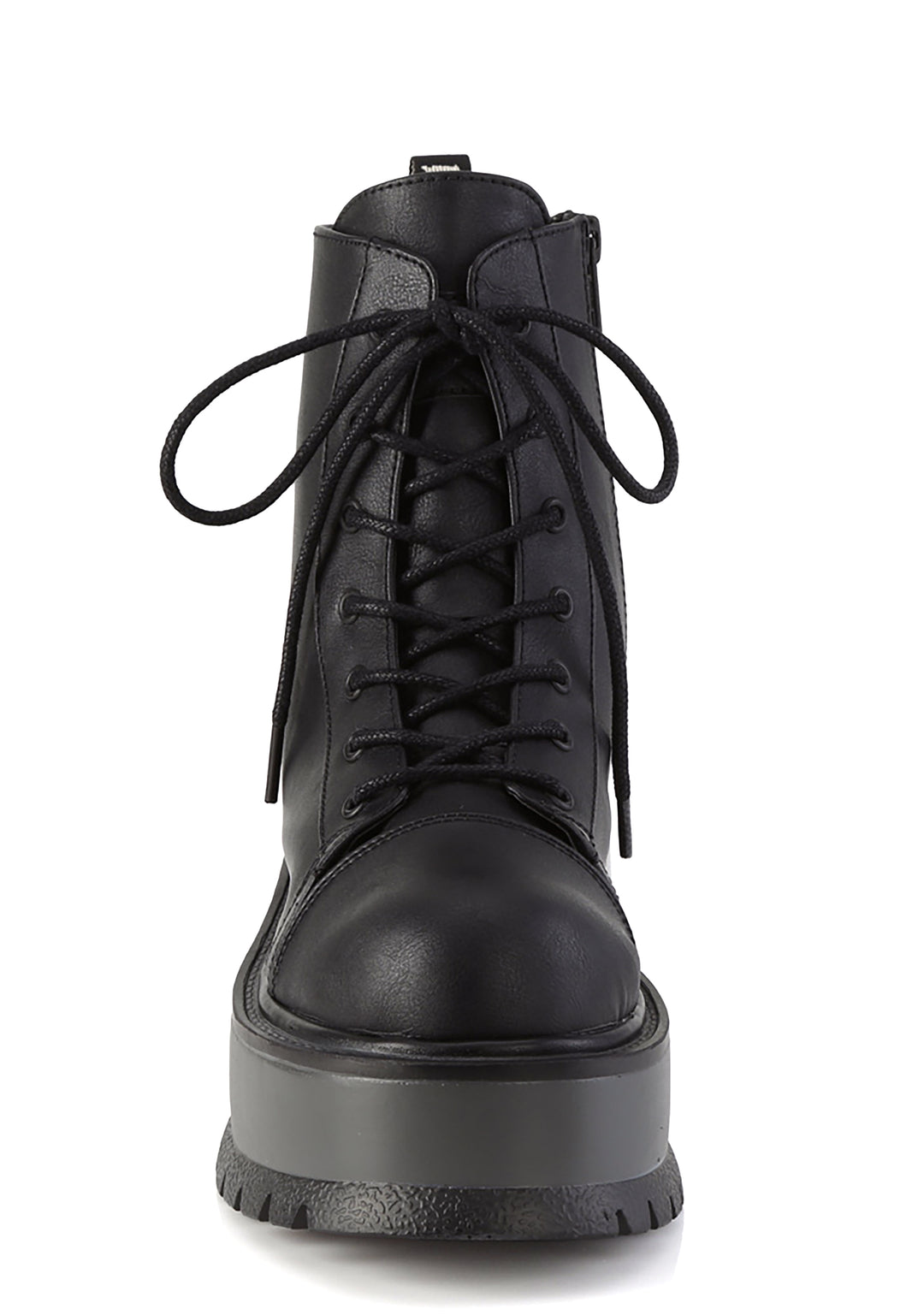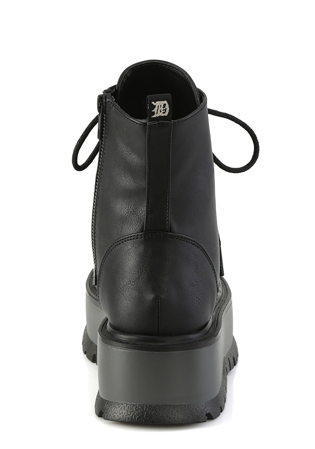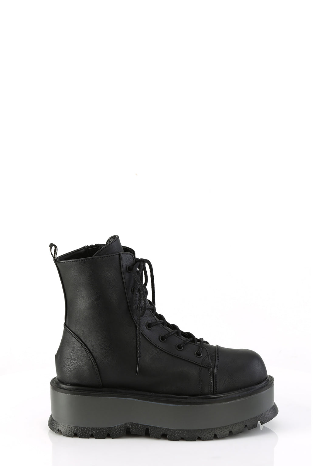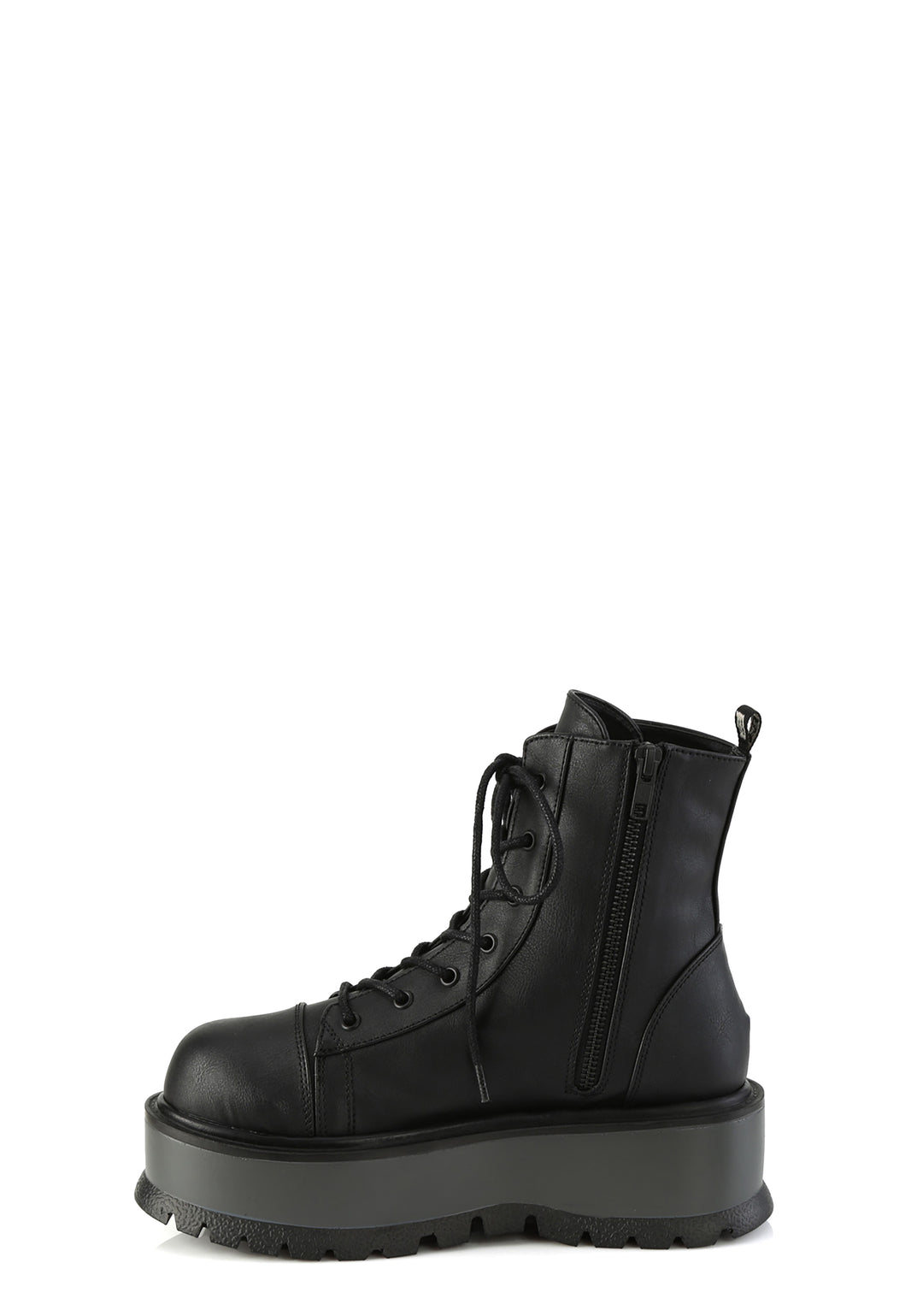 These boots have a vegan leather construction, platform soles, front lace-ups, and side zipper closures.