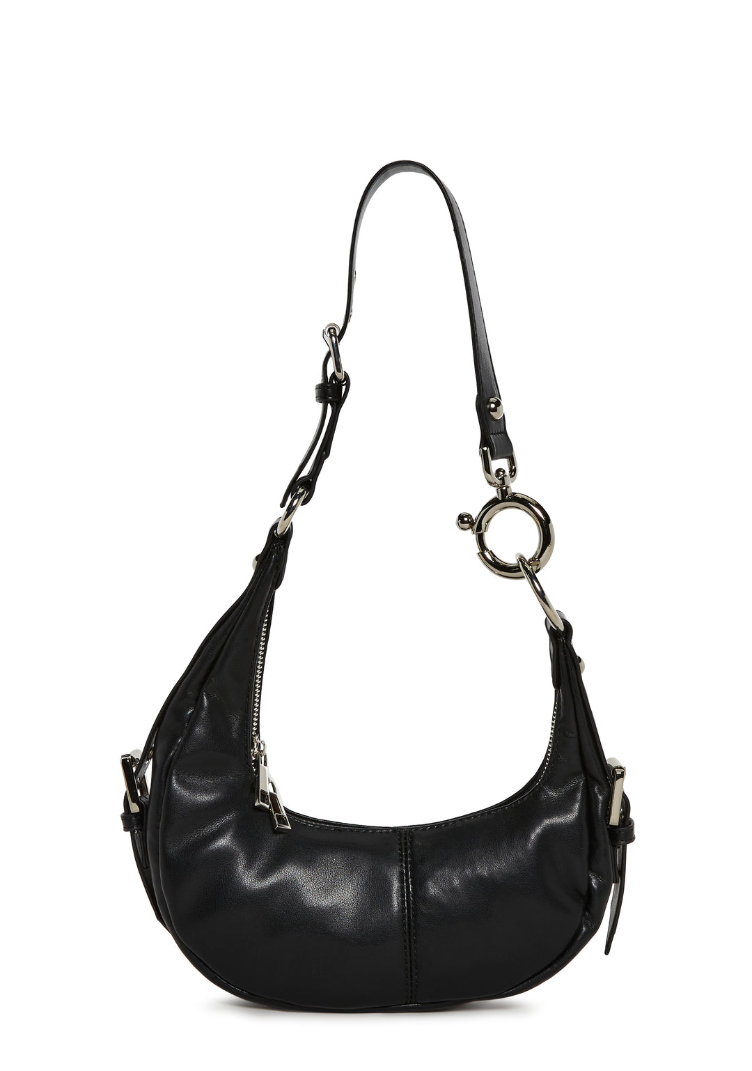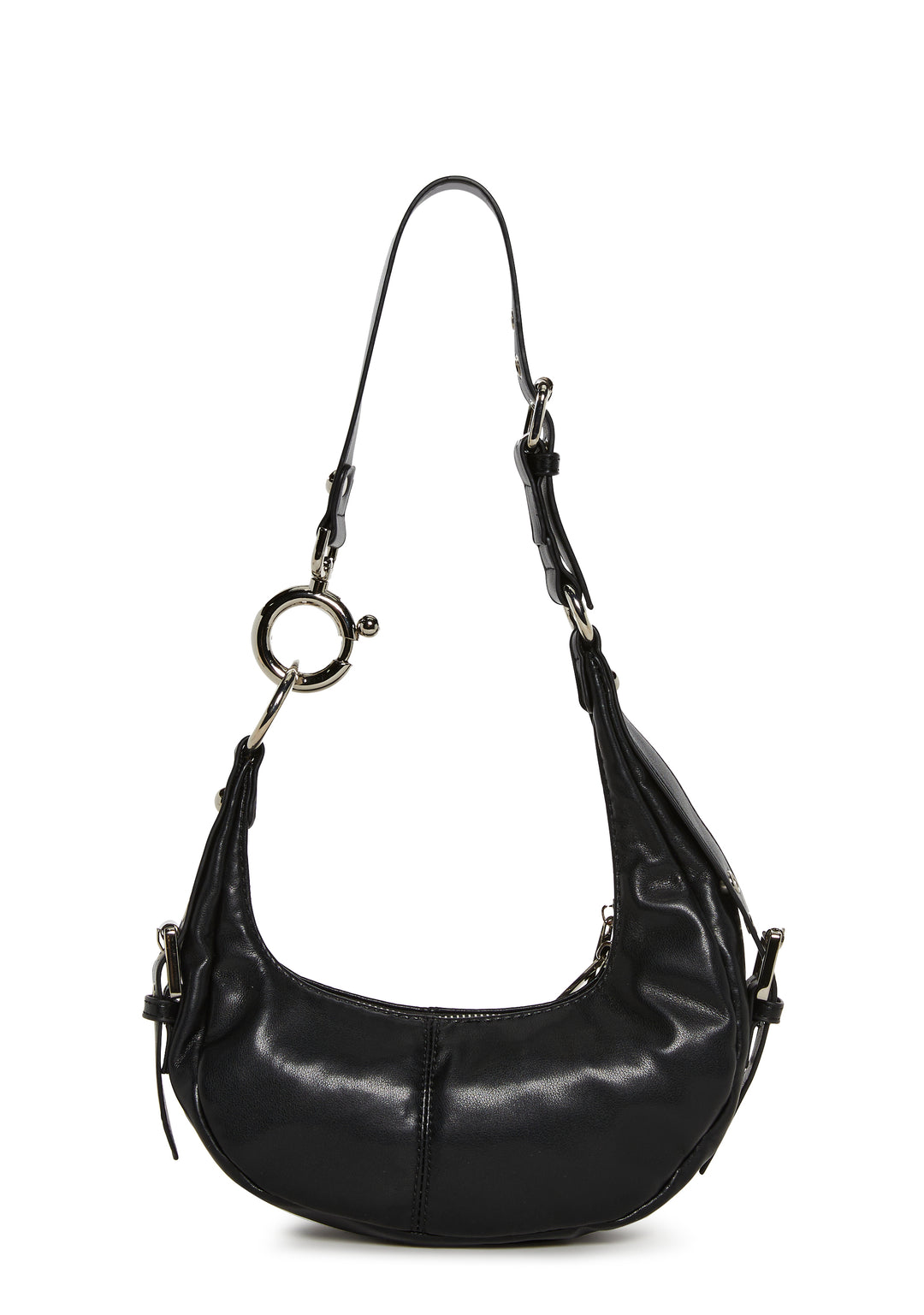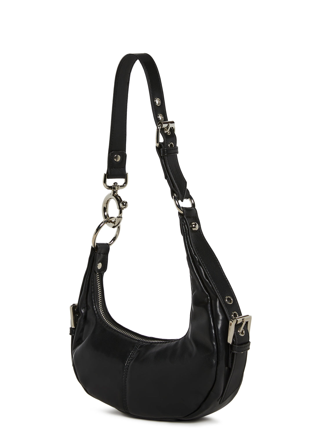 Carry your essentials in style with this sleek shoulder bag, featuring a smooth faux leather finish, a curved silhouette, and polished silver-tone hardware. Designed with a zip-top closure and adjustable strap, it??s the perfect everyday bag with a modern edge.