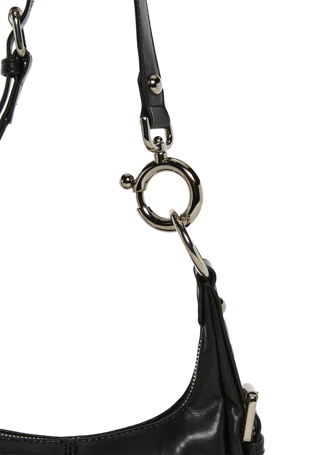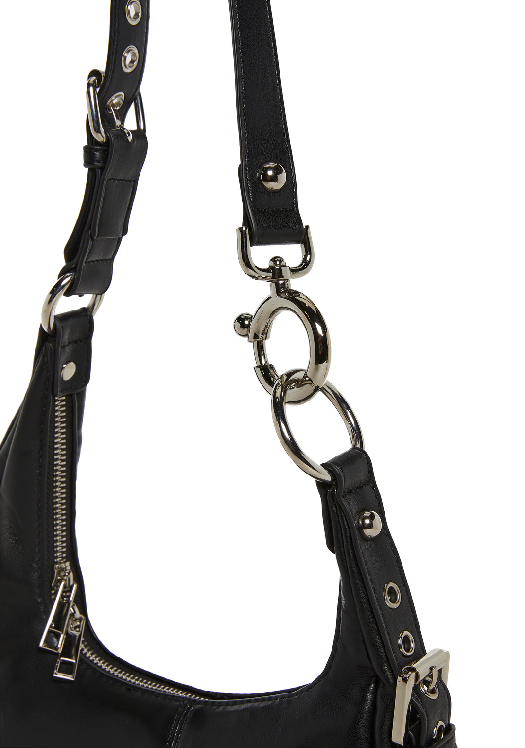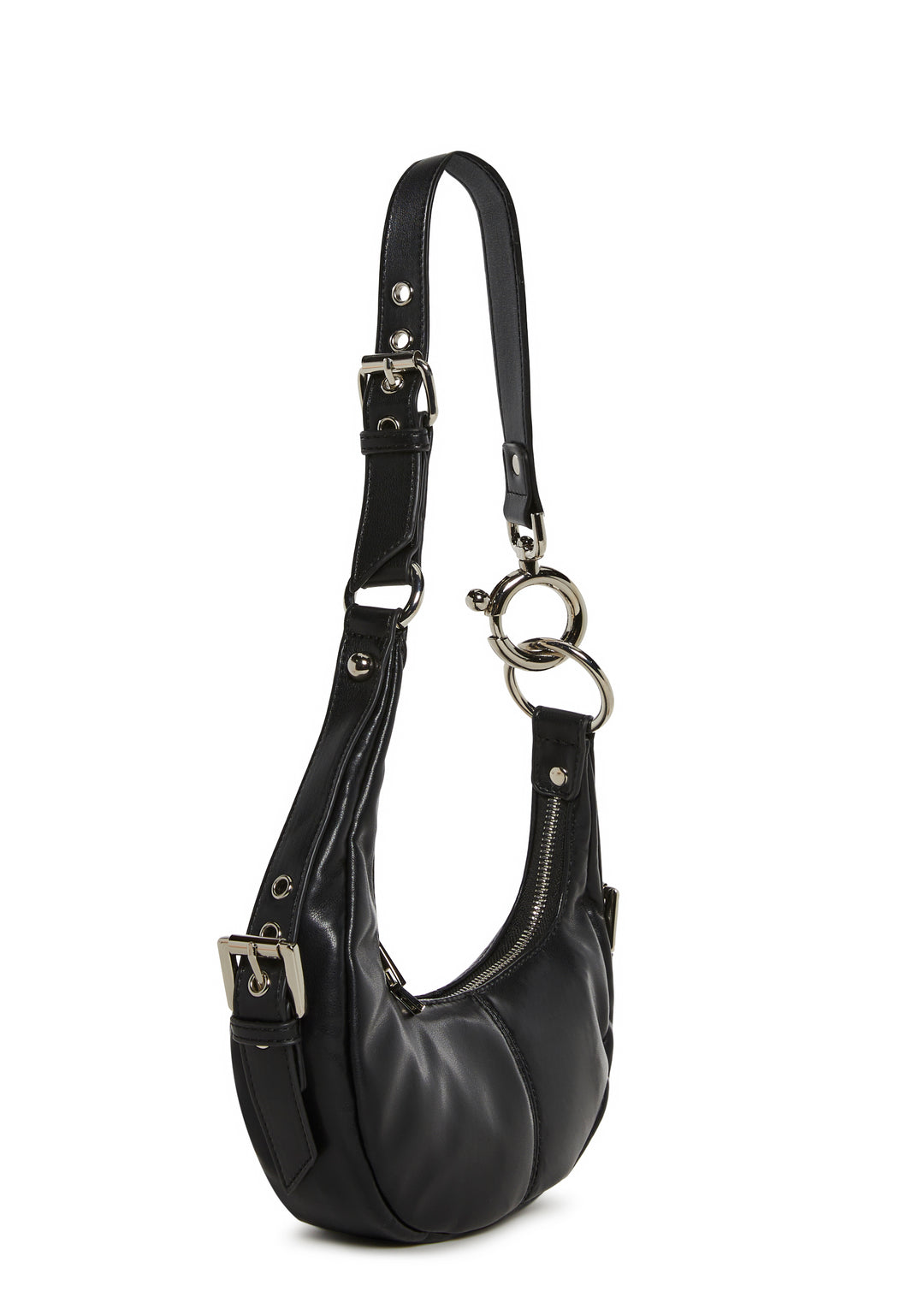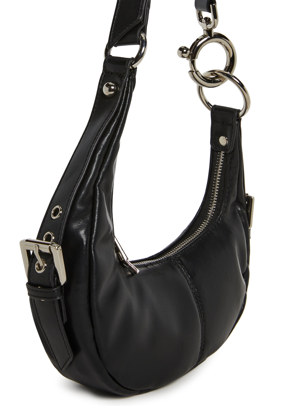 Carry your essentials in style with this sleek shoulder bag, featuring a smooth faux leather finish, a curved silhouette, and polished silver-tone hardware. Designed with a zip-top closure and adjustable strap, it??s the perfect everyday bag with a modern edge.