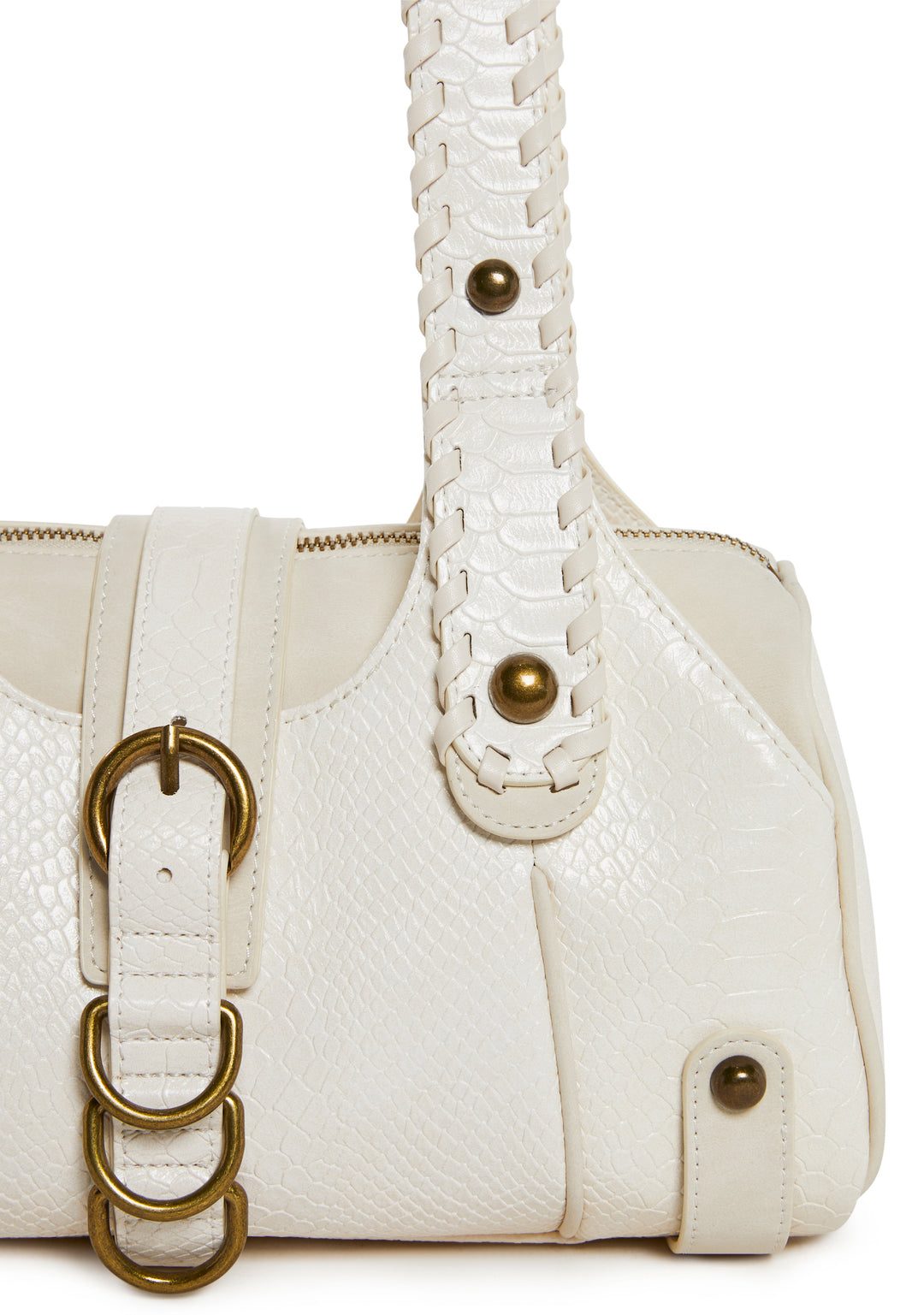This bag has a vegan leather construction, a snake print pattern, whipstich shoulder straps, D-ring hardware, dome studs, and a top zipper closure.