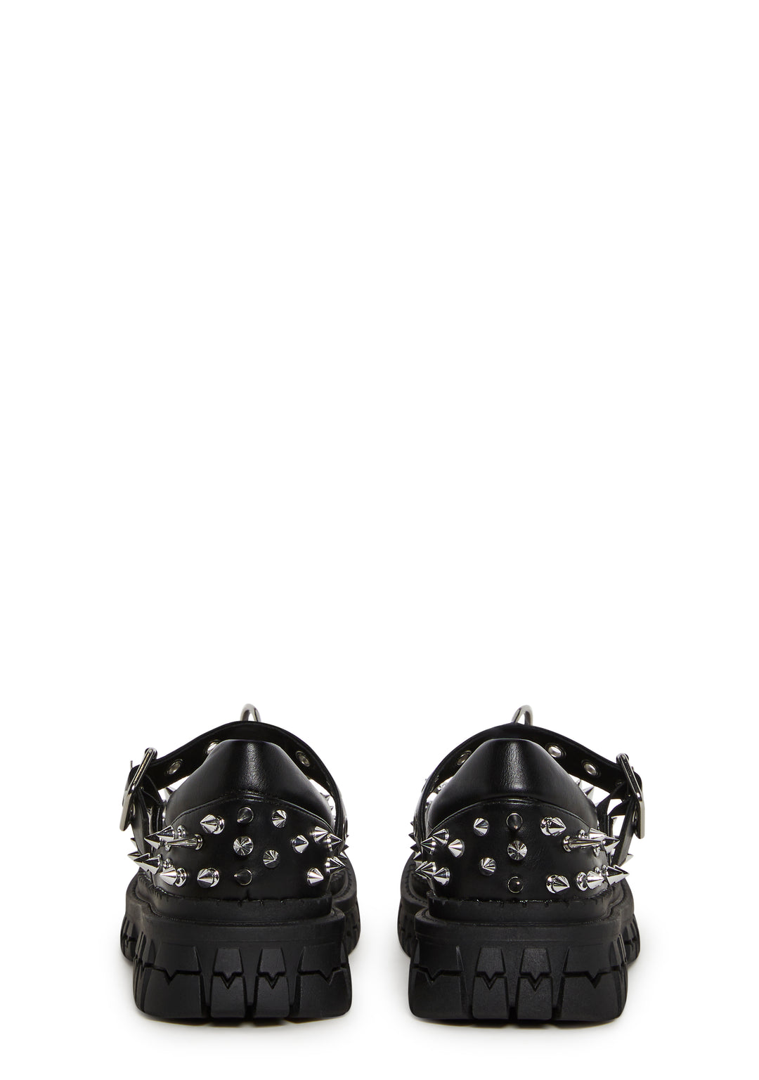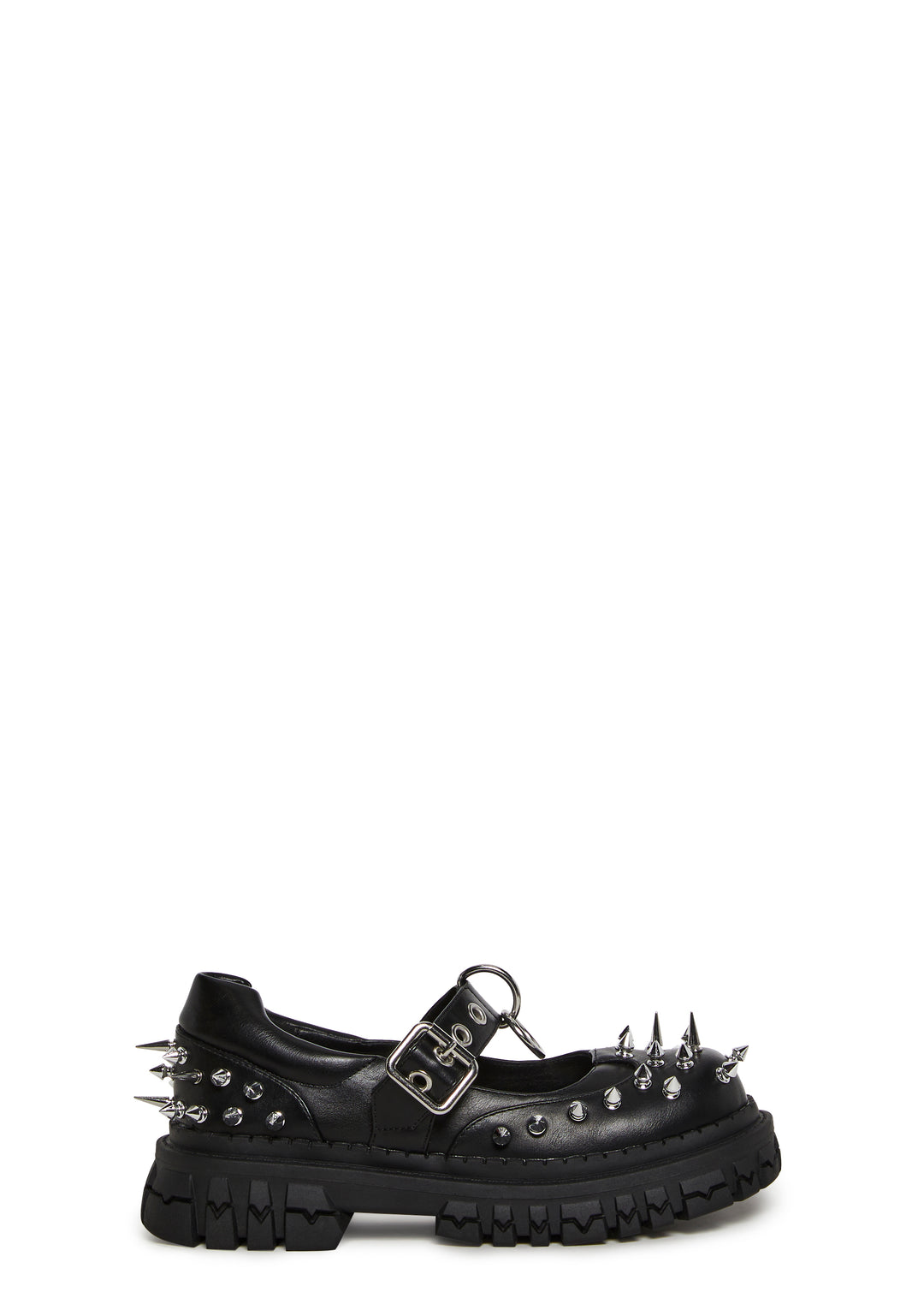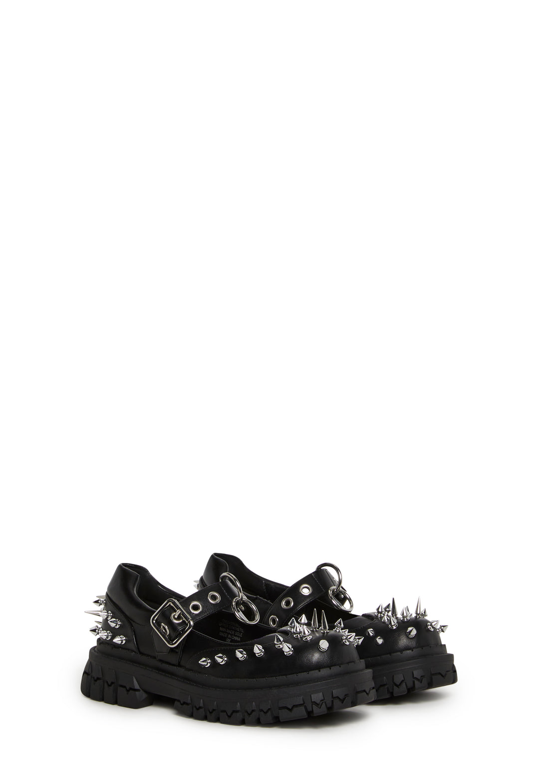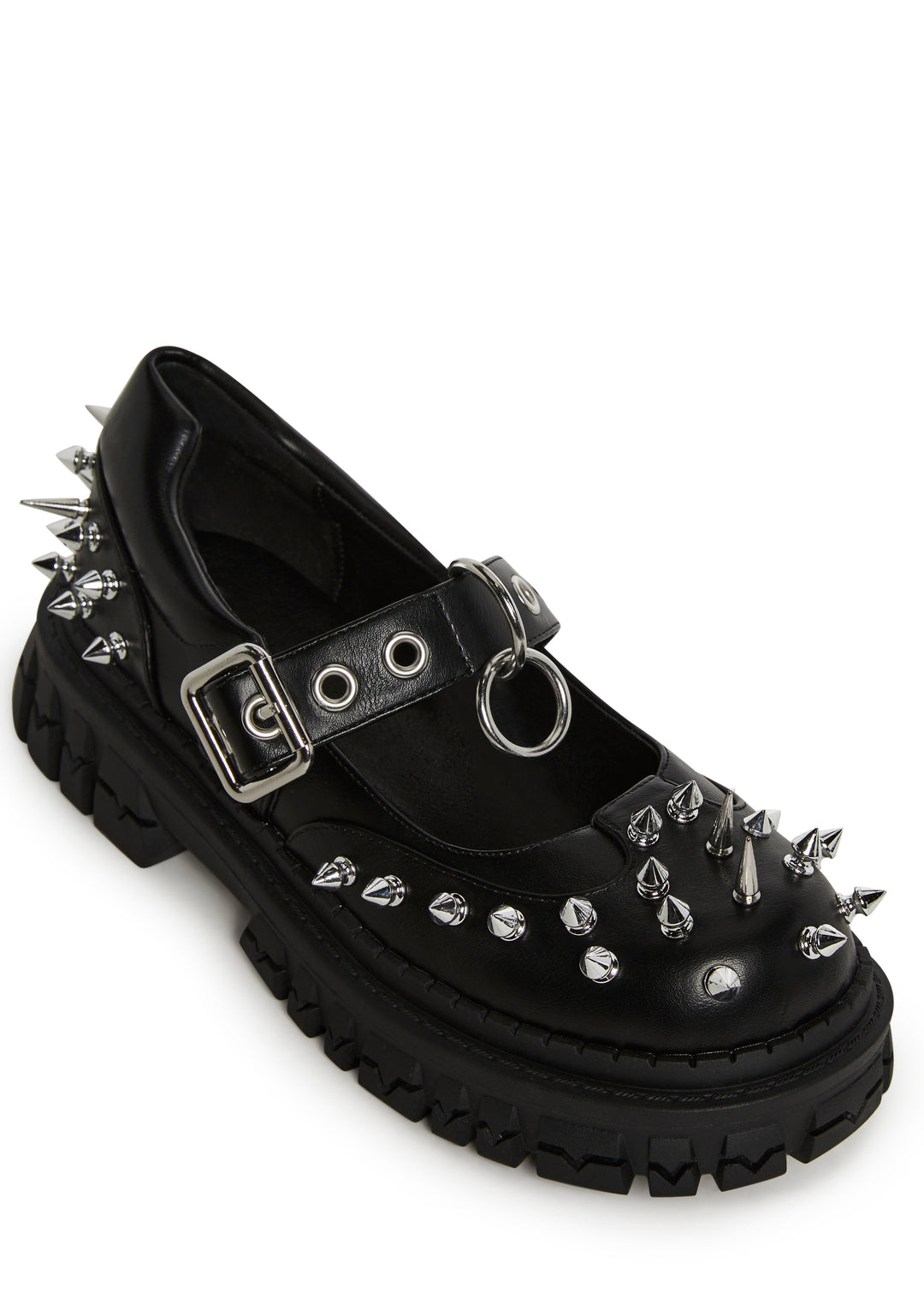 These mary janes have a vegan leather construction, treaded soles, metal spiked details,O-ring hardware, and adjustable ankle buckle closures.