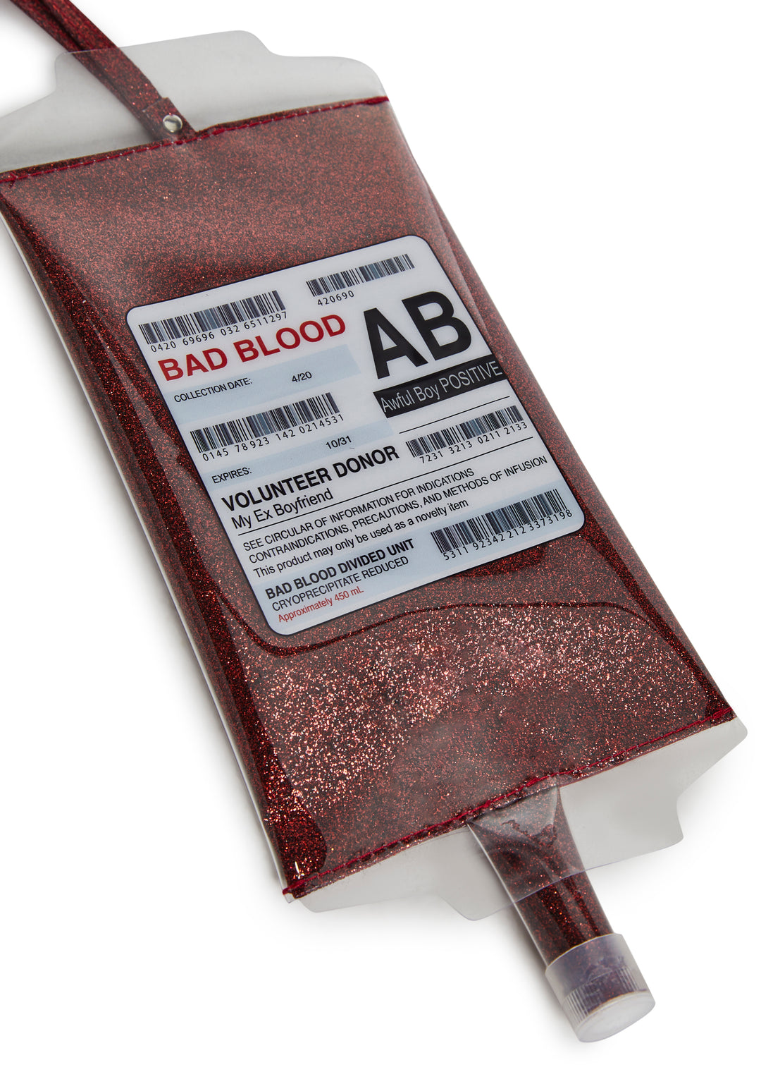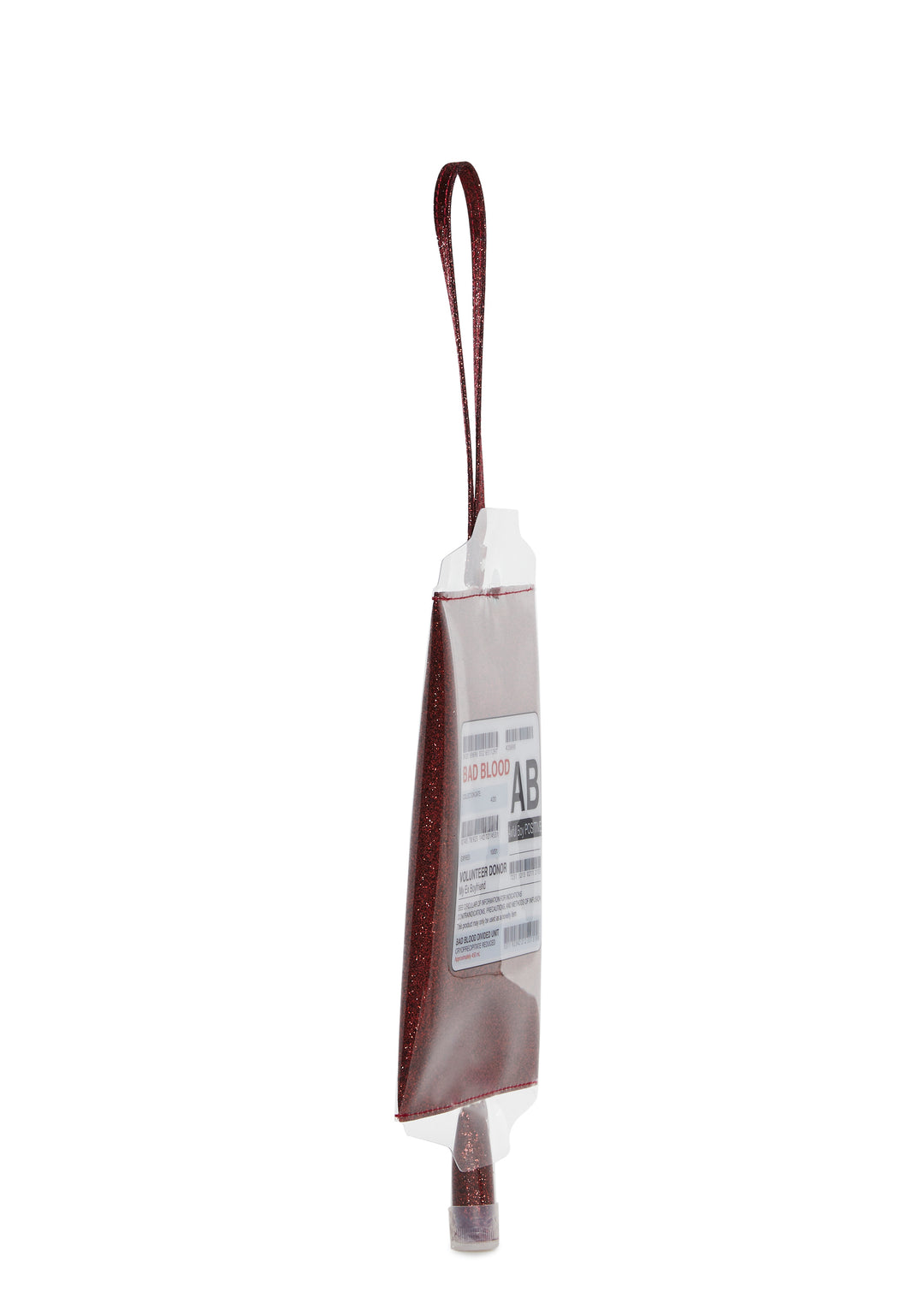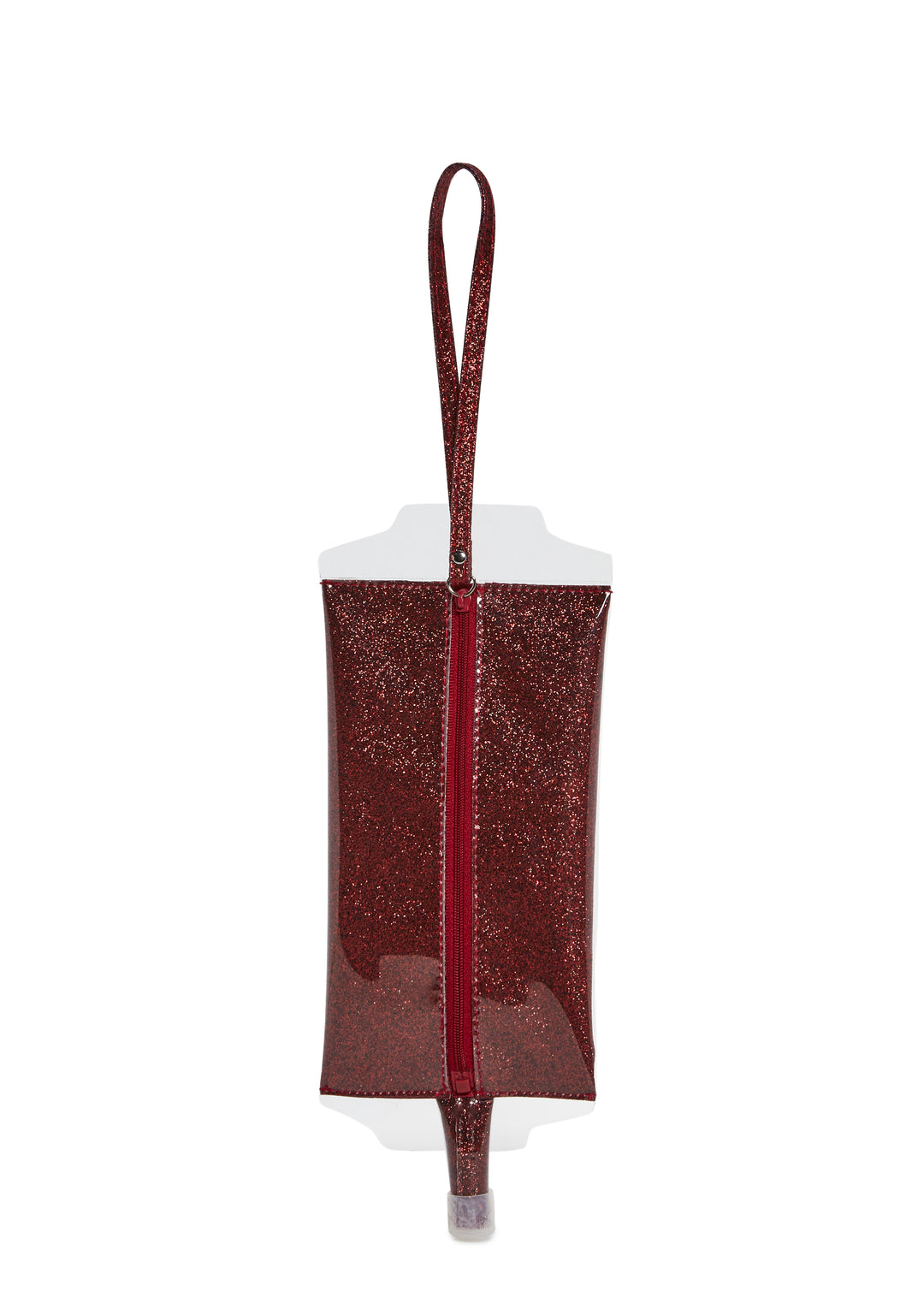 This blood bag shaped wristlet has a vinyl construction, a glitter finish, a back zipper closure, and an attached wrist strap.