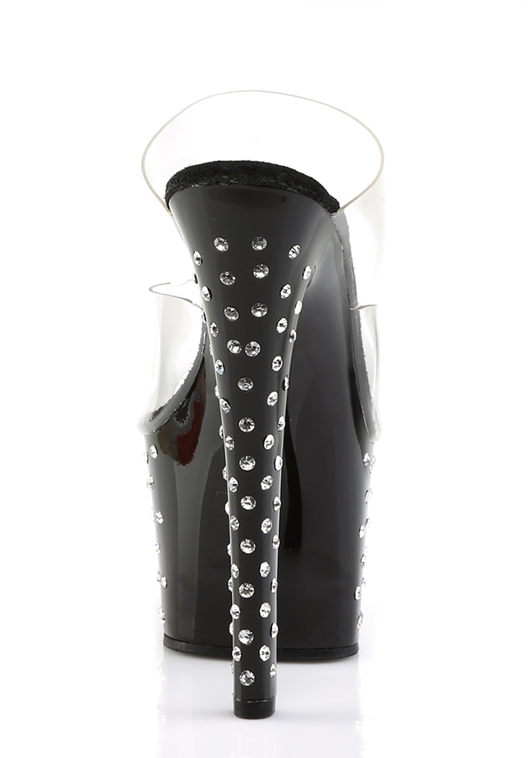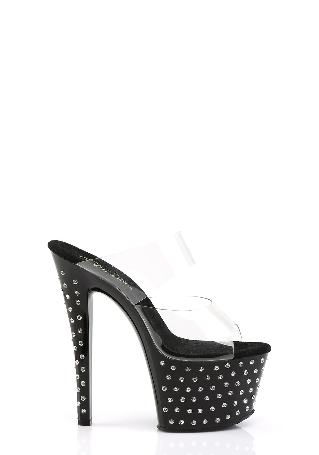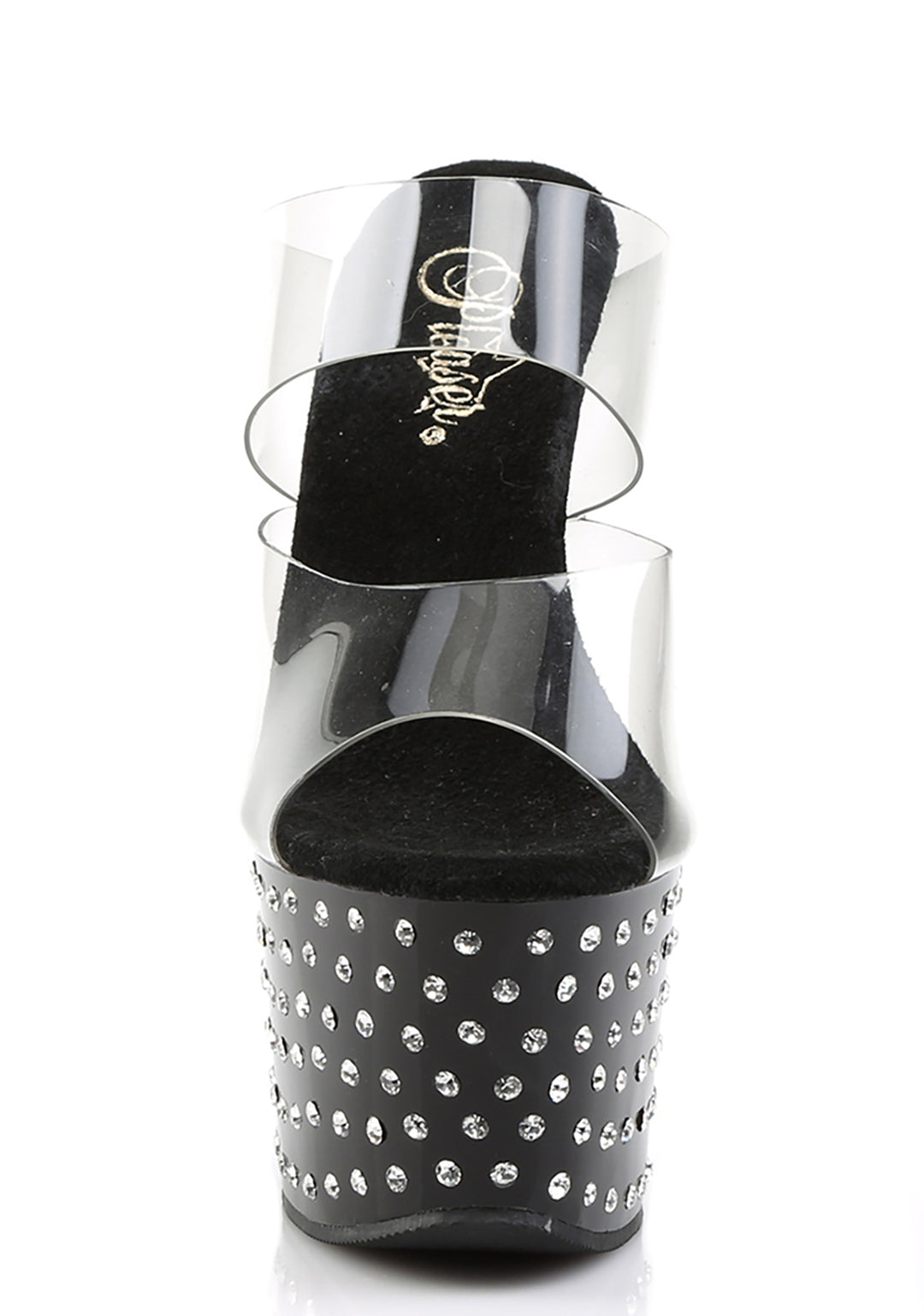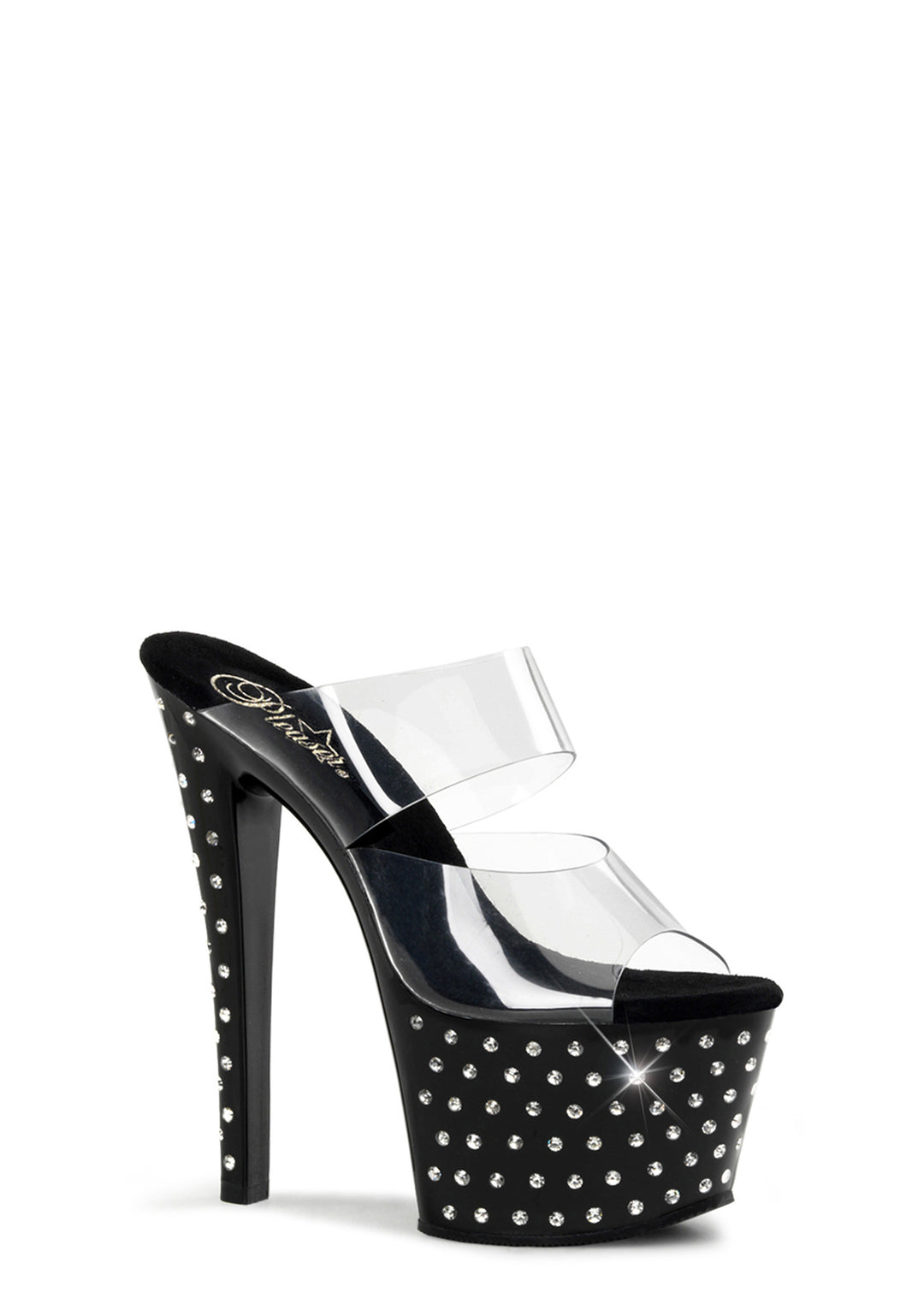 These platform heels have clear double band uppers, rhinestone studded platforms soles and stiletto heels, and a slip on fit.