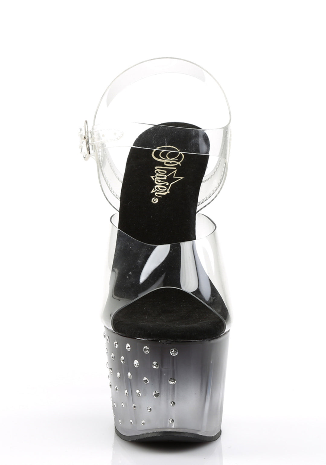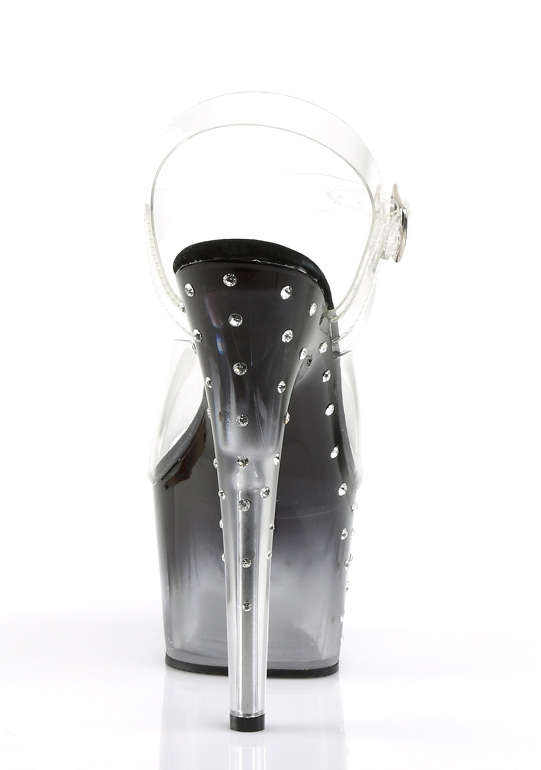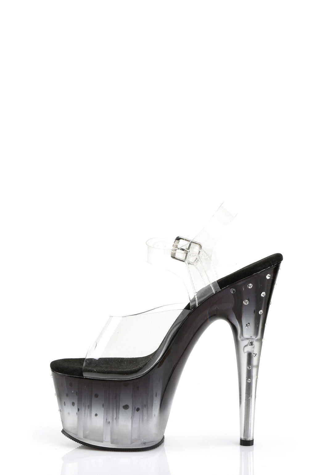 These platform sandals have clear vinyl uppers with a peep toe design, ombre tinted platform soles and heels adorned with sparkling rhinestones, and adjustable ankle buckle strap closures