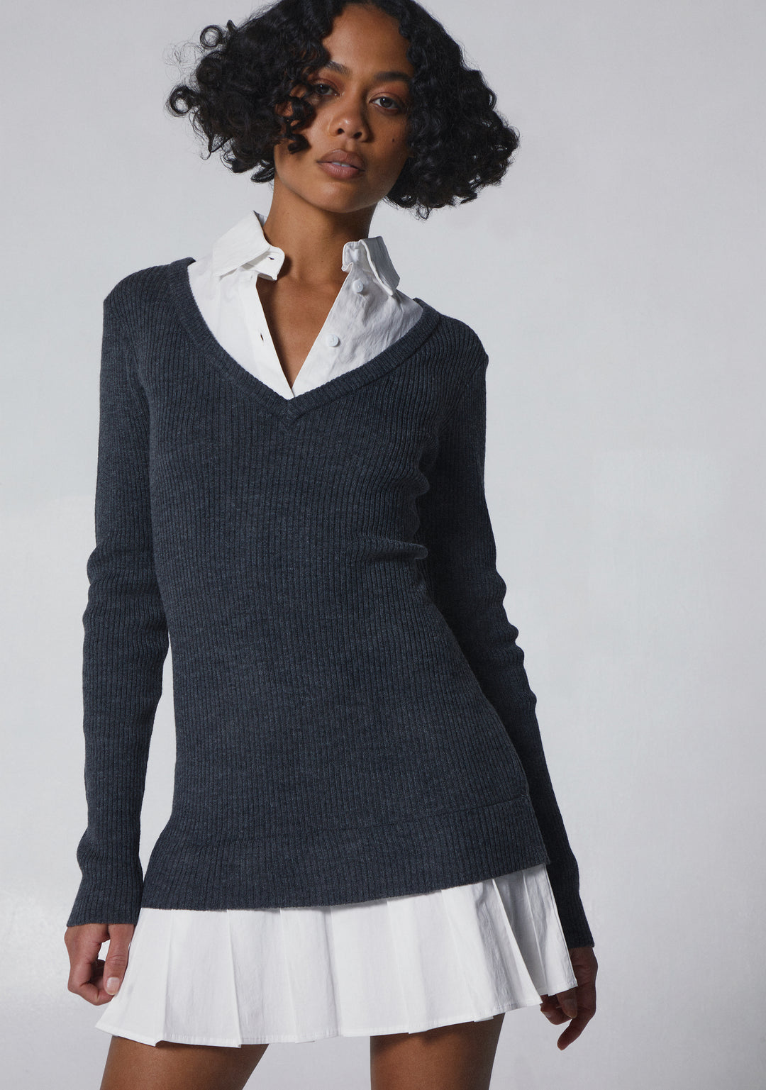 Own that intelligence with this mini dress that has a stretchy ribbed knit construction with a cotton collar and skirt, a pleated design, a v-neckline, long sleeves, and front button closures.
