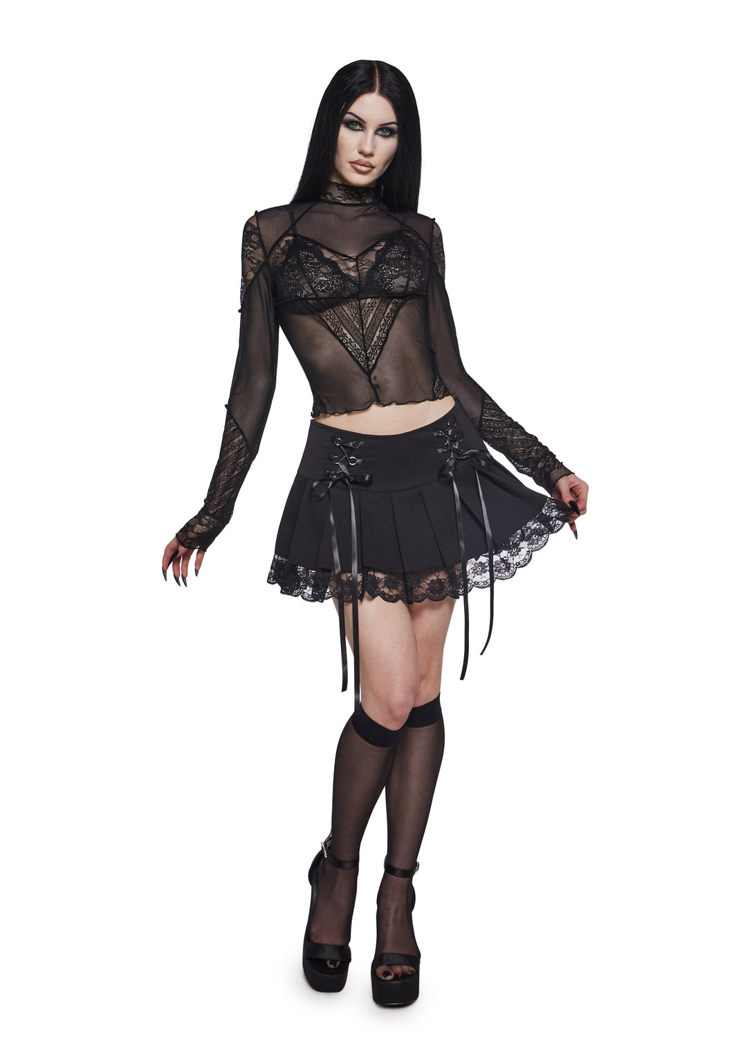This top has a sheer stretchy mesh and floral lace construction with long sleeves, a mock neck, a paneled design with exposed seams, and lettuce trim detailing.