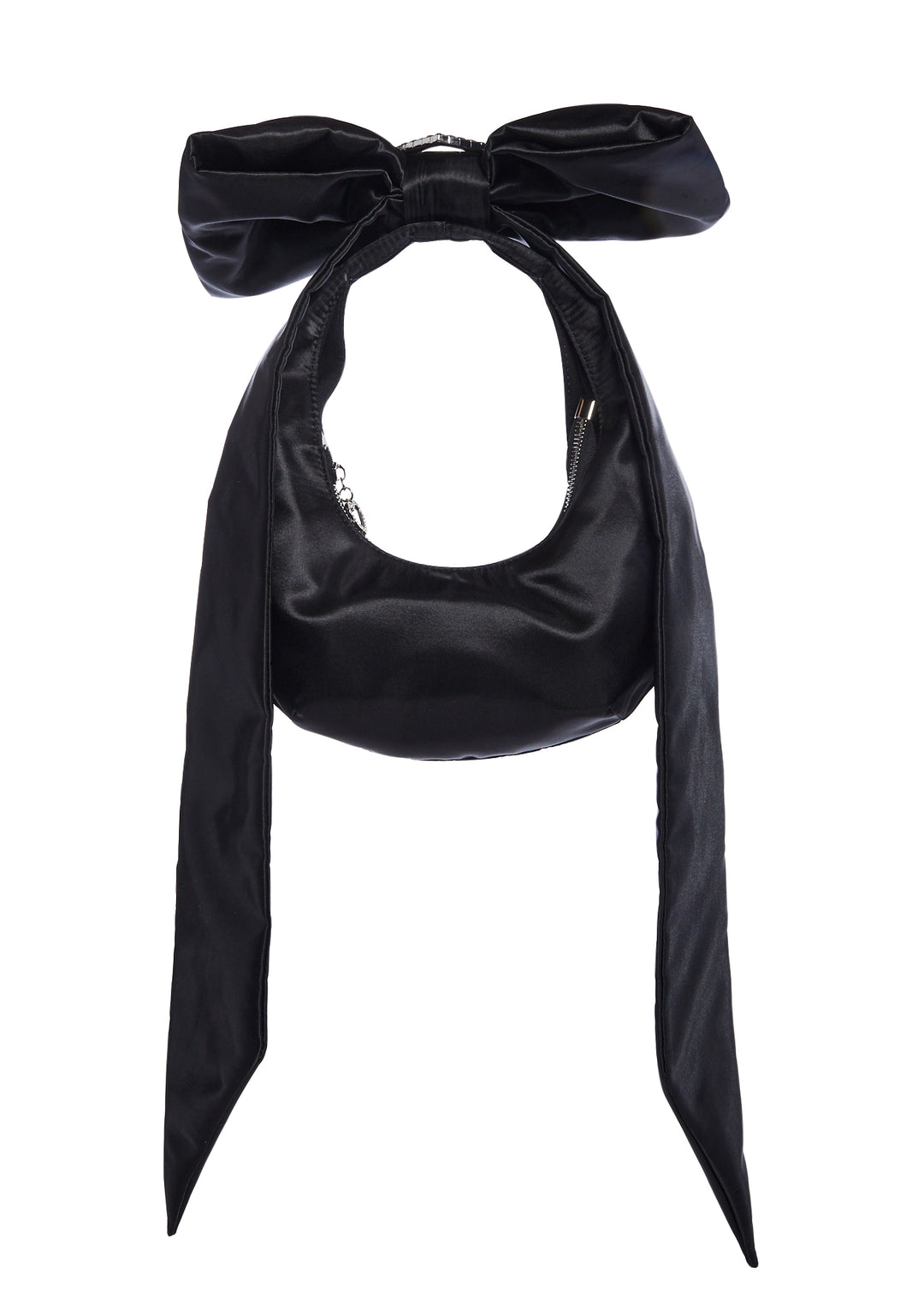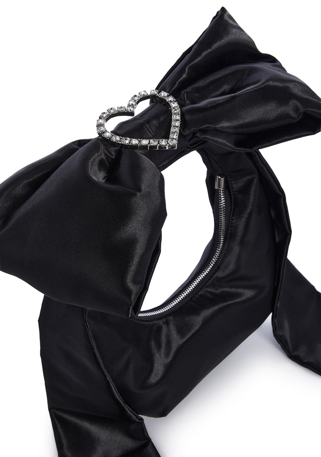 cuz everyone wants to be you. This bag has a satin construction, a ribbon handle with rhinestones, a centered heart adornment, and top zipper closure.