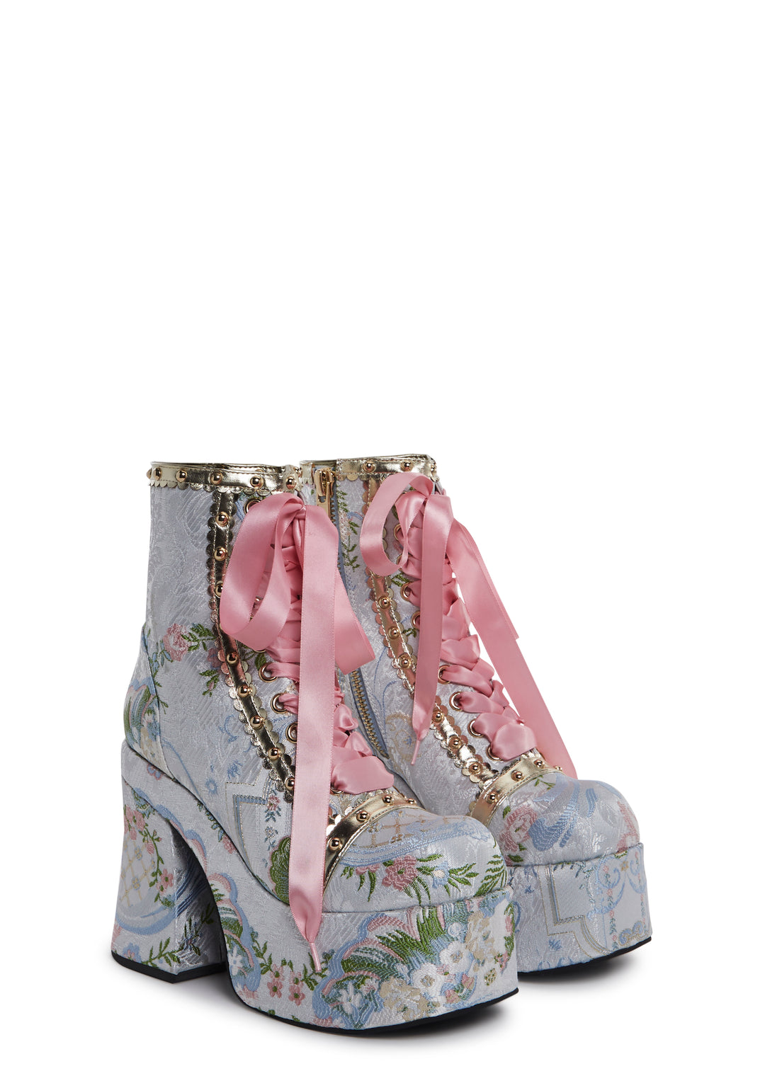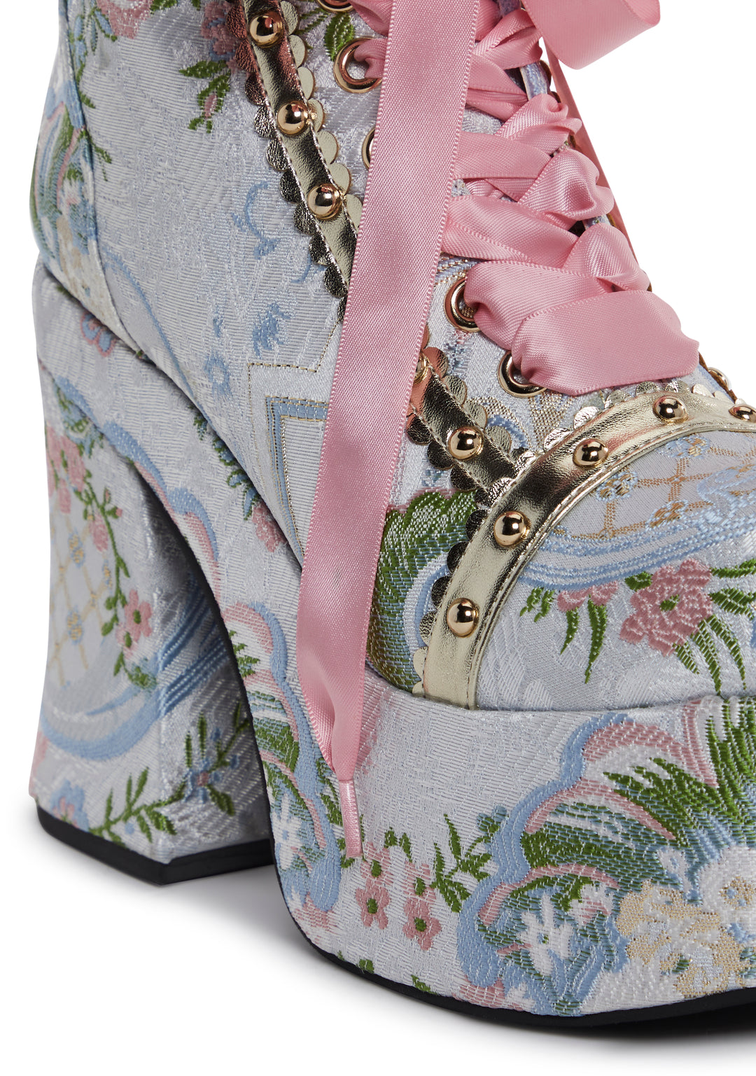 cuz you slay the land. Strut in these floral brocade platform boots with rounded heels, ribbon lace-up detailing and side zipper closures.